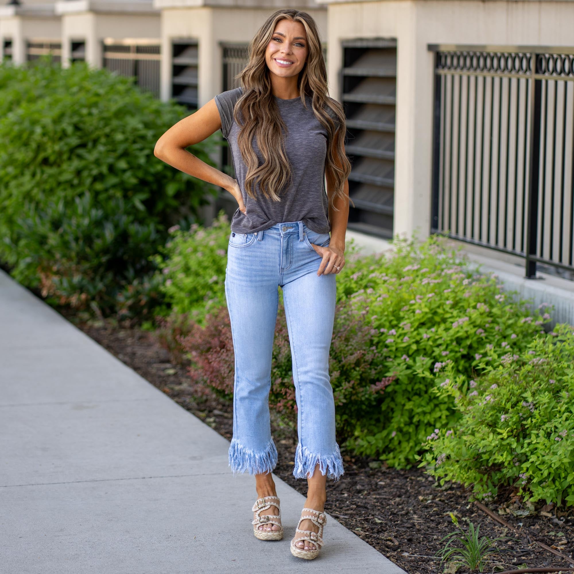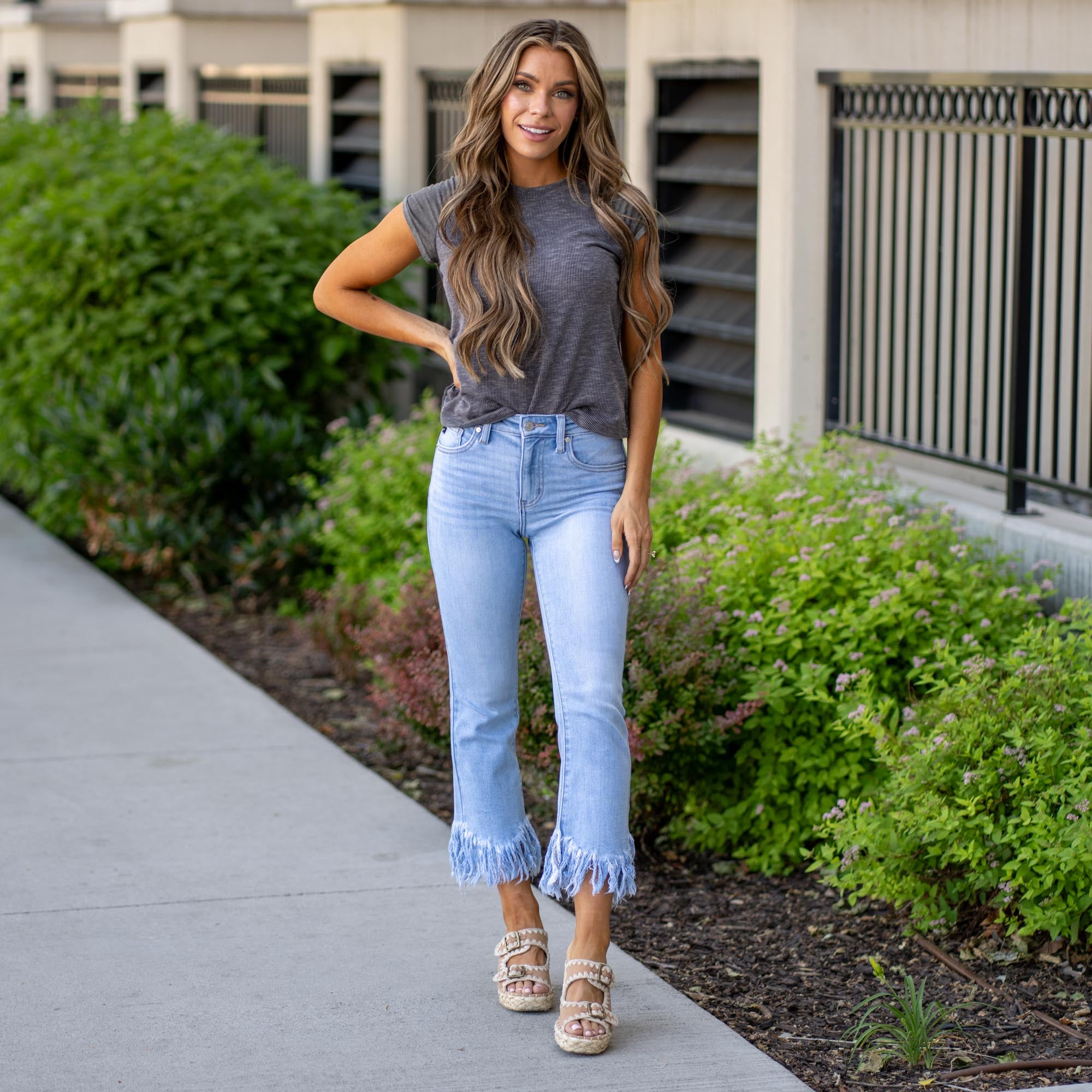 The Arla High Rise Bootcut Jeans offer a fresh take on a timeless silhouette. Sitting just above the waist, this flattering fit tapers through the thigh and flares at the calf for a cropped bootcut look. A softly faded wash with subtle whiskering gives them a lived-in finish, while the no-stretch frayed fringe hem adds a touch of raw, effortless style. Crafted from soft stretch denim for all-day comfort and shape retention, and finished with a five-pocket design, zip fly, and single-button closure—these jeans are made to move with you.