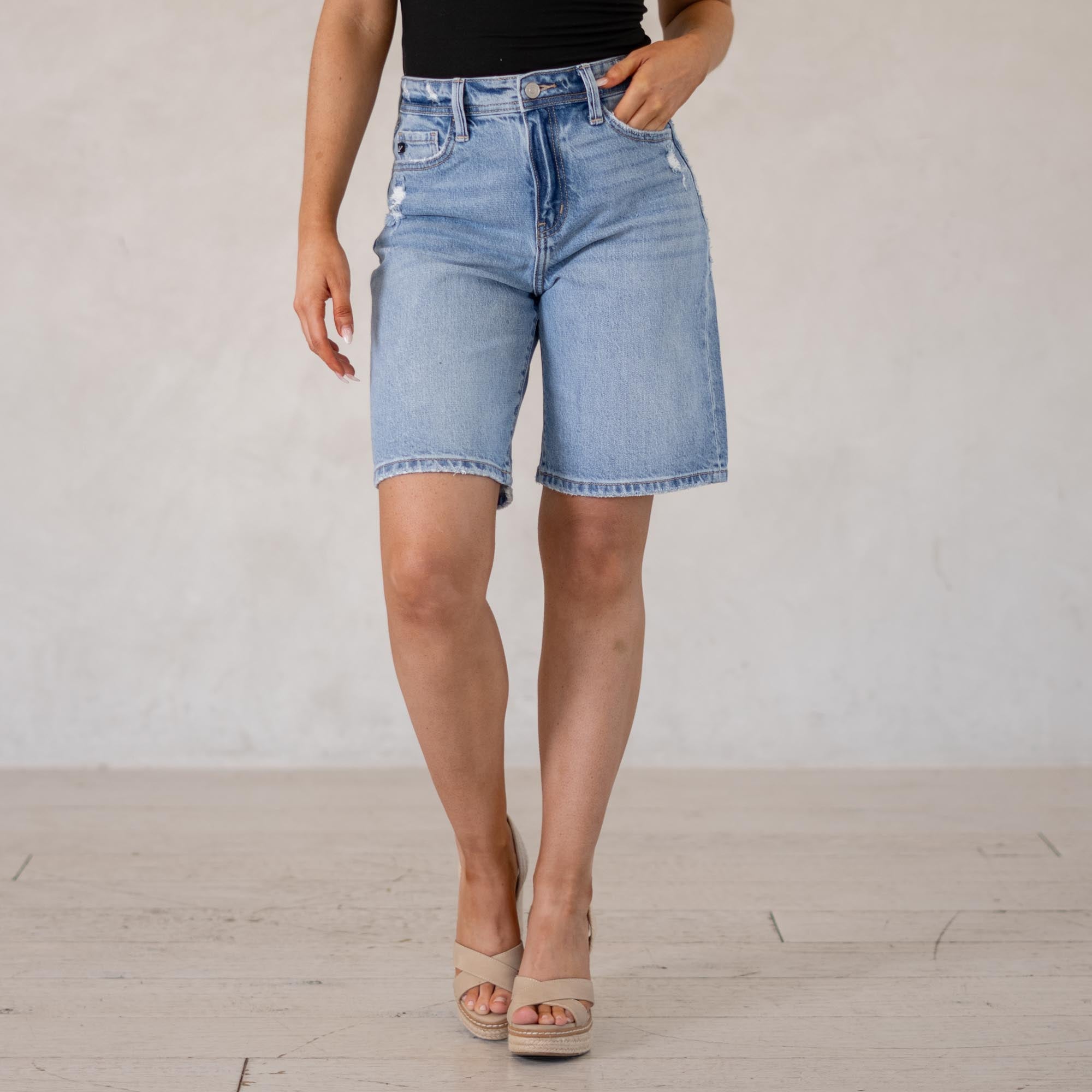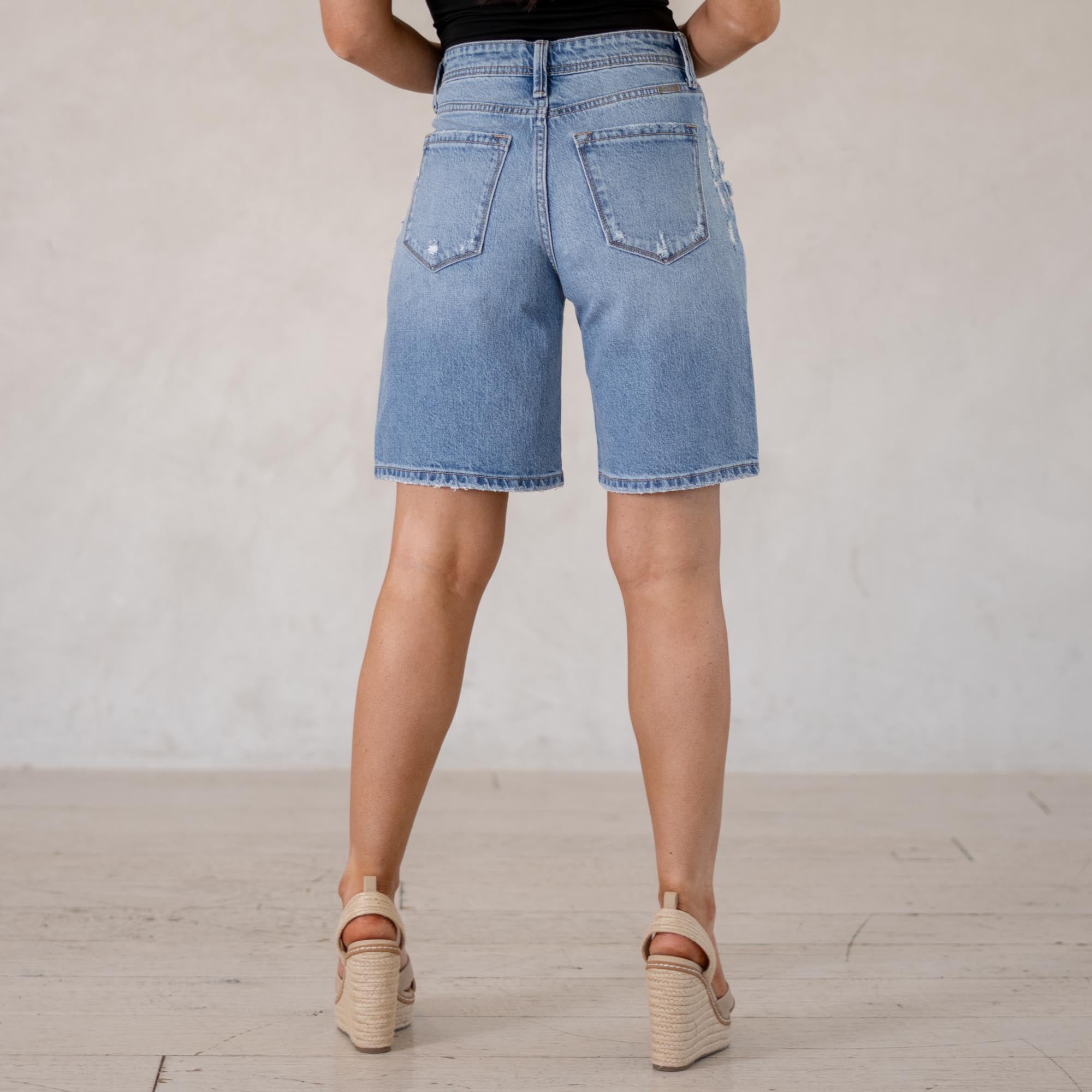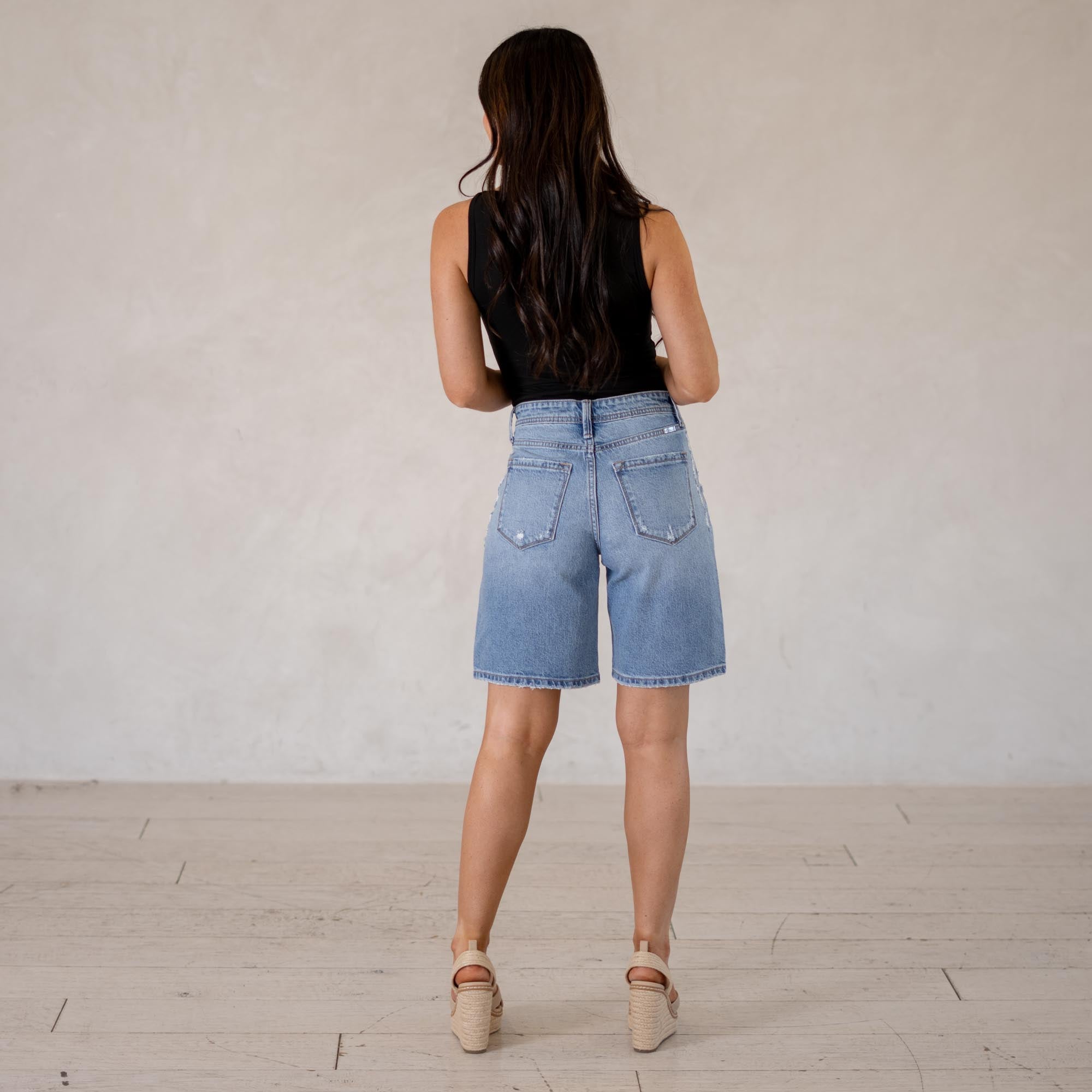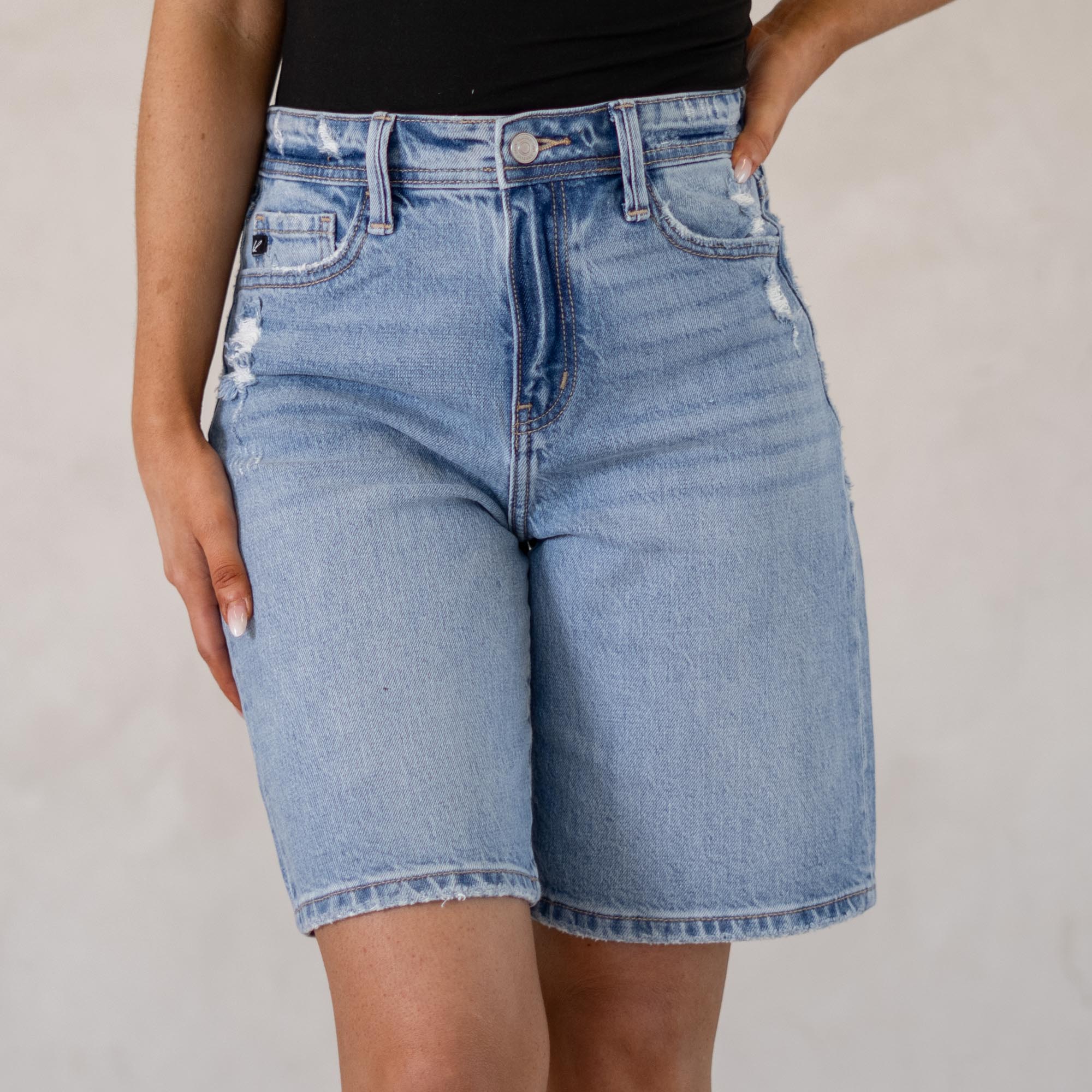 A laid-back essential, the Annie Low Slung Baggy Shorts bring effortless cool to your denim lineup. Designed to sit low on the waist, this style creates that relaxed, baggy silhouette that’s perfect for easy everyday wear. Finished in a classic medium wash, they deliver that timeless denim look you can pair with anything. Made with comfort denim that holds its shape while still molding to your body, these shorts feel just as good as they look. Distressed details along the waistband, front pockets, and hem add the perfect touch of edge.