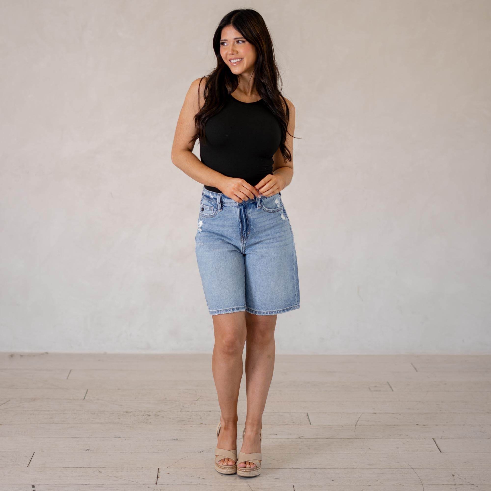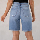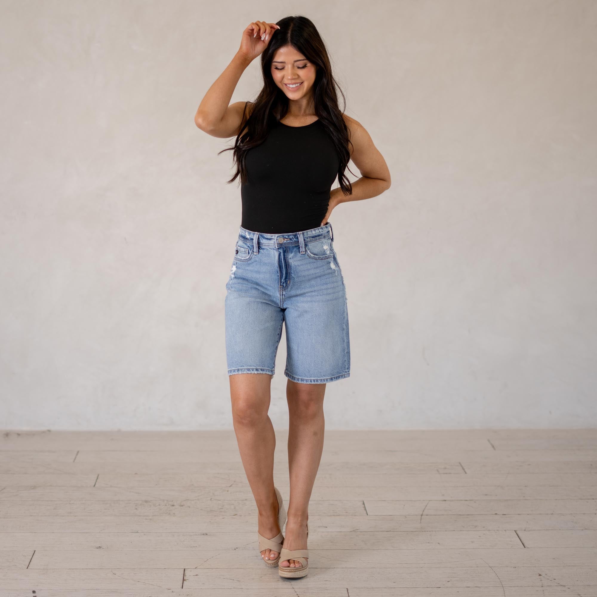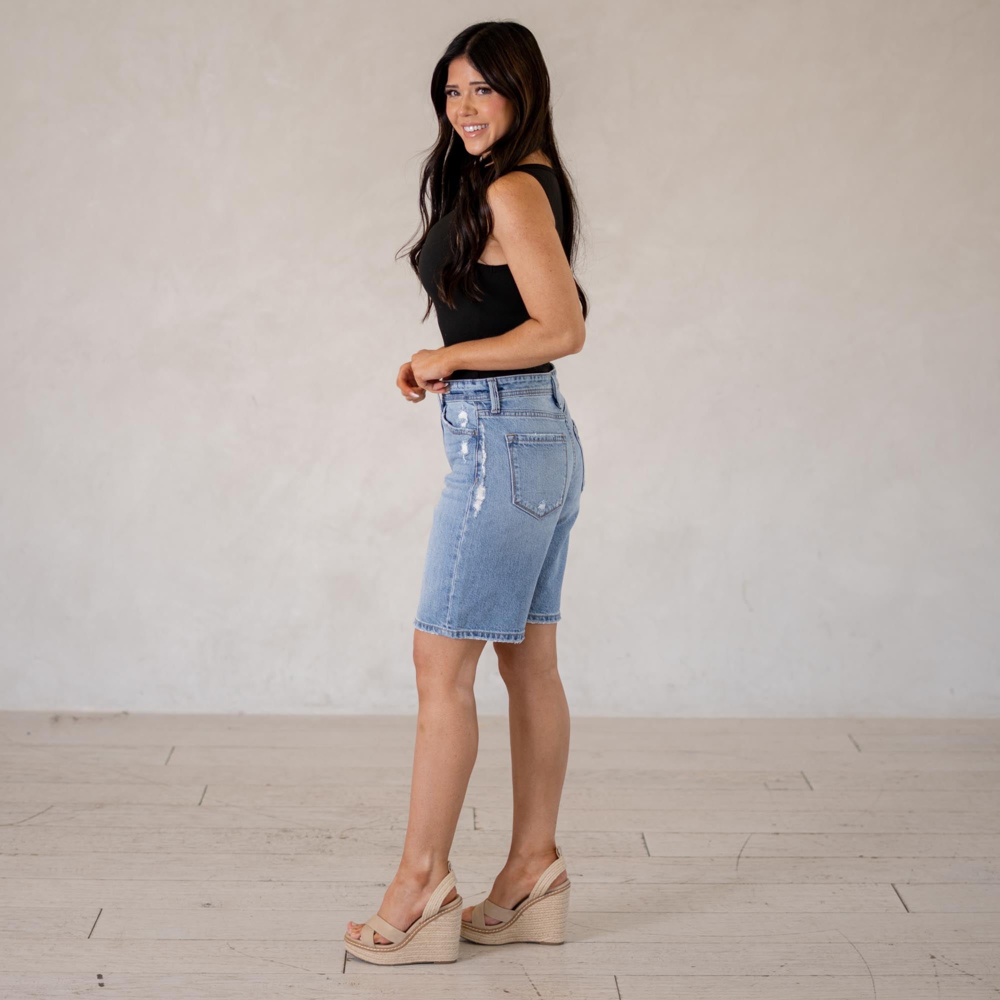 A laid-back essential, the Annie Low Slung Baggy Shorts bring effortless cool to your denim lineup. Designed to sit low on the waist, this style creates that relaxed, baggy silhouette that’s perfect for easy everyday wear. Finished in a classic medium wash, they deliver that timeless denim look you can pair with anything. Made with comfort denim that holds its shape while still molding to your body, these shorts feel just as good as they look. Distressed details along the waistband, front pockets, and hem add the perfect touch of edge.