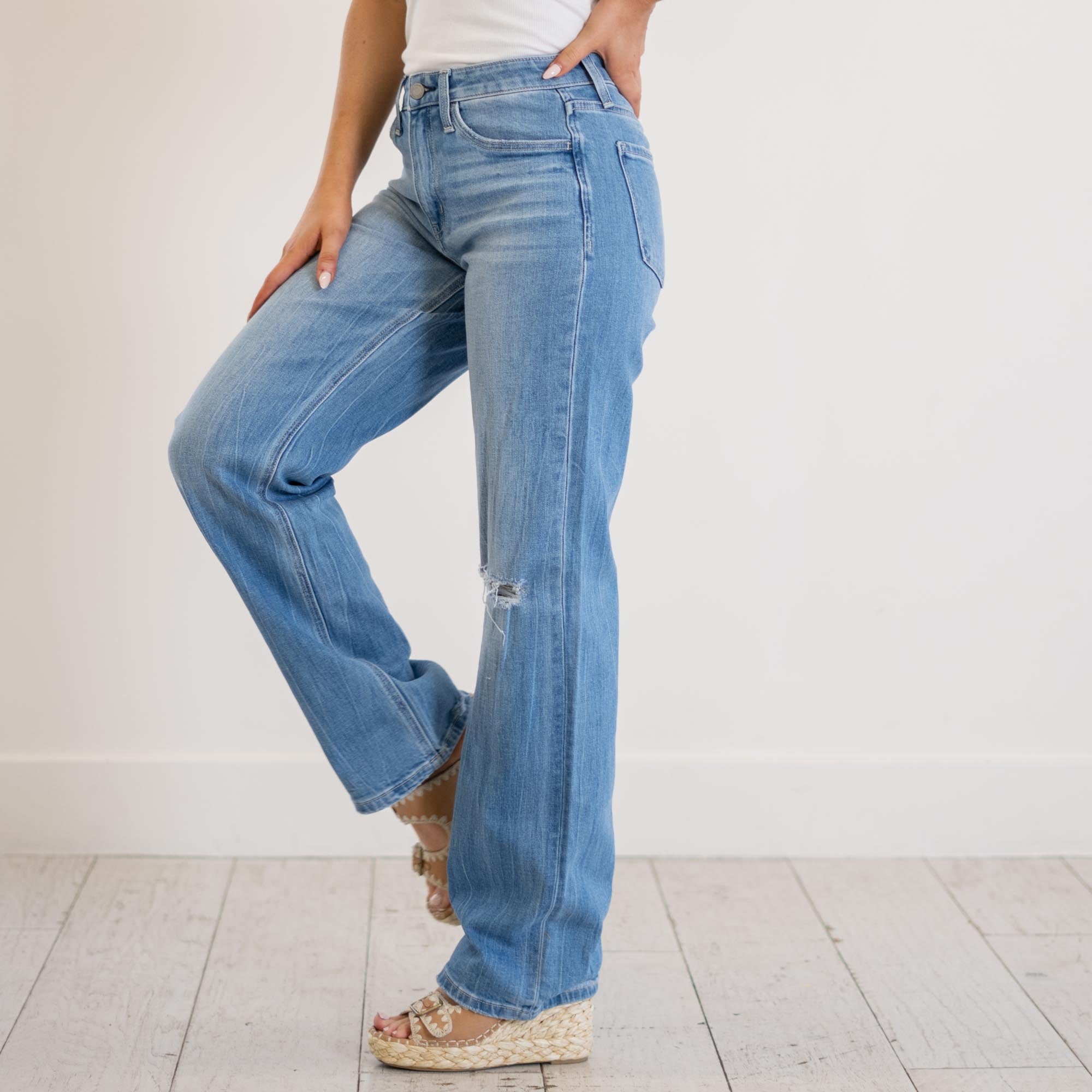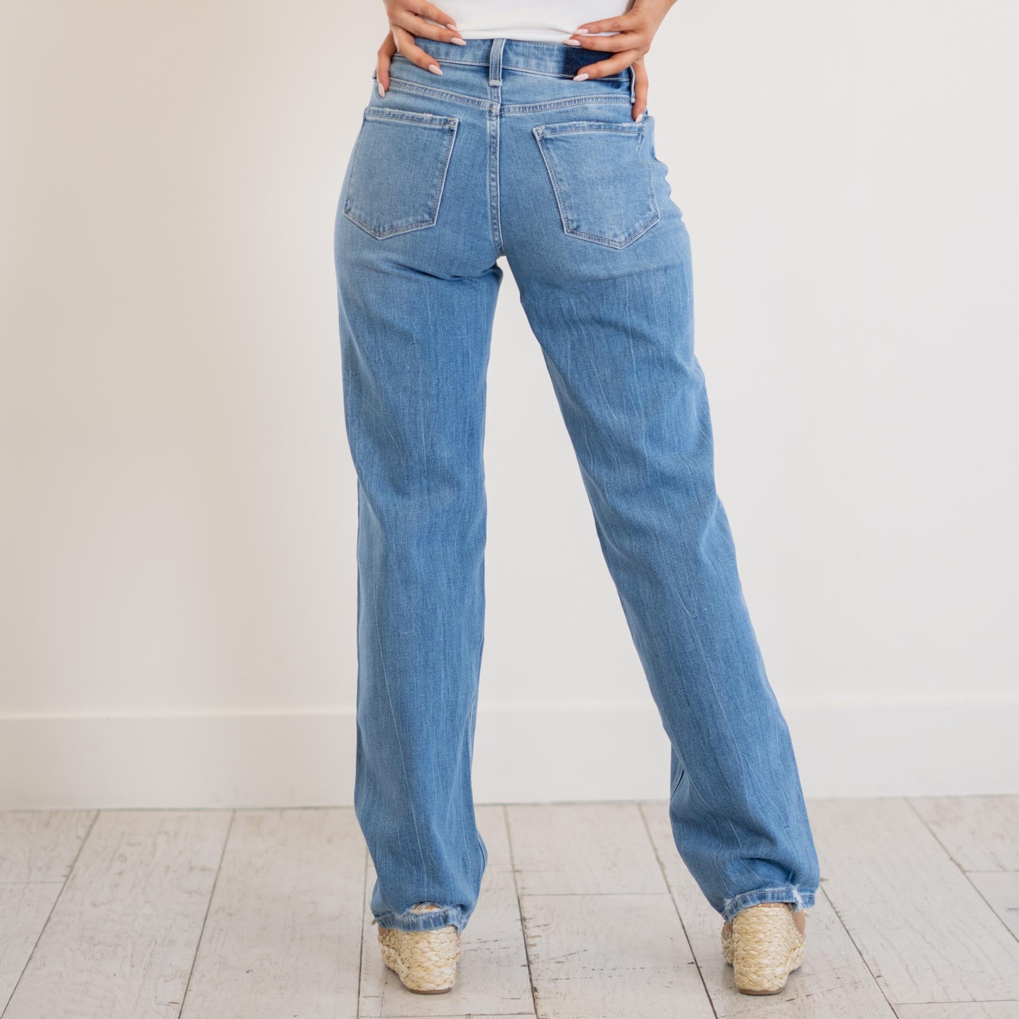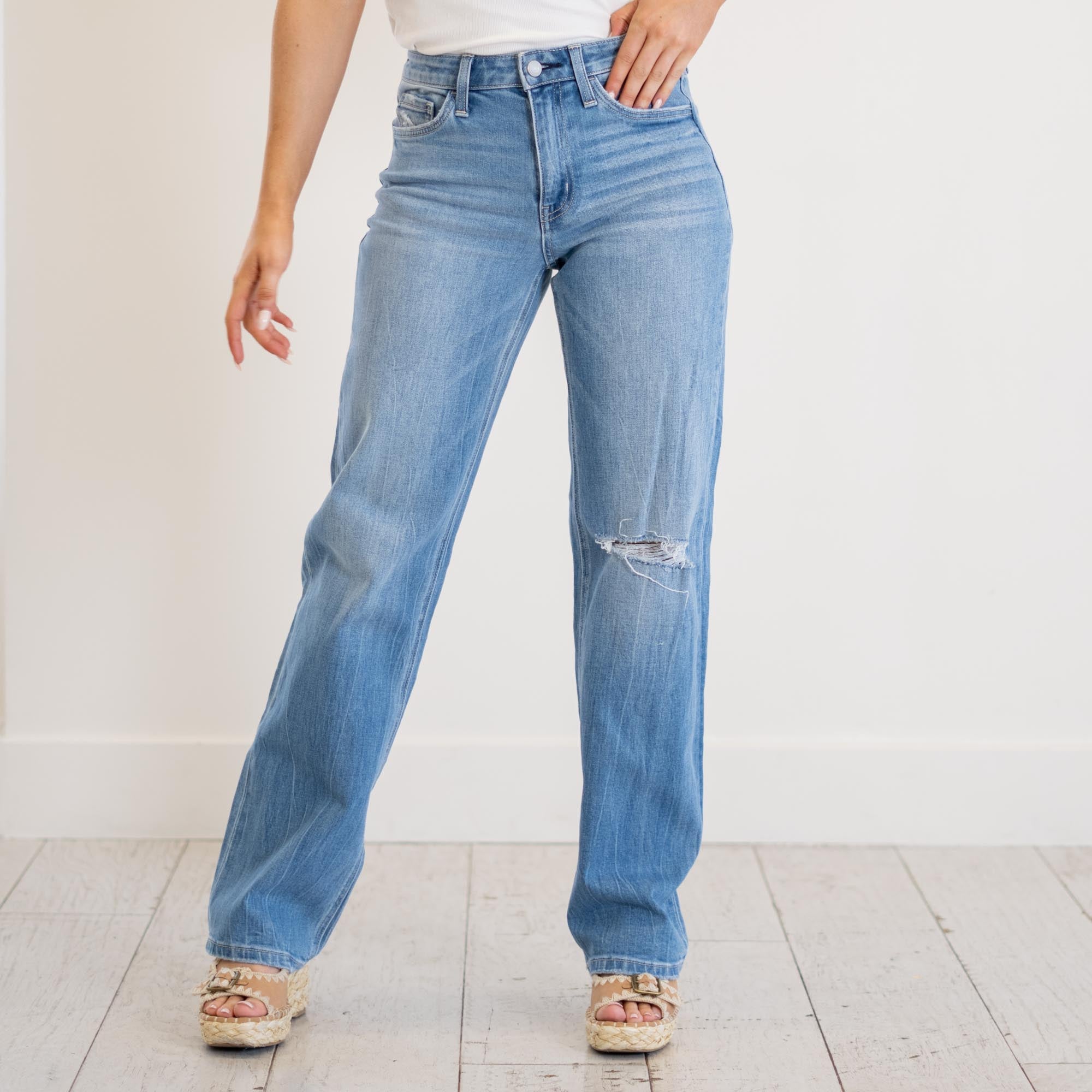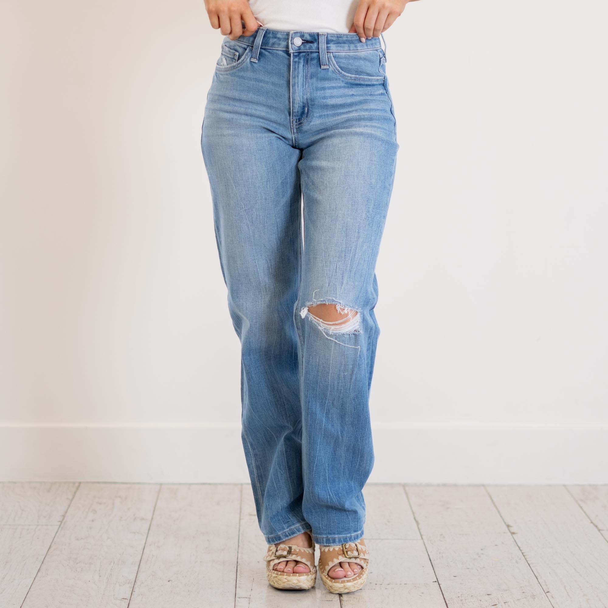 VERVET Literary High Rise Distressed Slim Wide Jeans Medium Blue Wash