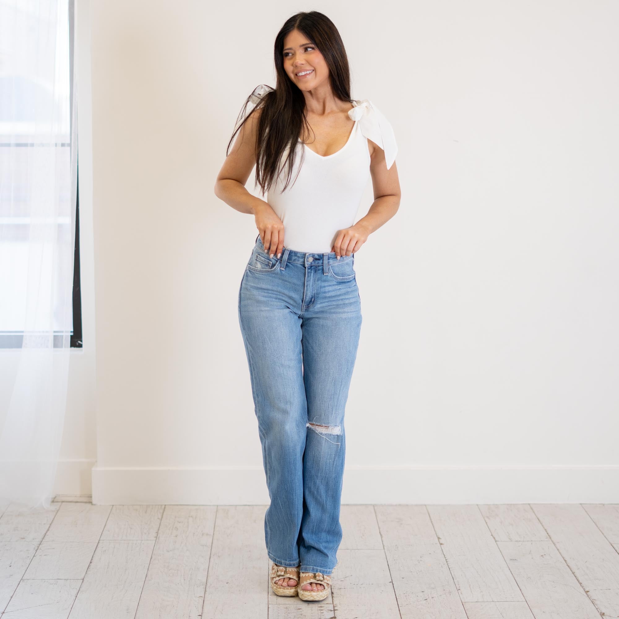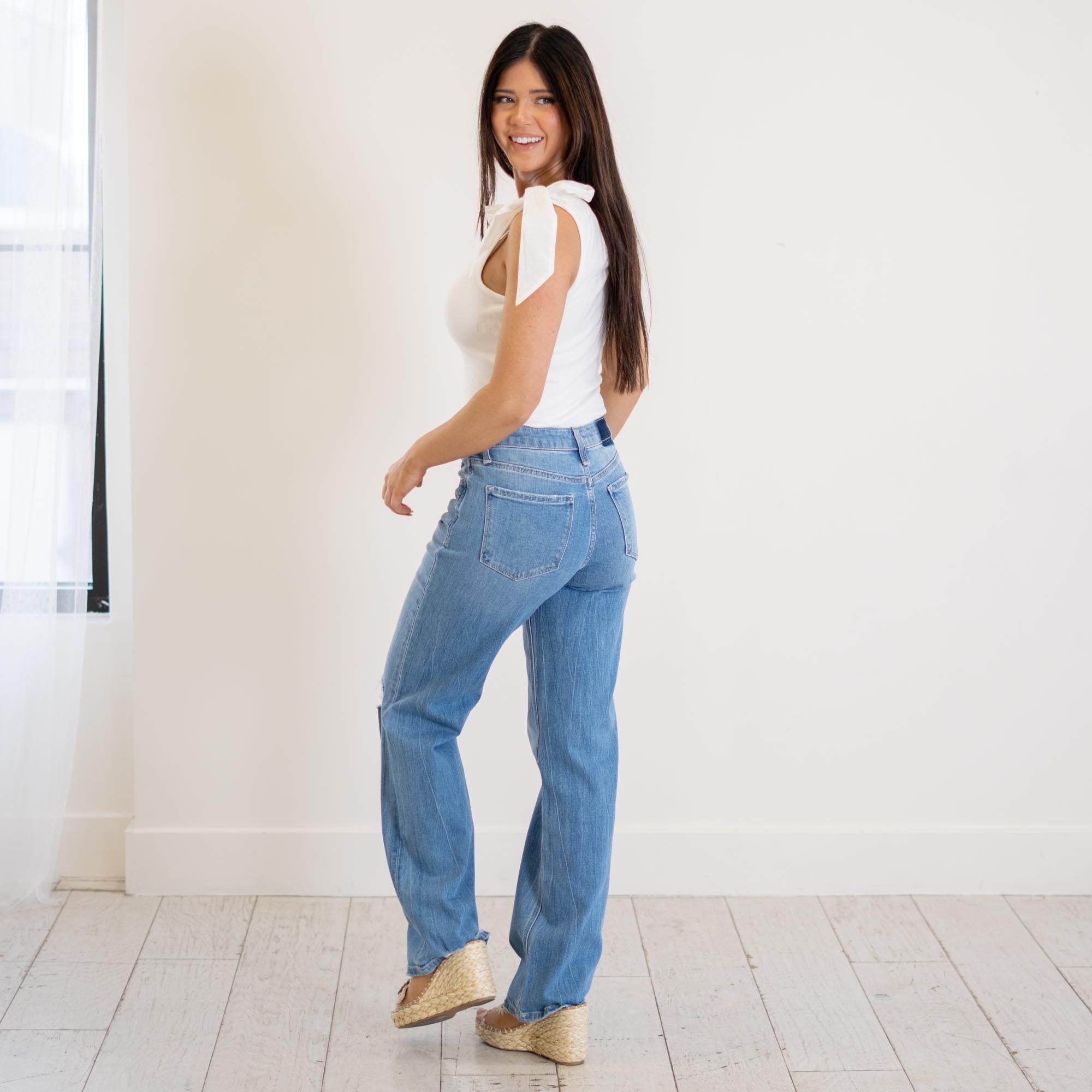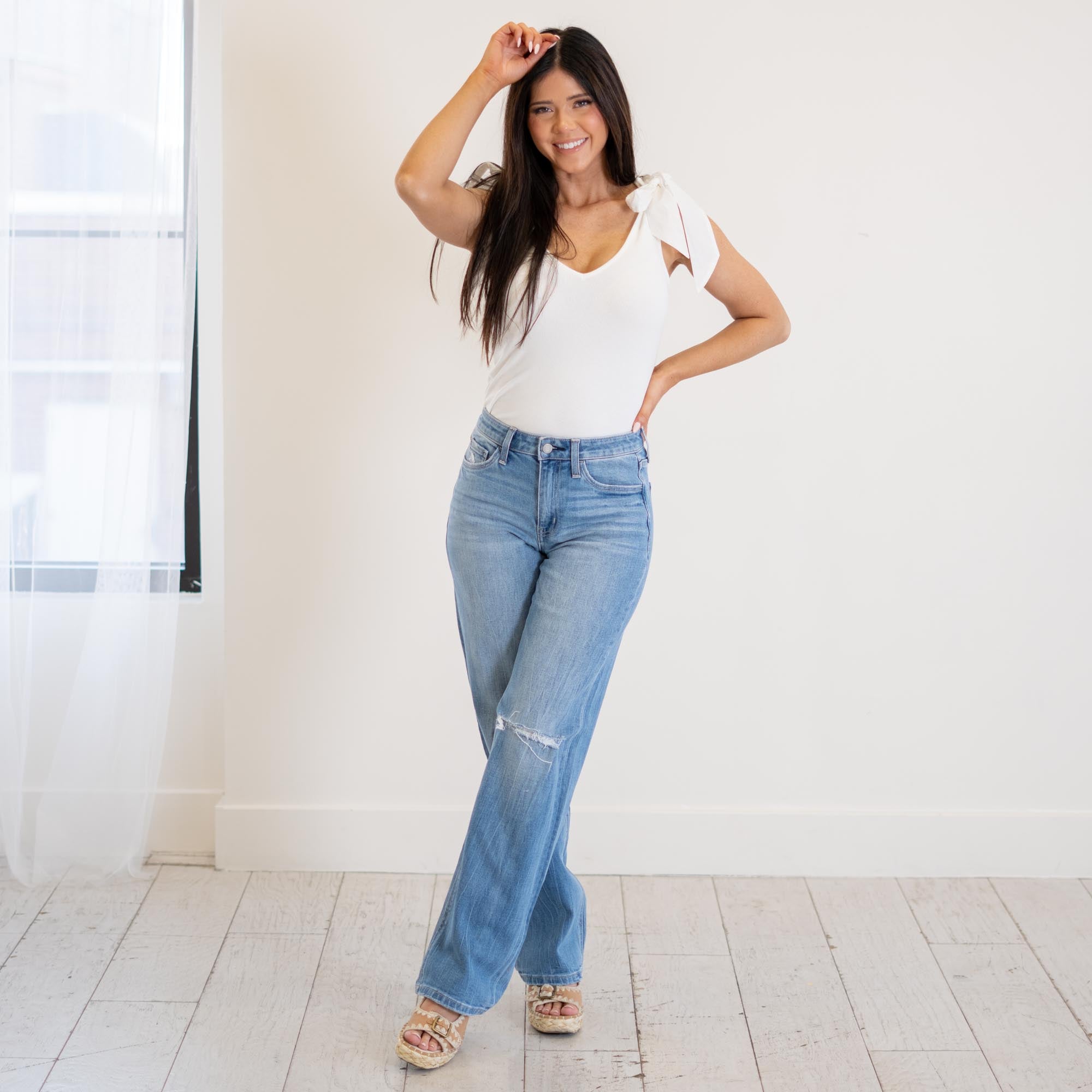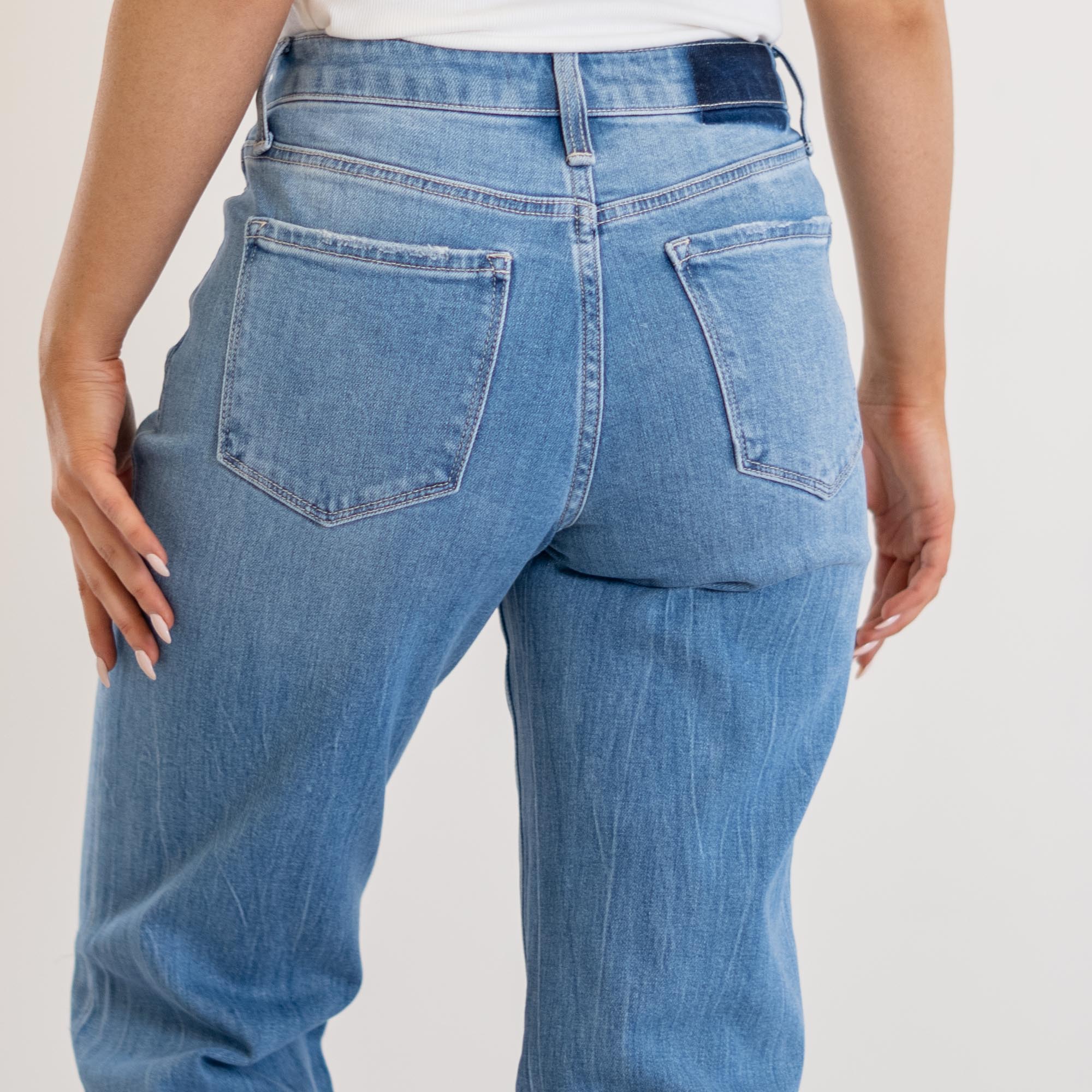 VERVET Literary High Rise Distressed Slim Wide Jeans Medium Blue Wash