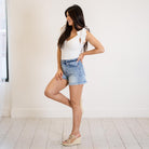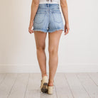 Designed to hold their shape wear after wear, this pair gives you a structured fit that stays put without stretching out. The mid-thigh length and frayed hem add a laid-back, lived-in touch that pairs effortlessly with everything from vibrant tops to cozy oversized sweaters.