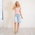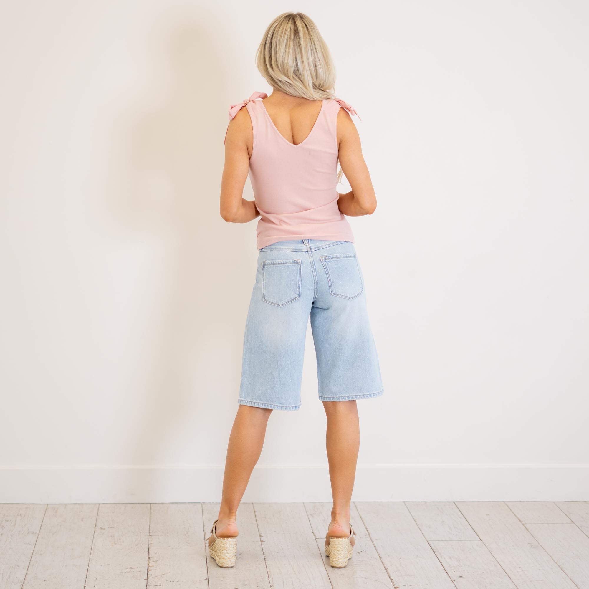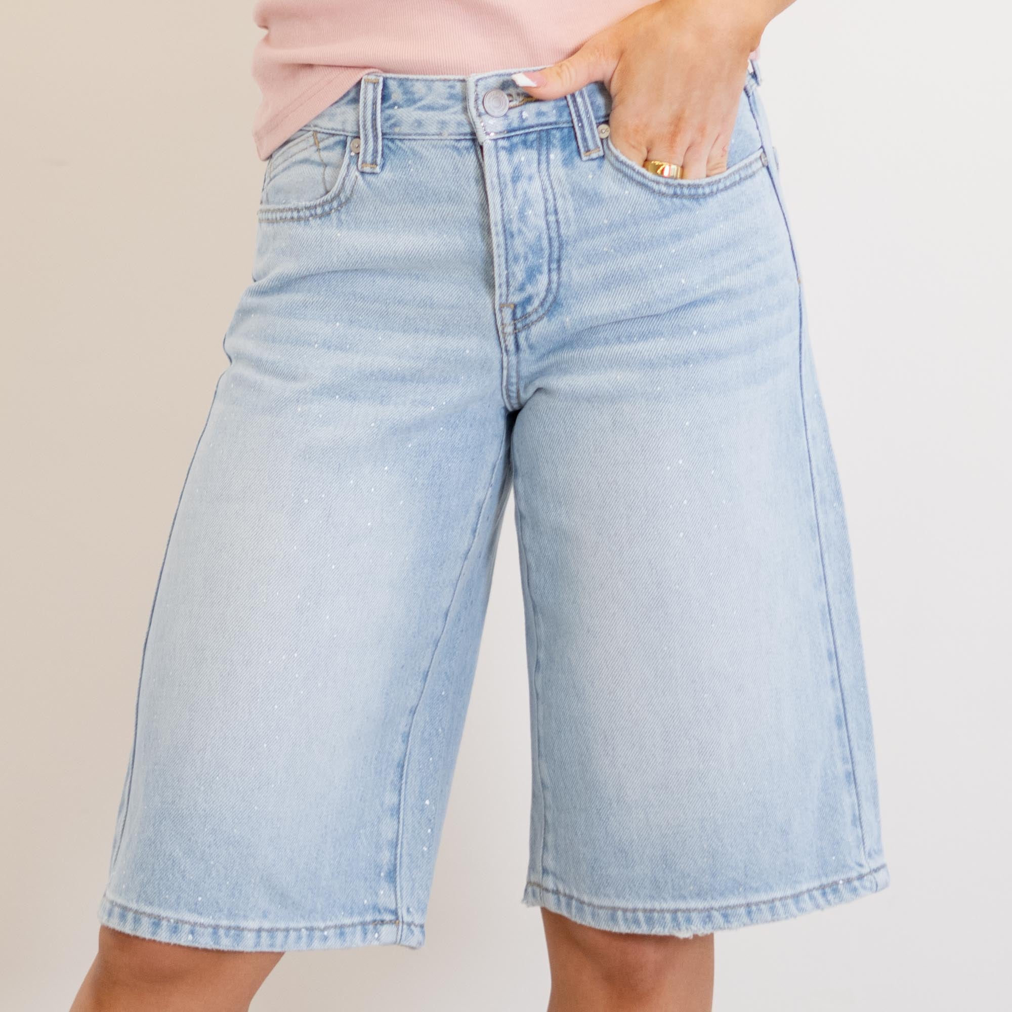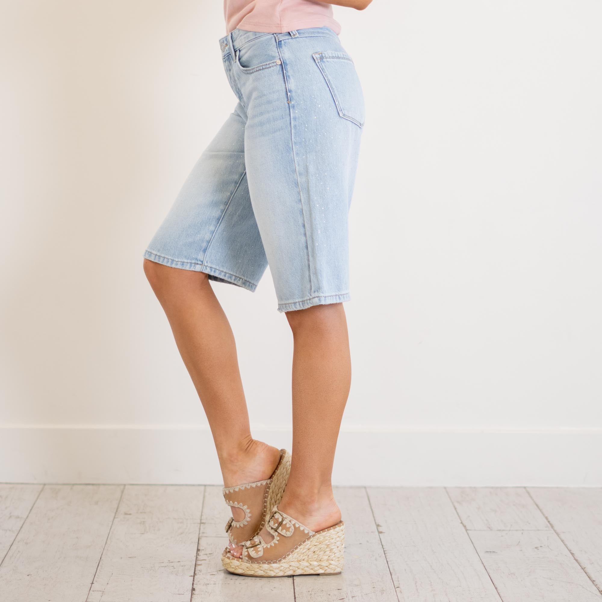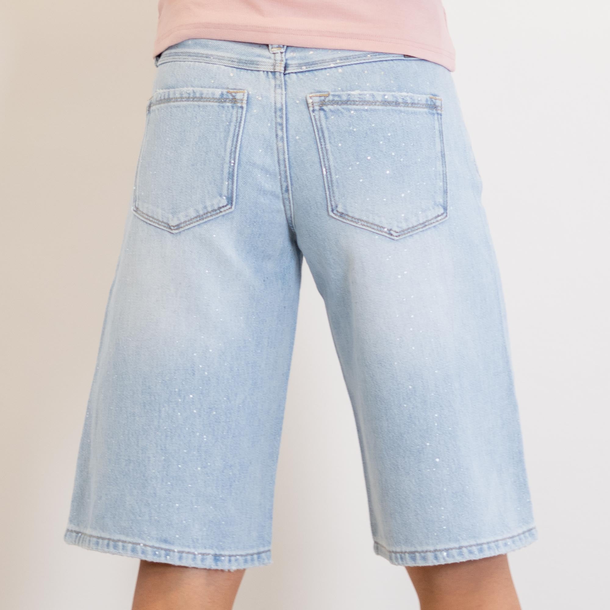 Crafted from lightweight rigid denim, this pair delivers structure while still allowing easy, all-day movement. A subtle glitter-woven detail adds a unique, eye-catching finish that sets these apart from your everyday jorts.