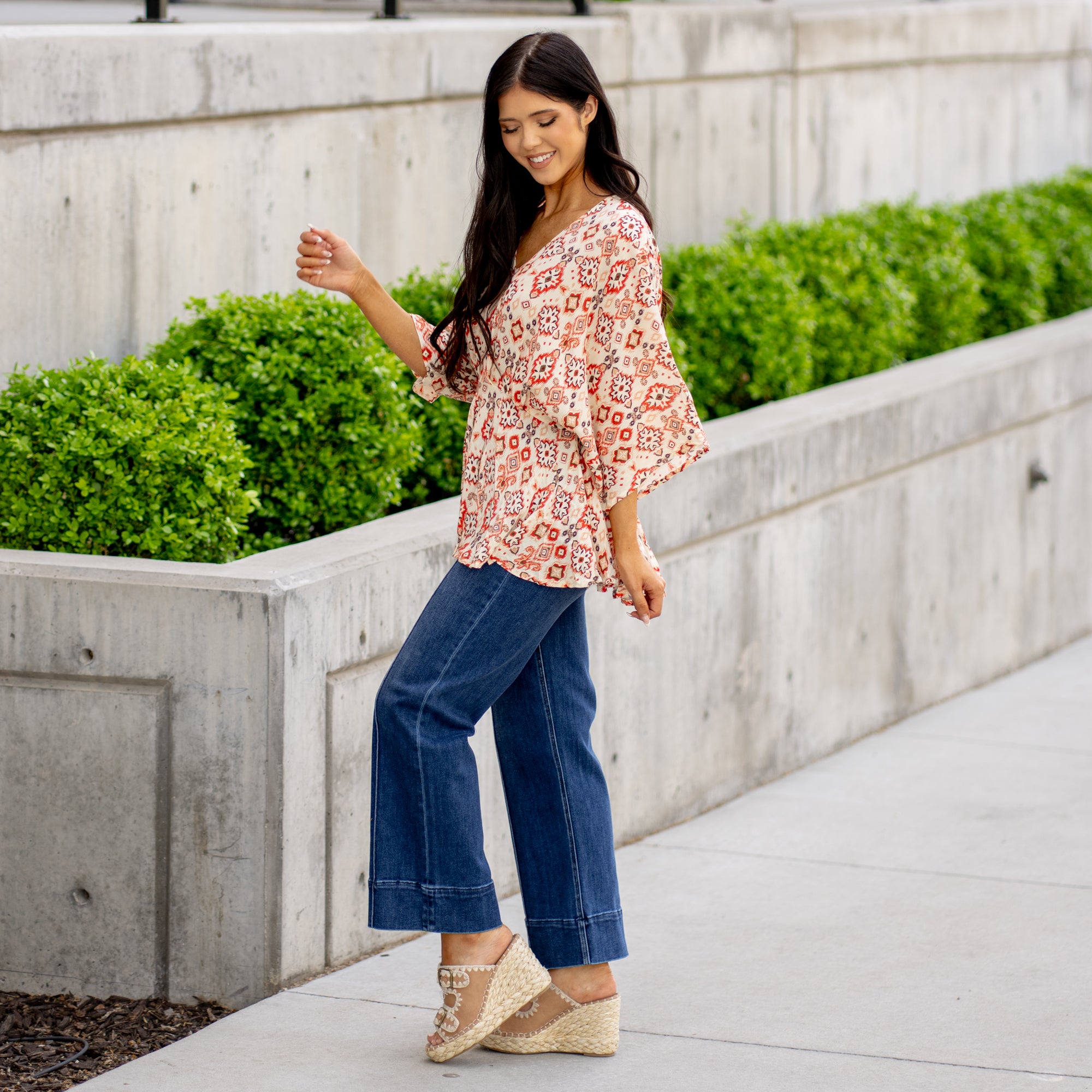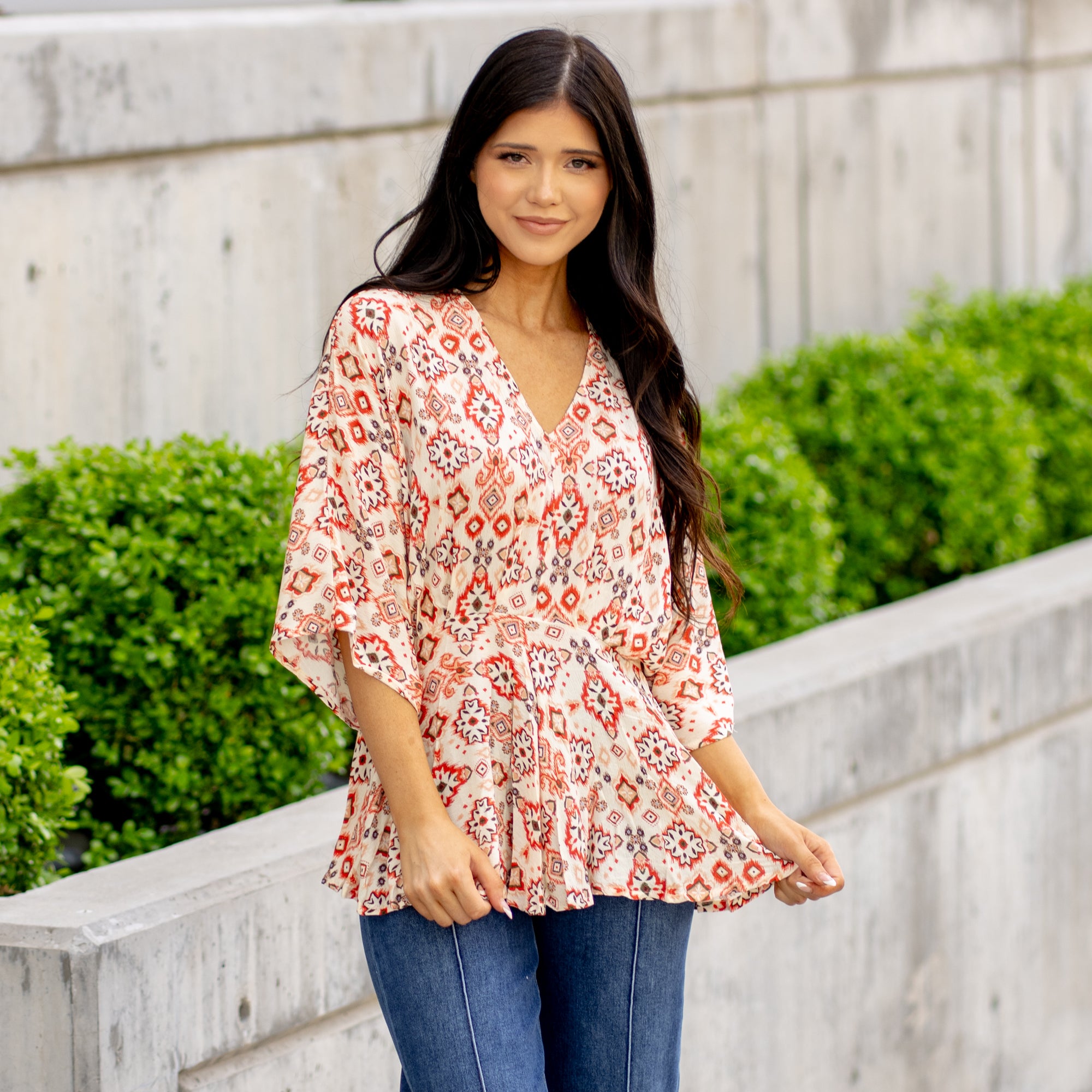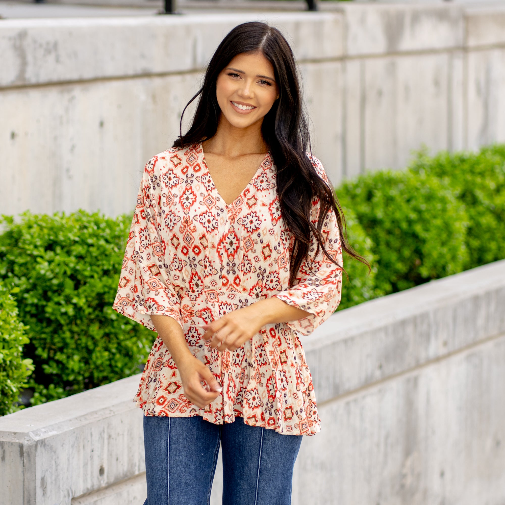 Say hello to your new favorite statement top! The Wander Vibes Woven Top features a bold Aztec print and half sleeves with a flattering tuck detail that gives it just the right amount of shape. Lightweight and easy to wear, it’s the kind of piece that does all the talking—just add denim and you’re out the door. Perfect for adding a little adventure to your everyday look.