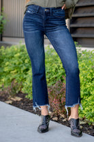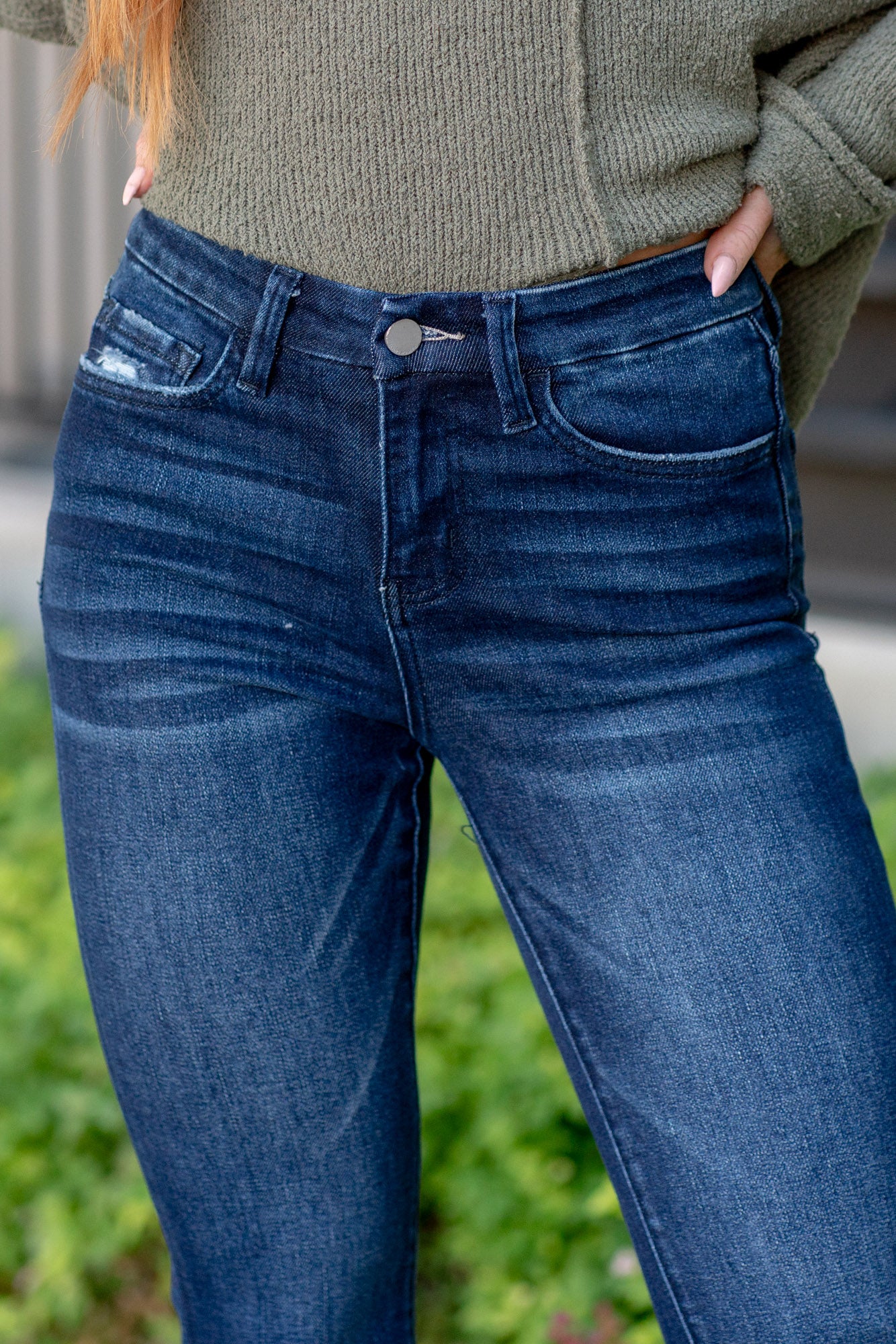 Introducing our Super High Rise Kick Flare Jeans in a rich dark blue wash. Crafted from Comfort Stretch Denim, these jeans feature a super high-rise waist for a flattering fit, a cropped length to keep you on-trend, distressed hem for a touch of edge, and a kick flare silhouette for a stylish finish. Elevate your denim game with this chic and comfortable piece.