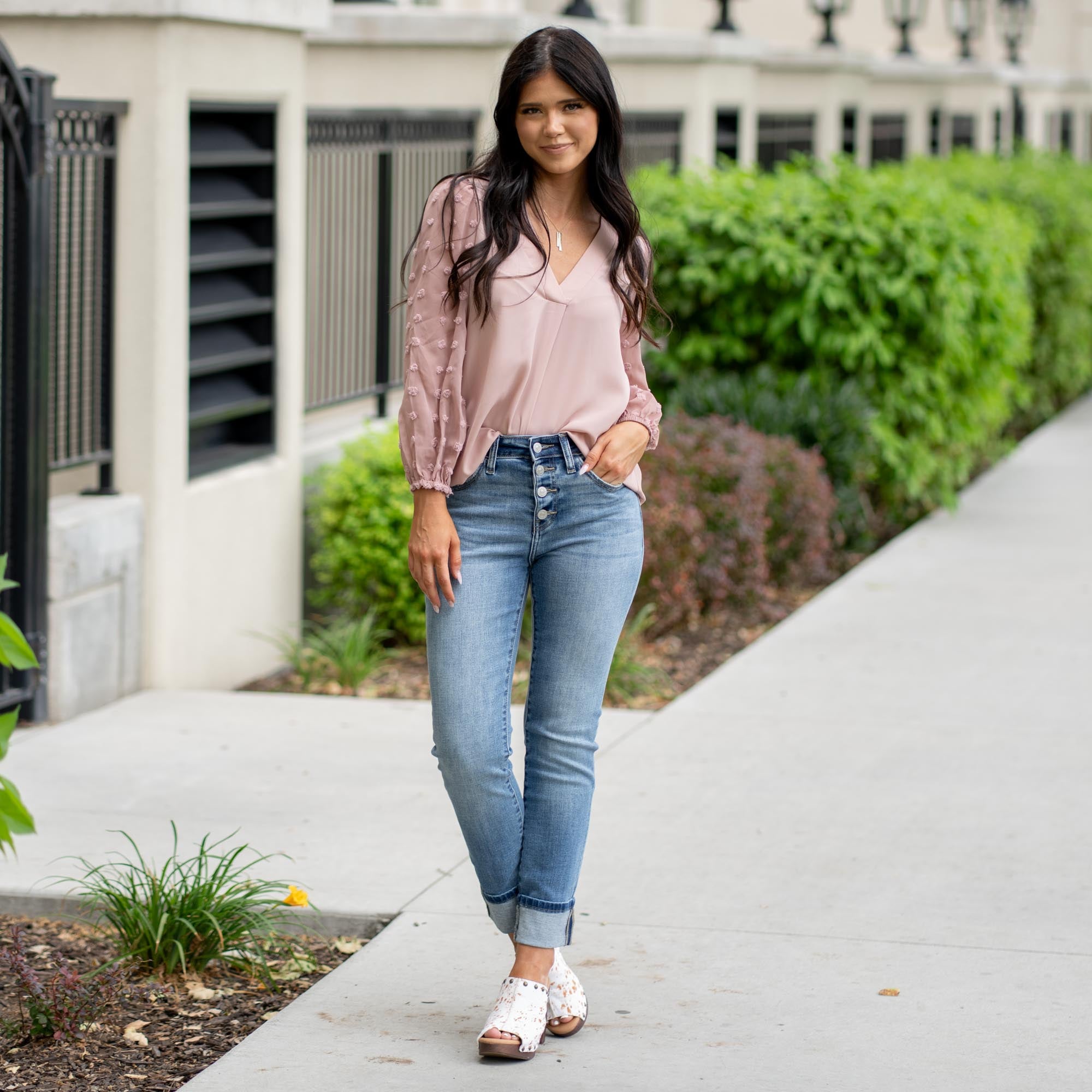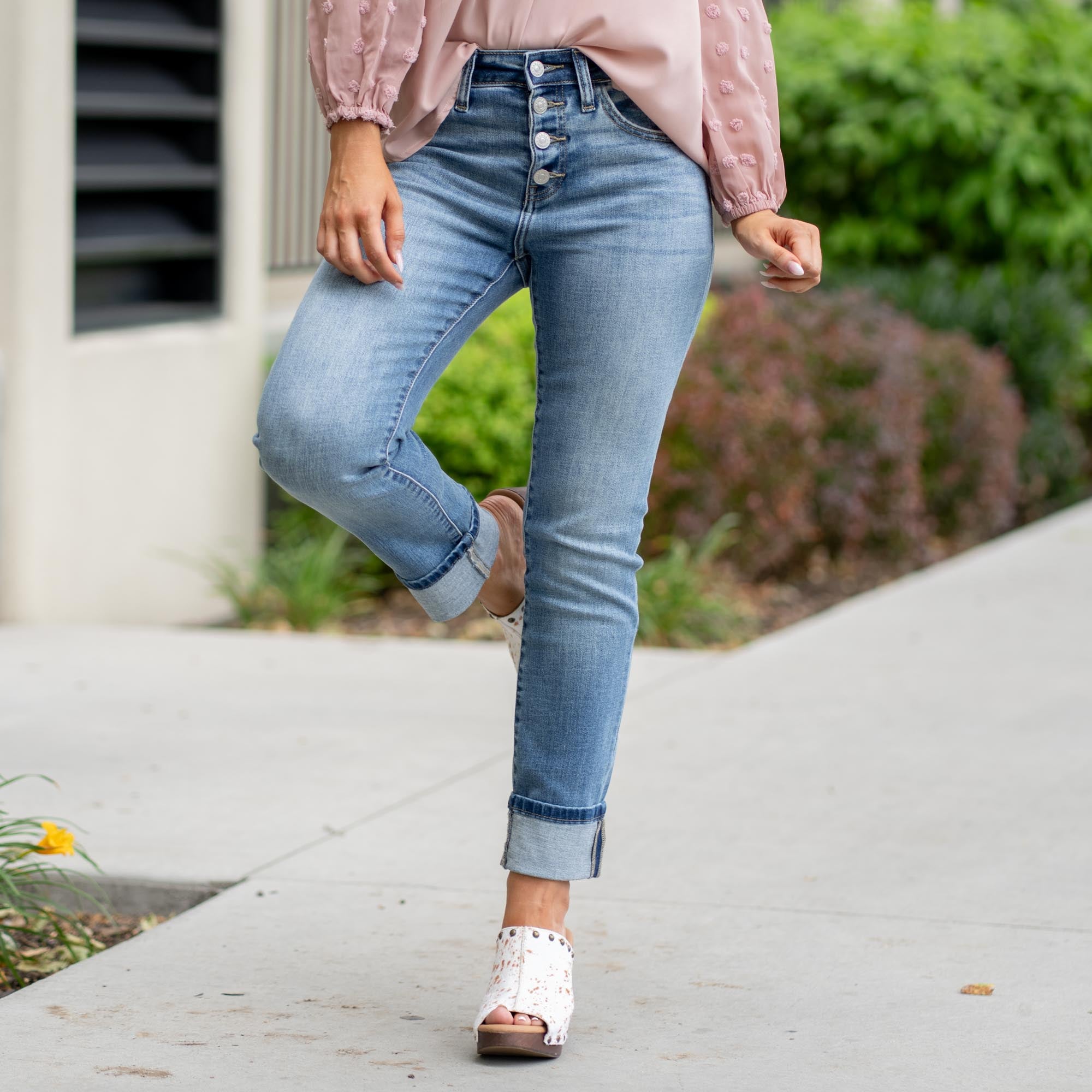 The Noelle High Rise Skinny Straight Jeans blend the curve-hugging feel of a skinny with the laid-back edge of a straight leg. Finished in a timeless medium wash with soft whiskering, this pair is topped with an exposed button fly and a 3" single fold for a casual touch. Built with a classic five-pocket design and high-rise waist, Noelle is your new go-to for everyday polish with effortless comfort.