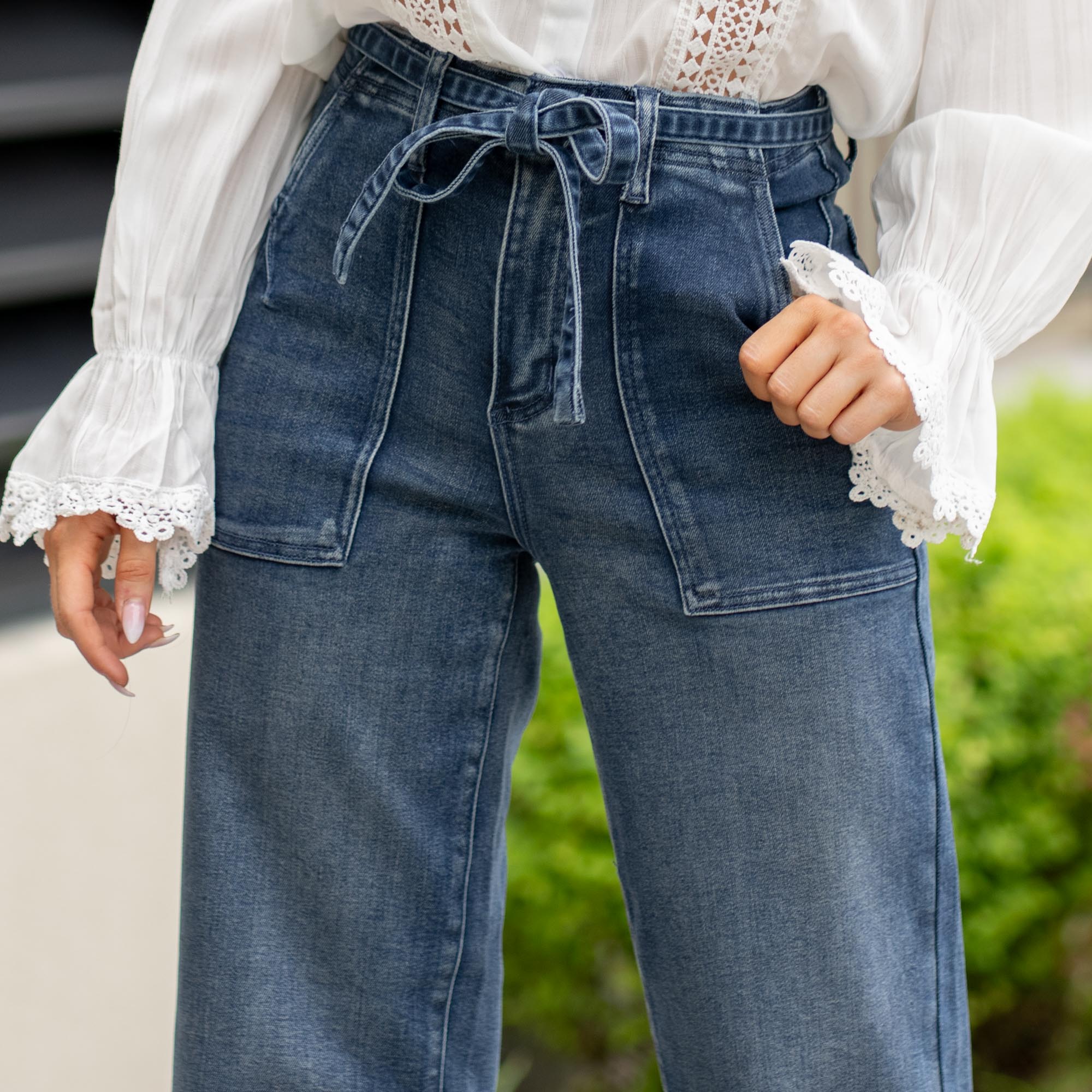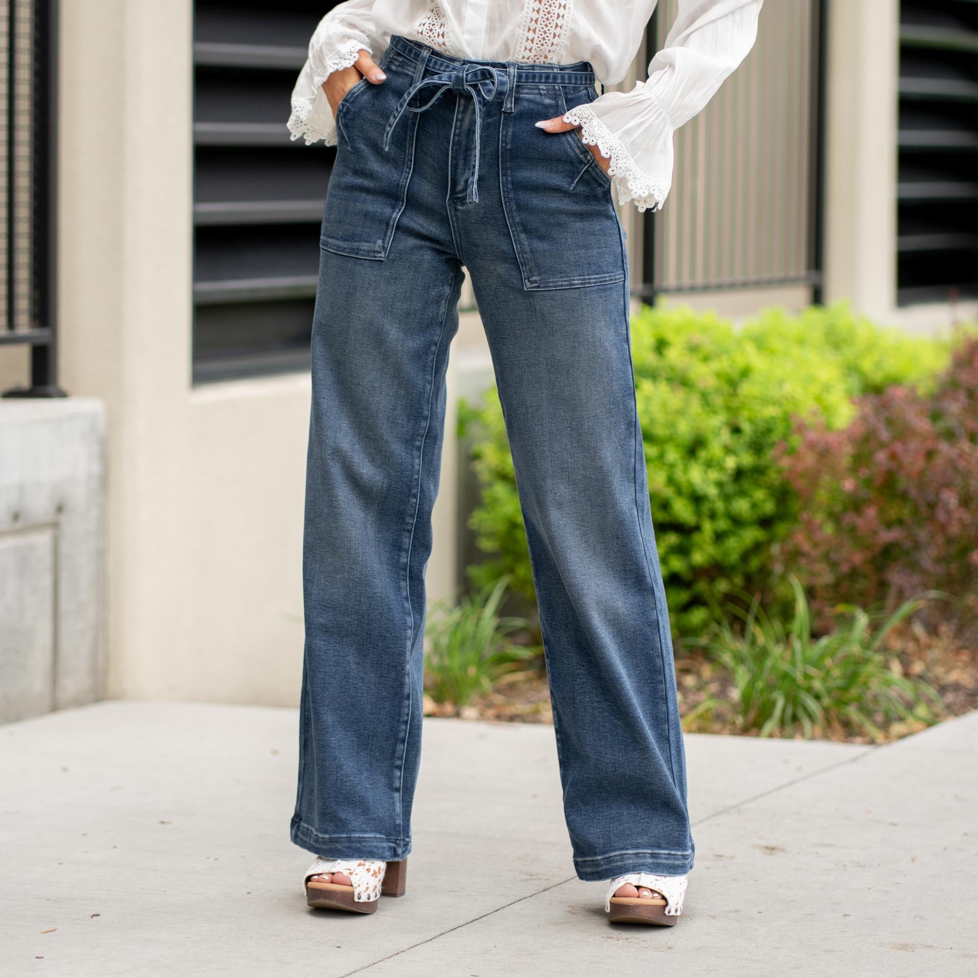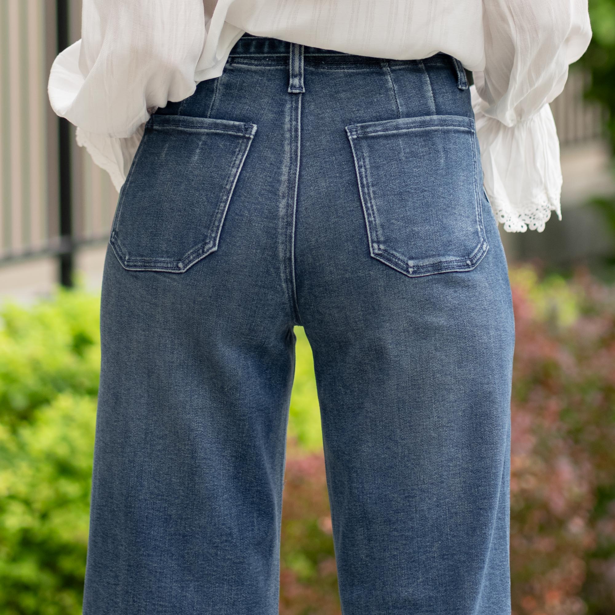 With a trouser-inspired wide flare leg and elevated dark wash, the Seville High Rise Wide Flare blends relaxed style with structured details. Slant front pockets and cut seam accents give it a refined edge, while a self-tie waistband adds a flattering, feminine touch. Finished with back darts, a zip fly, and single-button closure, this jean brings a polished silhouette that feels just as good as it looks.