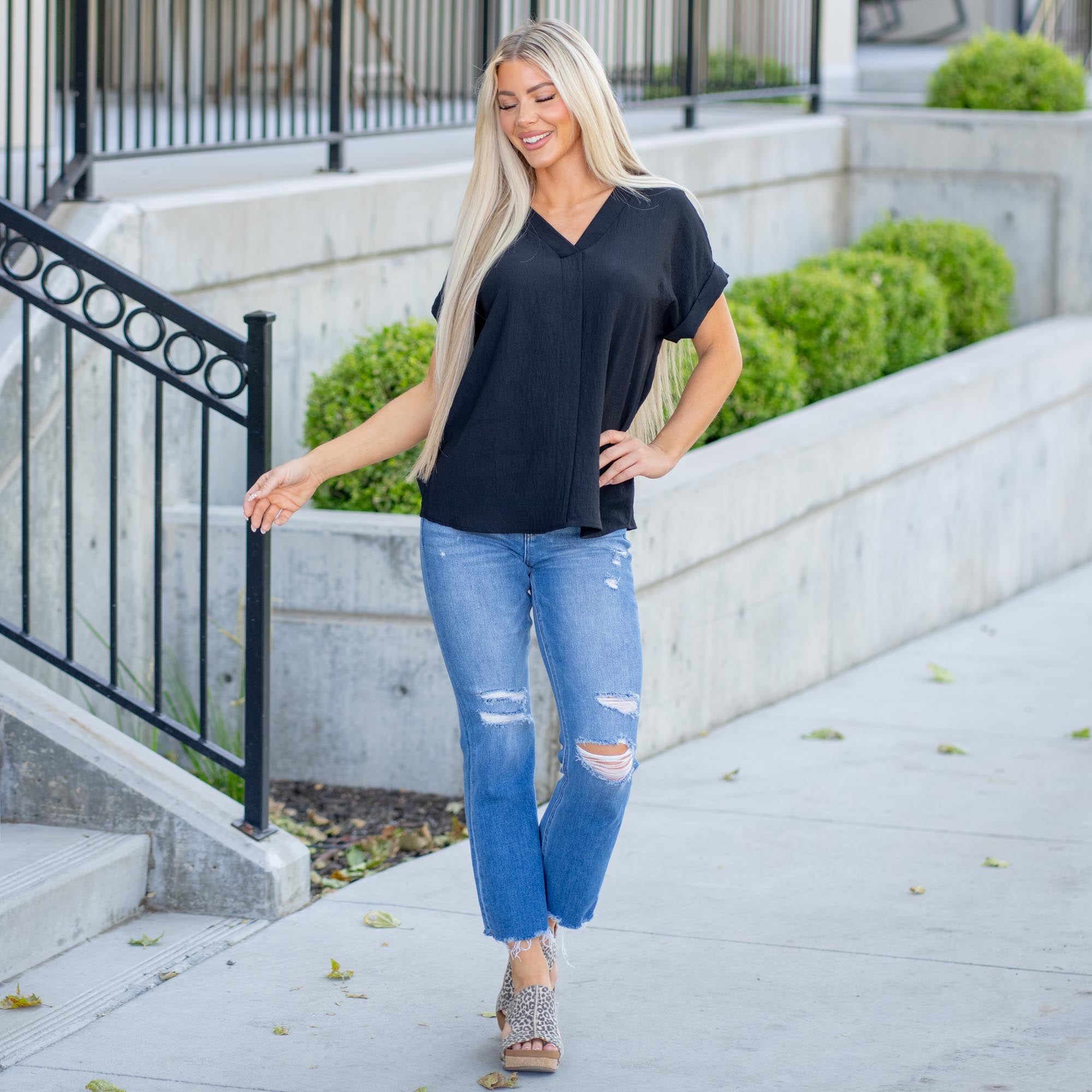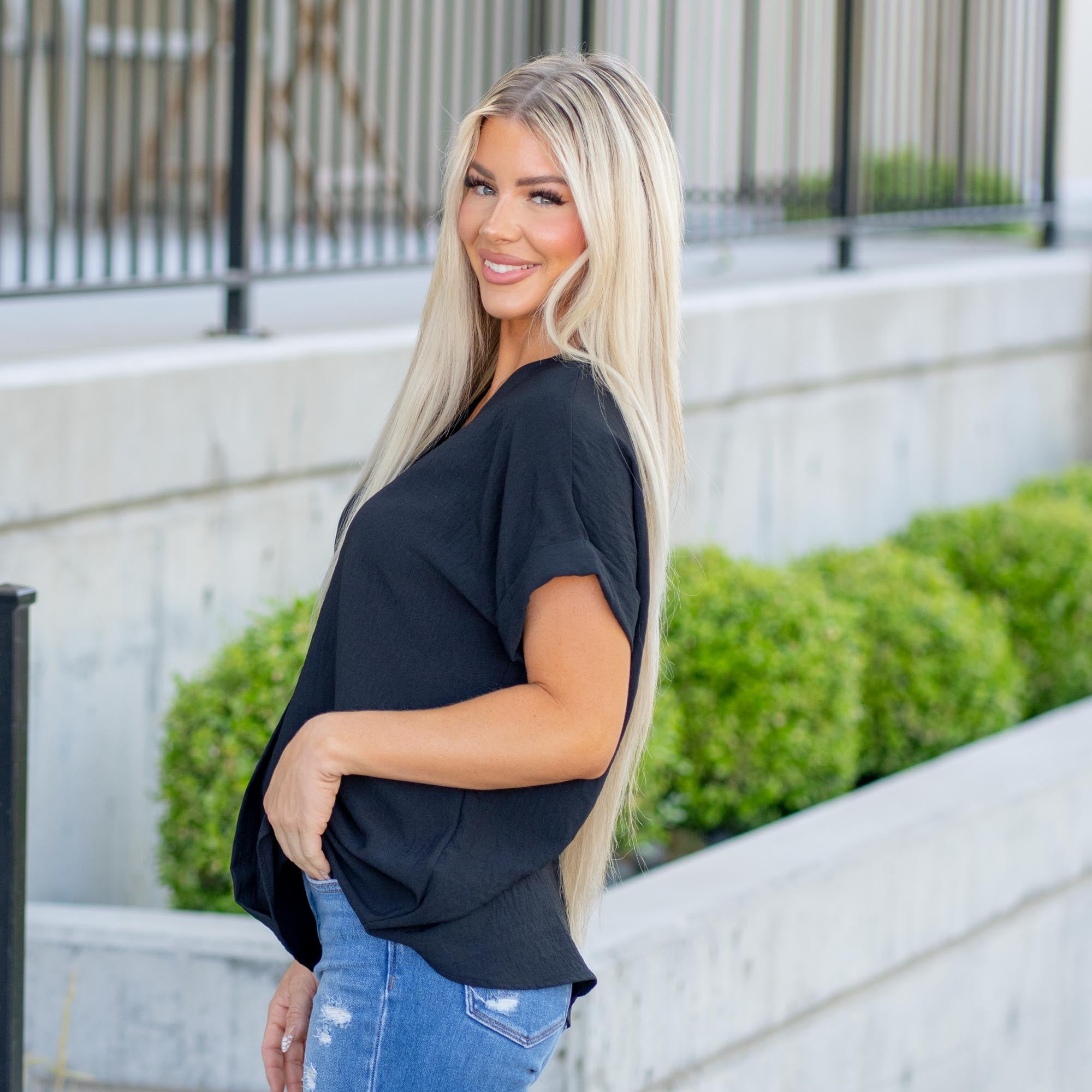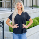Easy elegance meets everyday wear in the Harper Dolman Blouse. Designed with a flattering V-neckline and relaxed dolman short sleeves, this textured woven top offers an effortless silhouette you can dress up or down. Lightweight and breathable in 100% polyester, it’s the perfect go-to for workdays, weekends, and everything in between.
