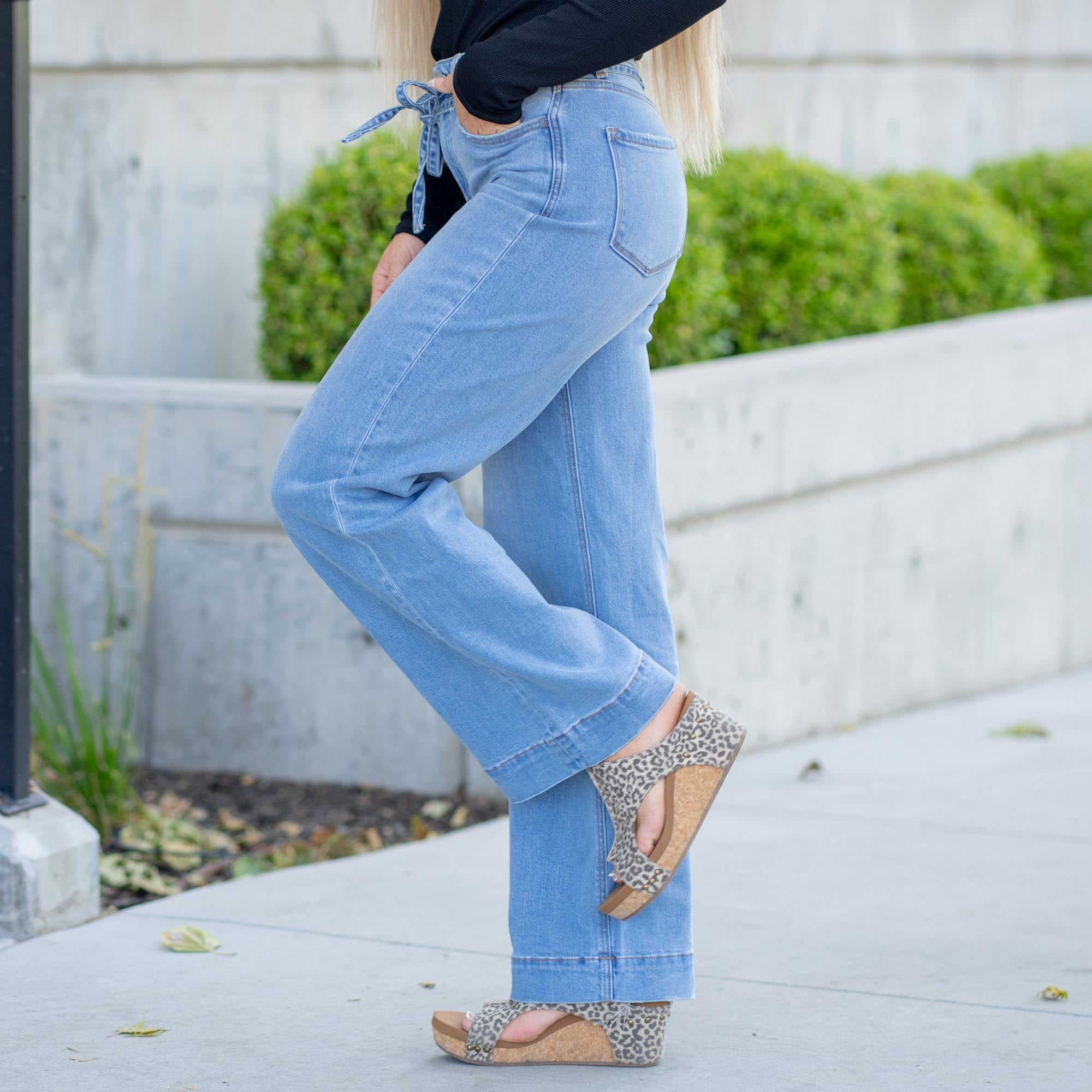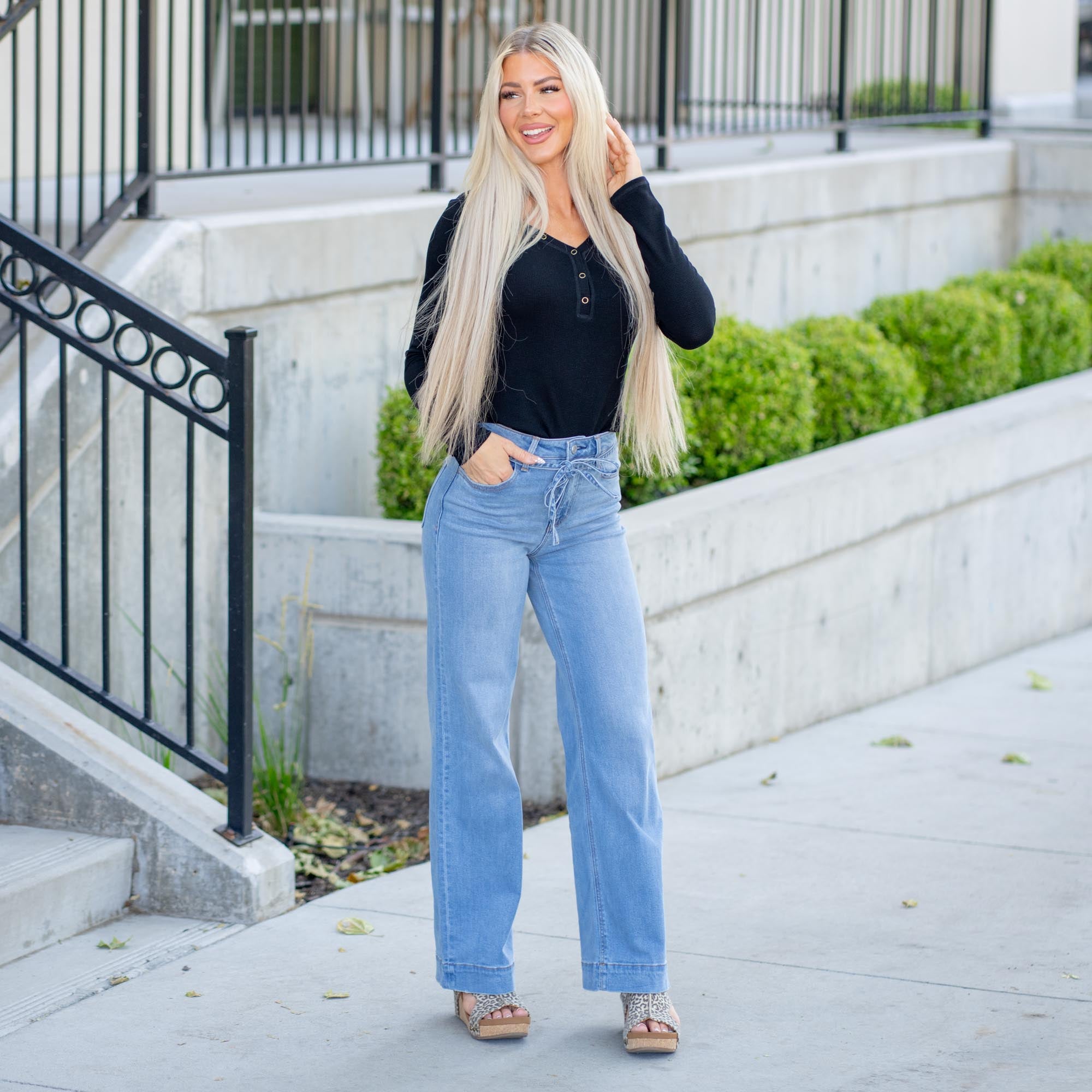 Polished, playful, and effortlessly chic. The Elatedly Jeans blend trouser-inspired tailoring with the ease of your favorite wide-leg denim. Made with soft comfort stretch, they feature a super high rise waist that flatters and cinches with a self-tie belt. The full-length silhouette flows into a clean trouser hem—perfect for dressing up or down. It's the kind of denim that makes every day feel elevated.