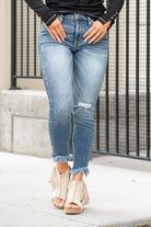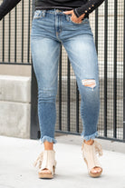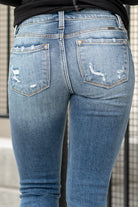 An ankle skinny fit with a mid-rise and frayed hem. These have a fitted leg with distress and a whiskered wash in medium blue.