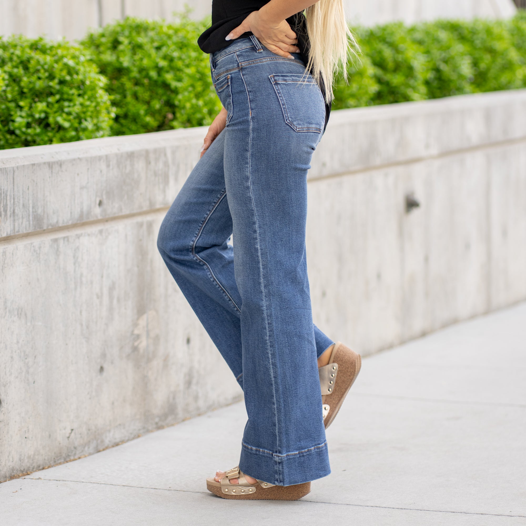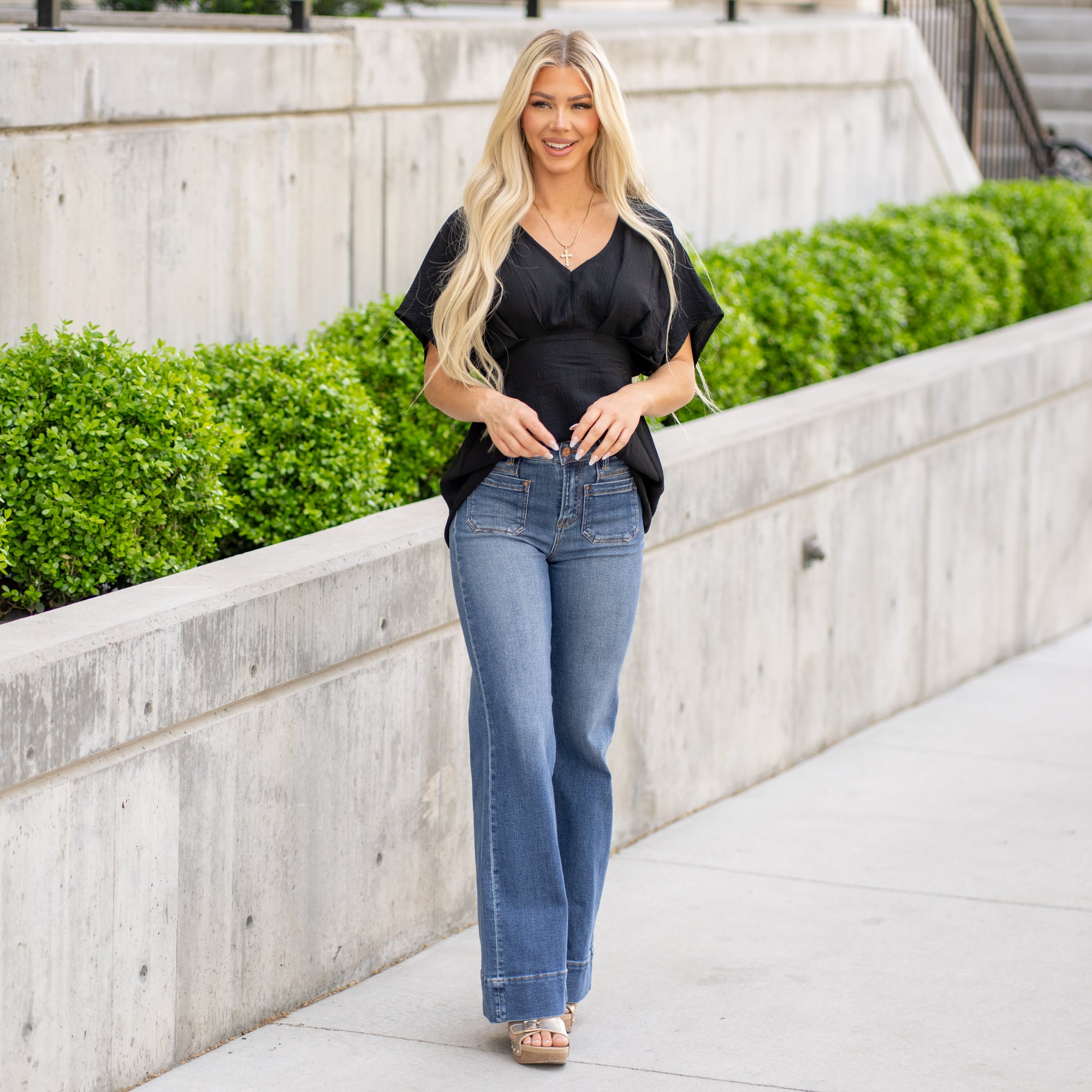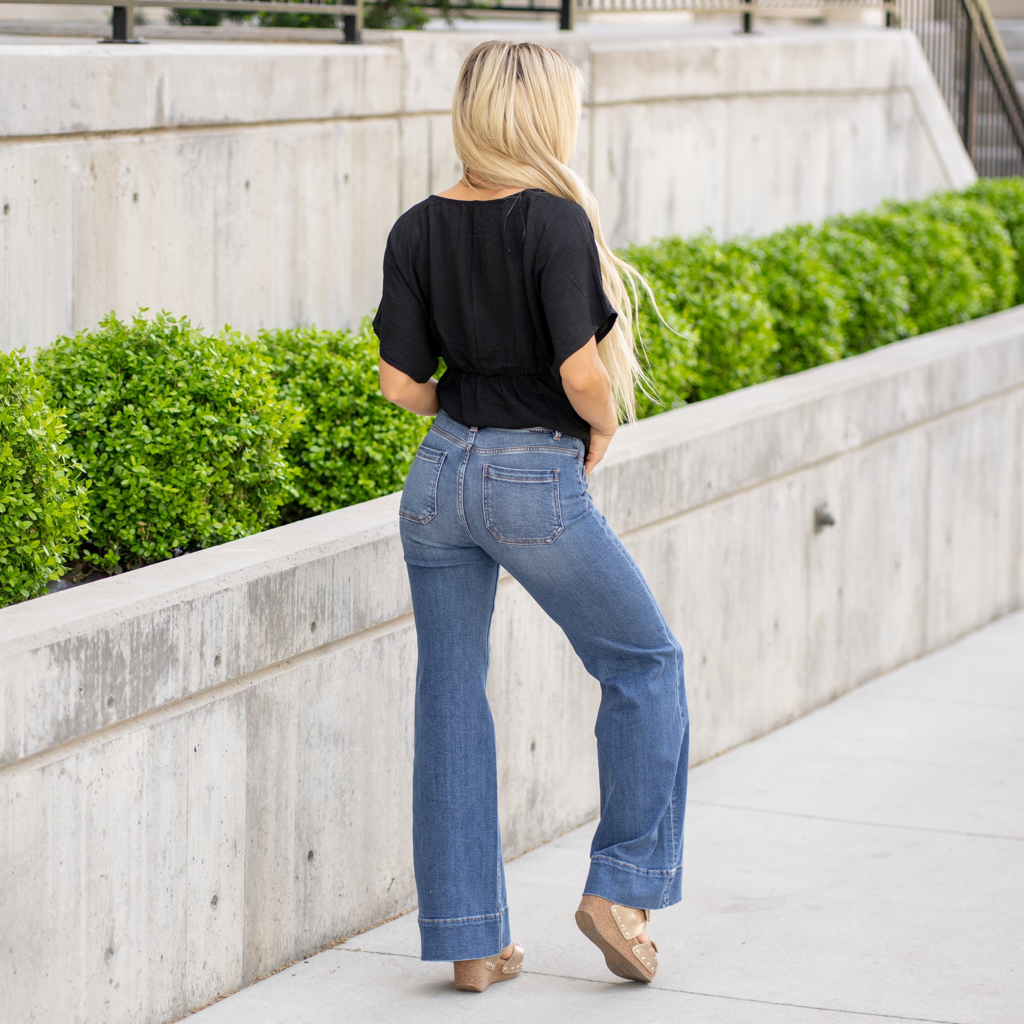The Westport Flare delivers major vintage energy with a sleek, wide flare silhouette and bold front patch pockets. Designed with a flattering high rise waist and crafted from soft, comfort stretch denim, this pair elongates the legs while adding just the right touch of throwback charm. Pair with fitted tops or flowy blouses for an effortlessly chic vibe.