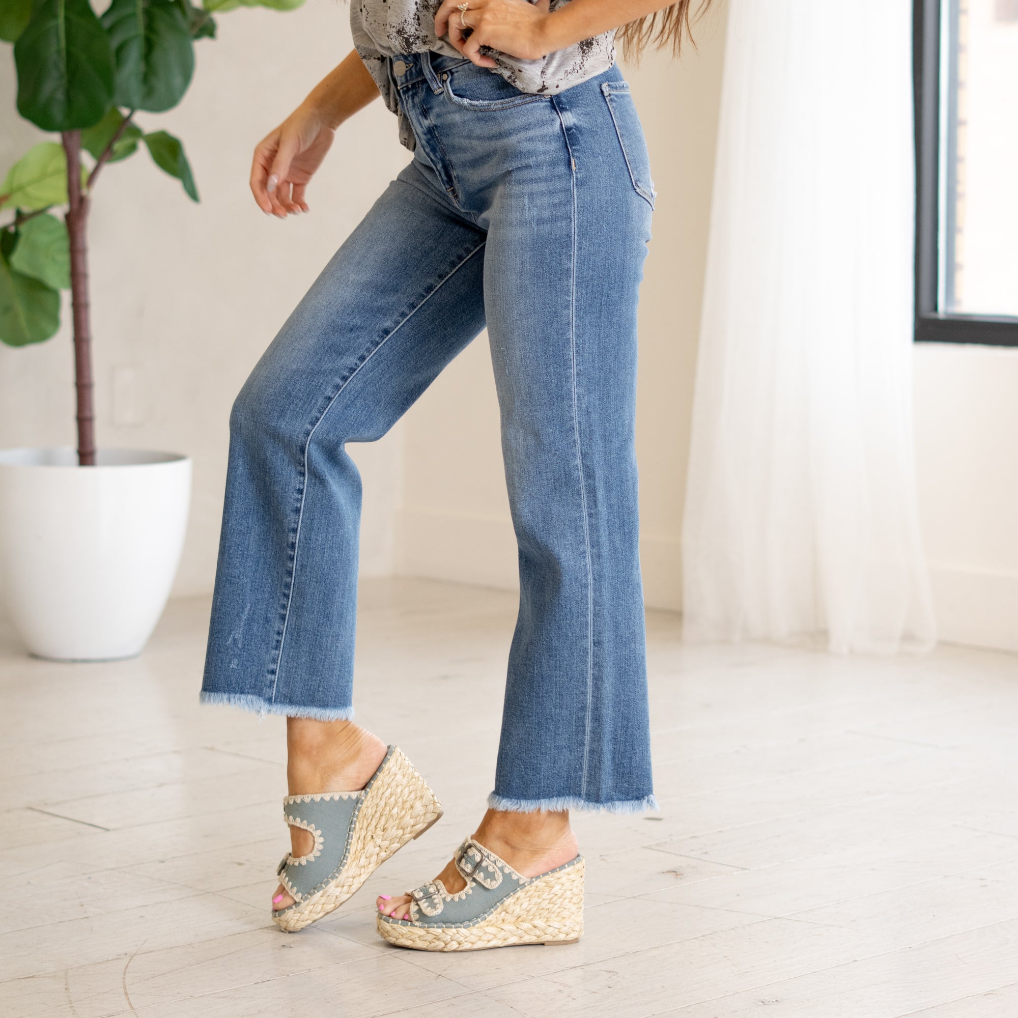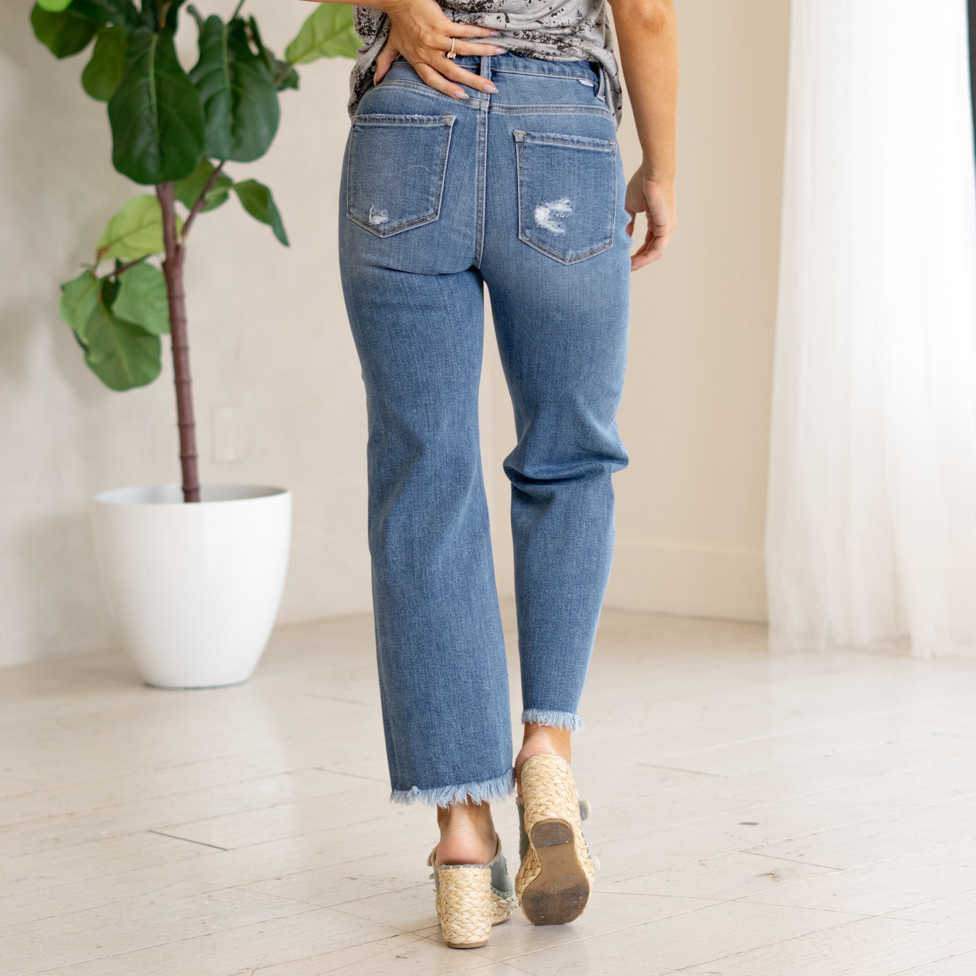 Risen Skyfall High Rise Cropped Frayed Hem Straight Jeans Medium Blue Wash