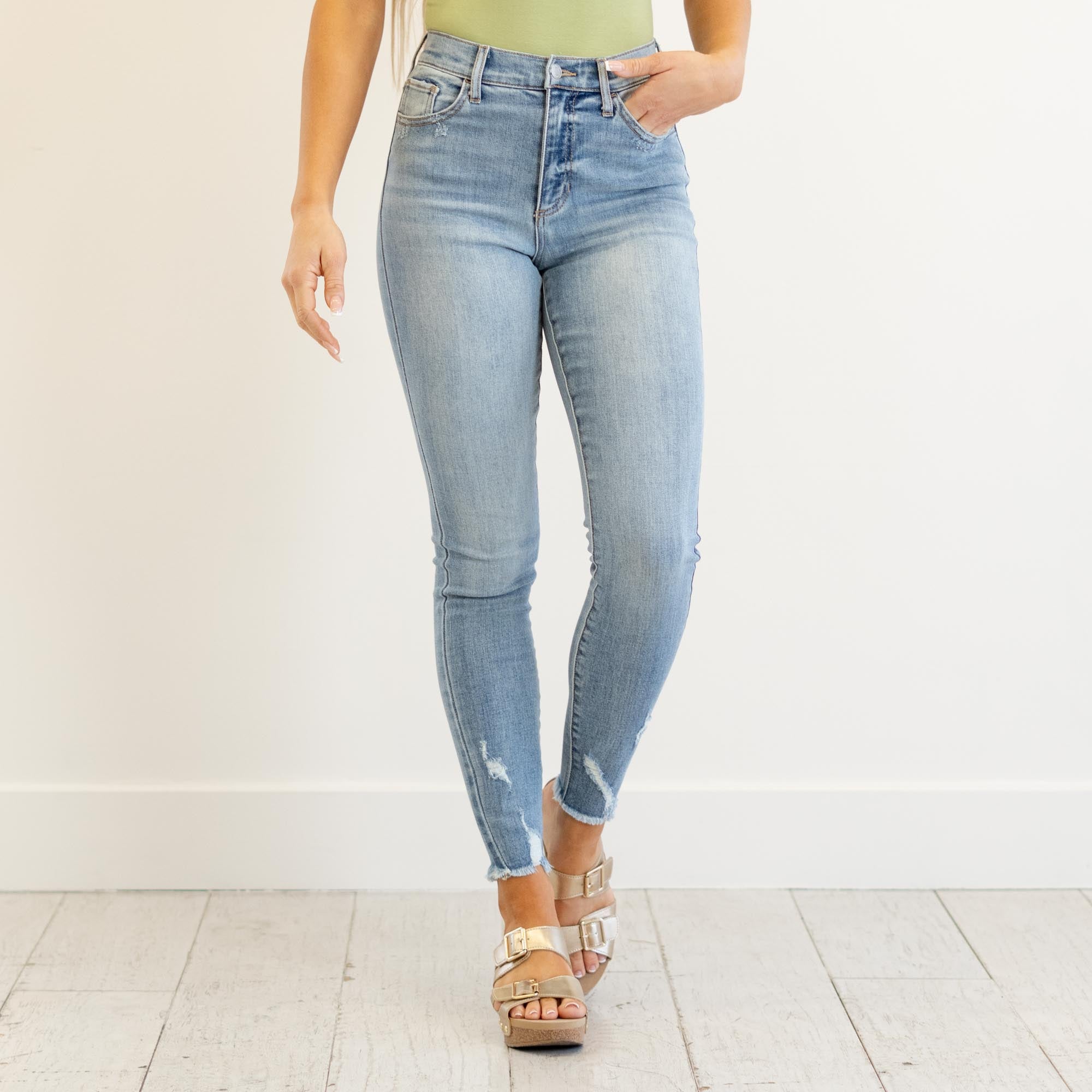 Meet your new go-to pair — the Mara High Rise Frayed Hem Skinny Jeans blend sleek style with everyday comfort. Crafted from a soft cotton-blend denim with the perfect amount of stretch, these jeans sculpt your shape while allowing easy movement. The medium wash gives them that effortlessly lived-in look, while the frayed hem adds a playful touch of edge.
