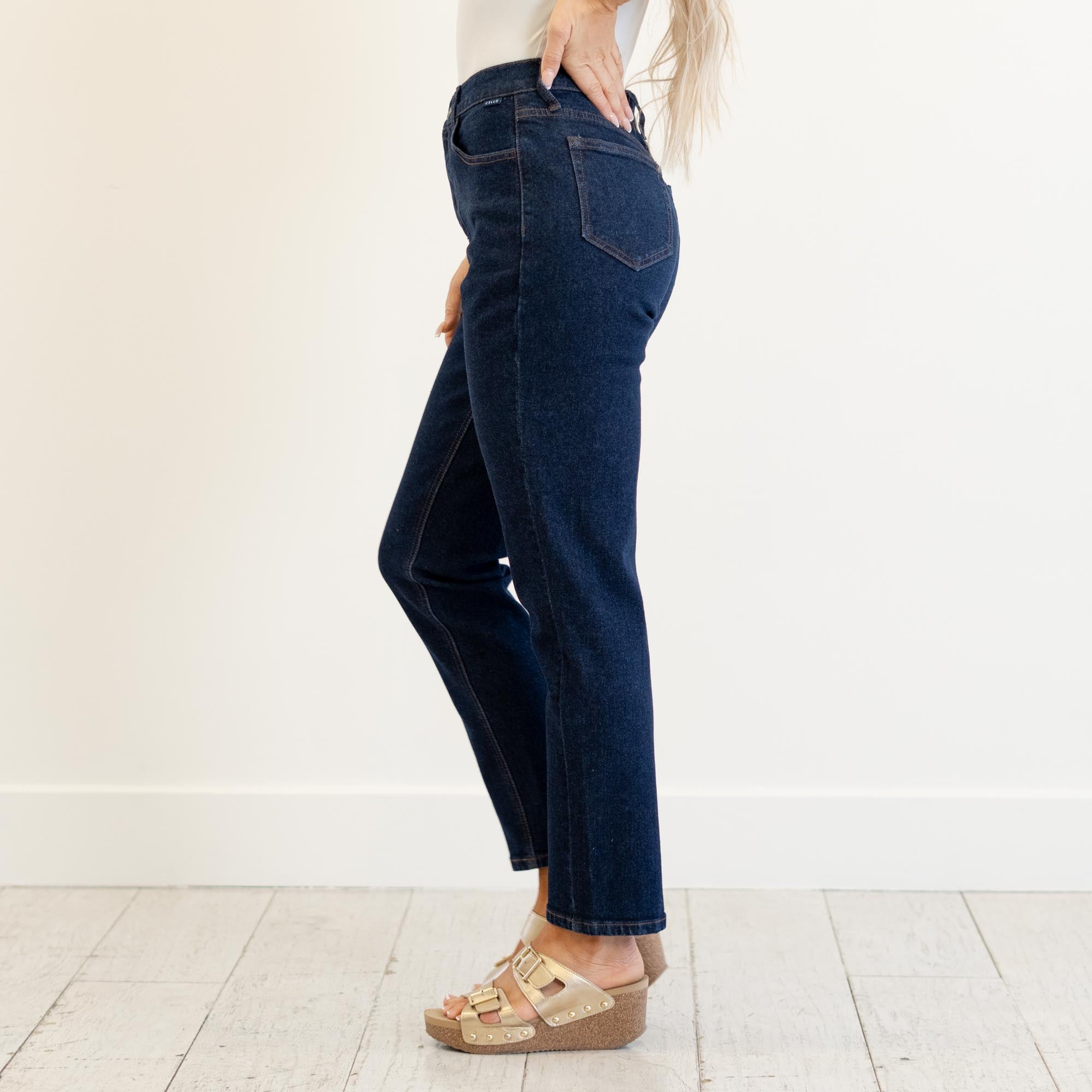 Meet your new everyday essential — the Arden High Rise Straight Jeans. Designed in a rich dark blue wash, these jeans bring effortless polish to your denim collection. The high-rise waist flatters your figure while the straight-leg cut offers a timeless, versatile silhouette that transitions seamlessly from day to night.