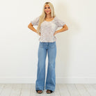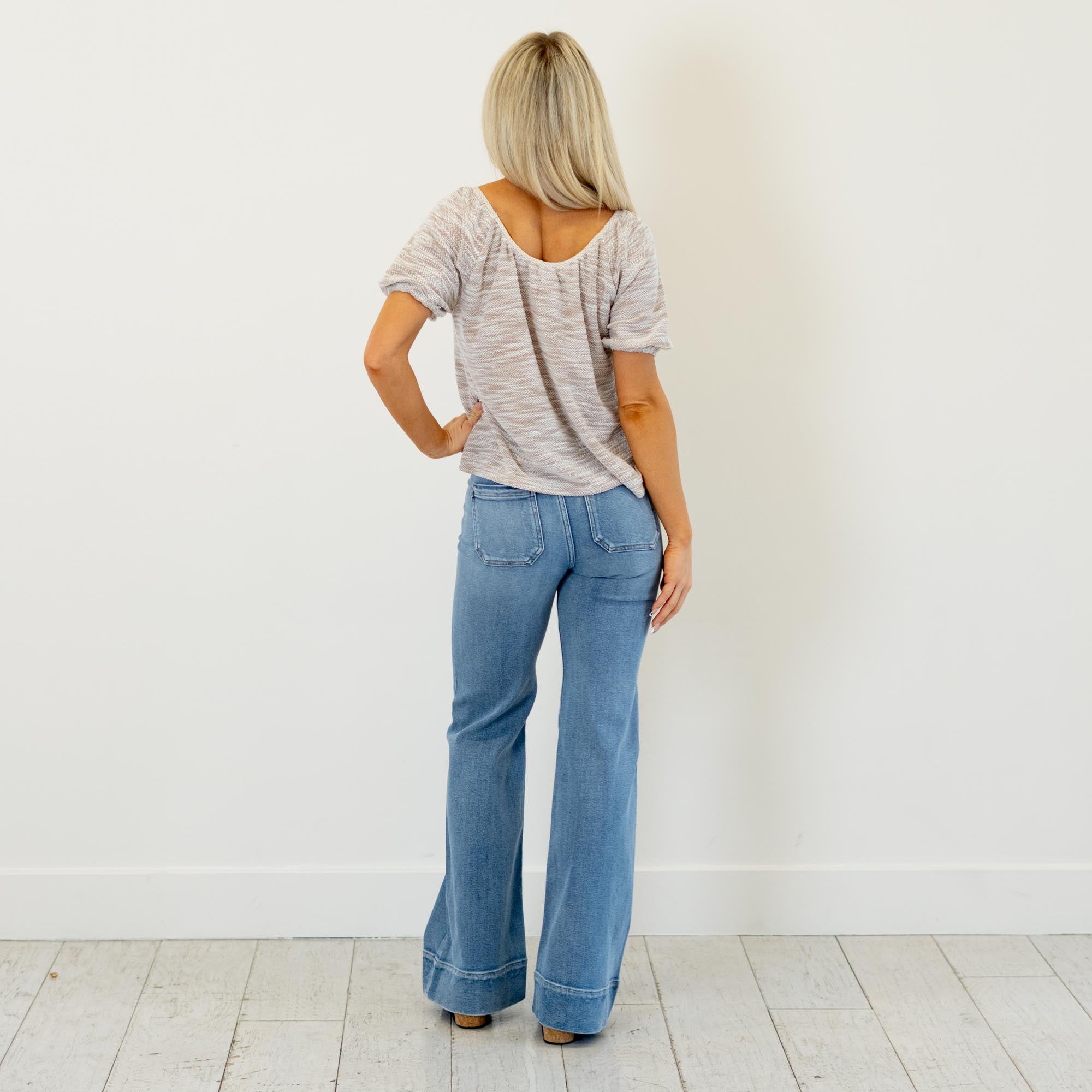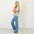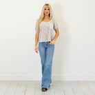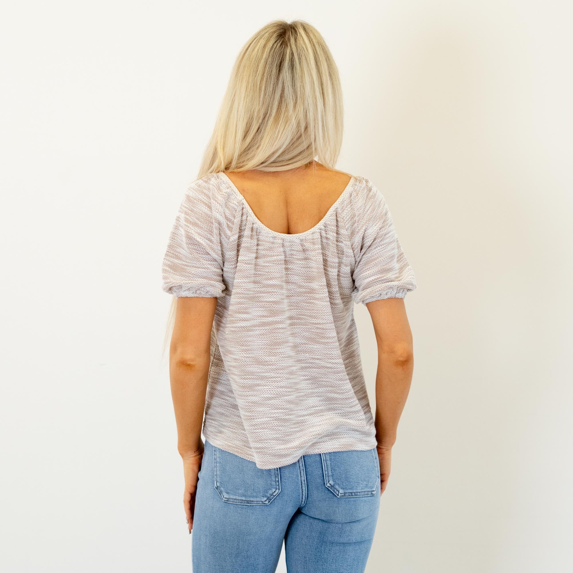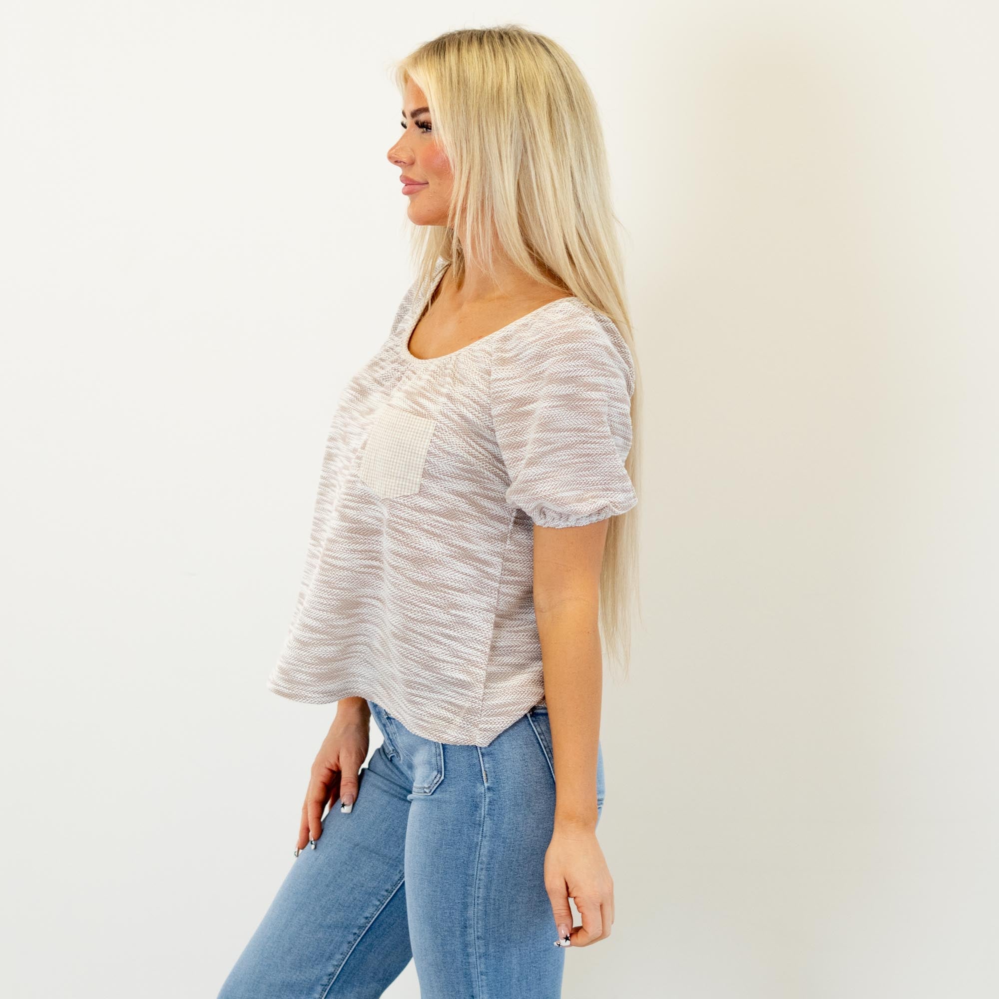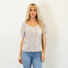 Soft and textured, this grey knit top features a deep round neckline and a plaid contrast pocket for a cozy, casual finish. Lightweight and easy to style, it’s the perfect everyday throw-on.