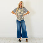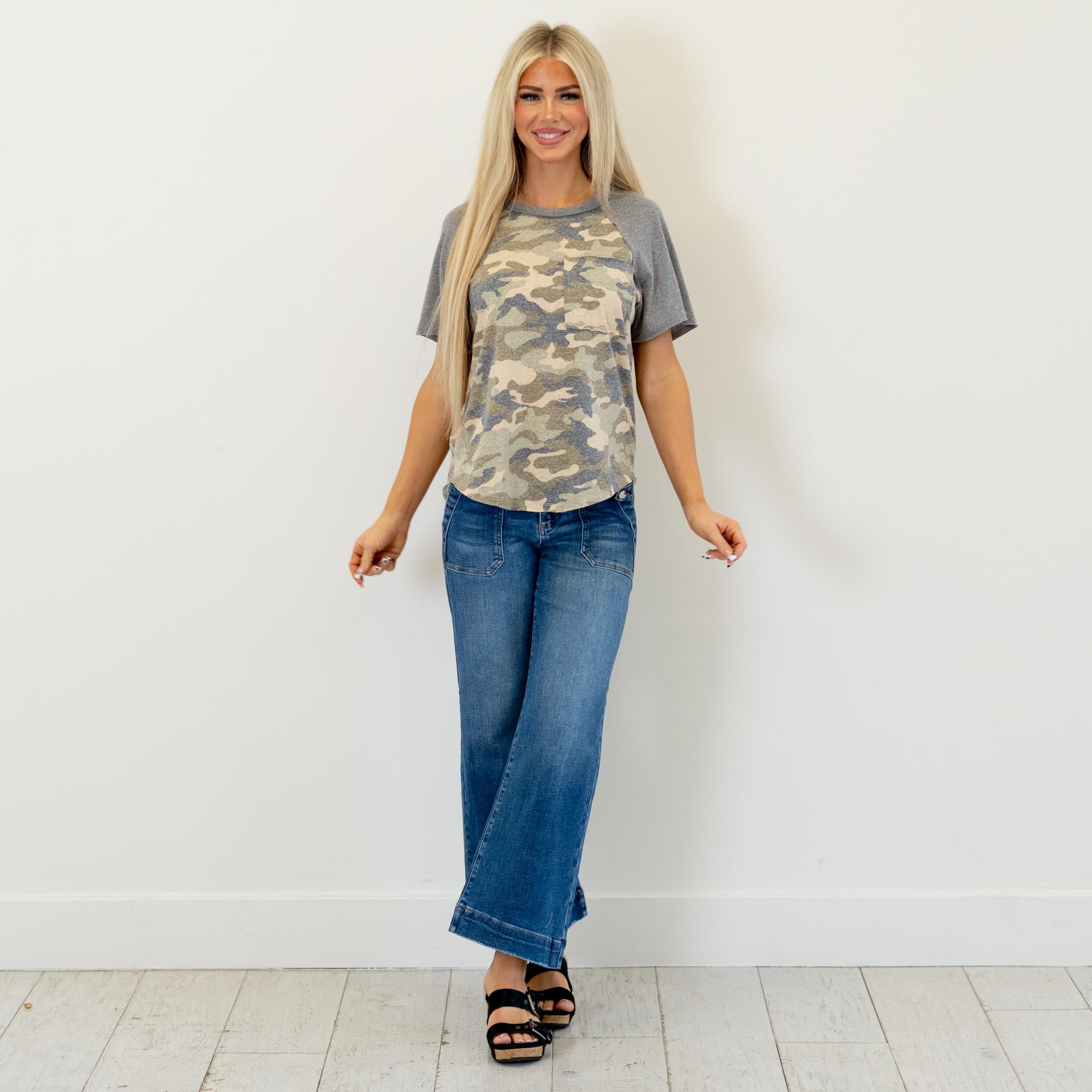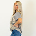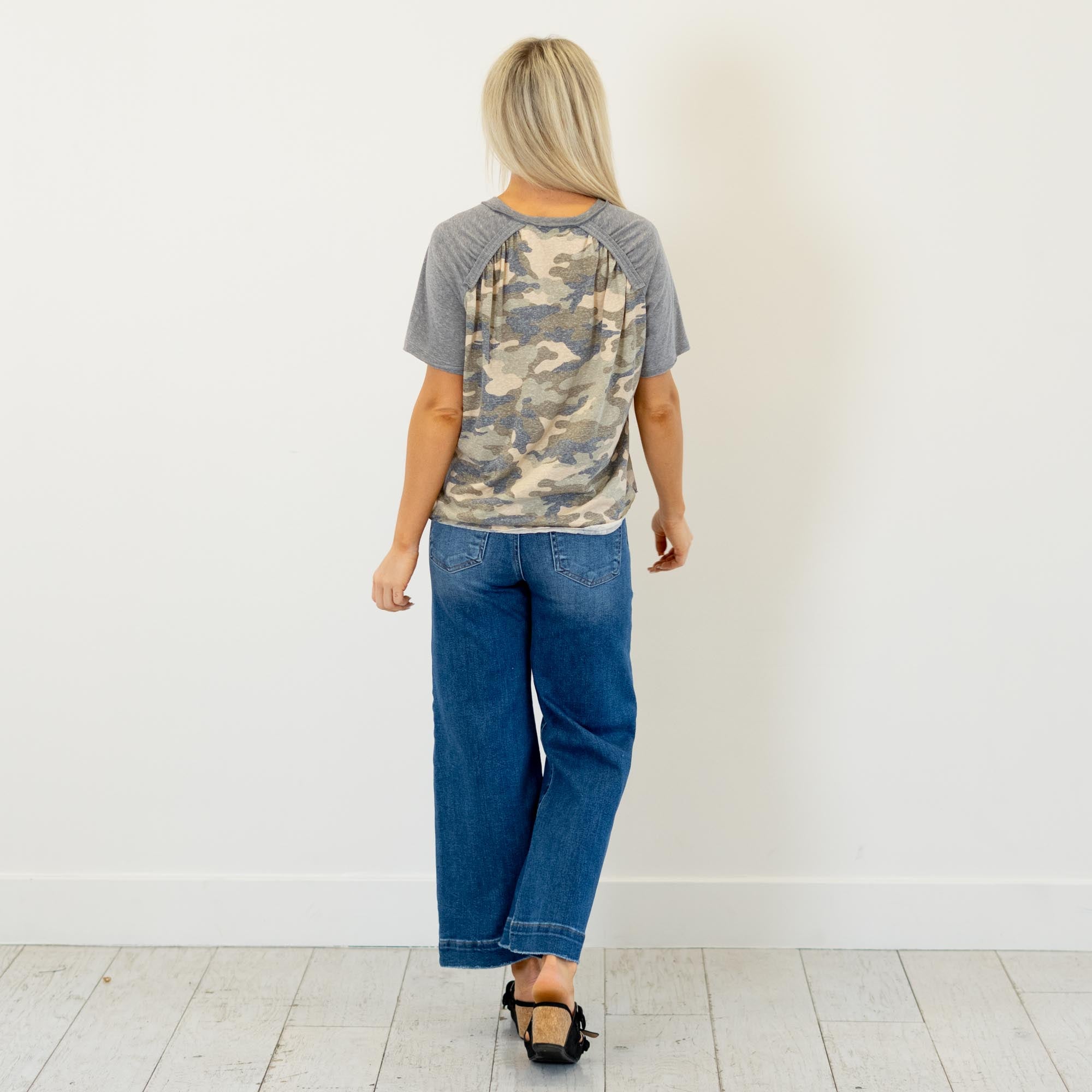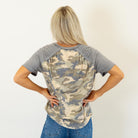 A soft, relaxed-fit baseball tee featuring a dusty olive camouflage print and contrasting raglan sleeves. Lightweight, easy to layer, and perfect for casual, everyday style.