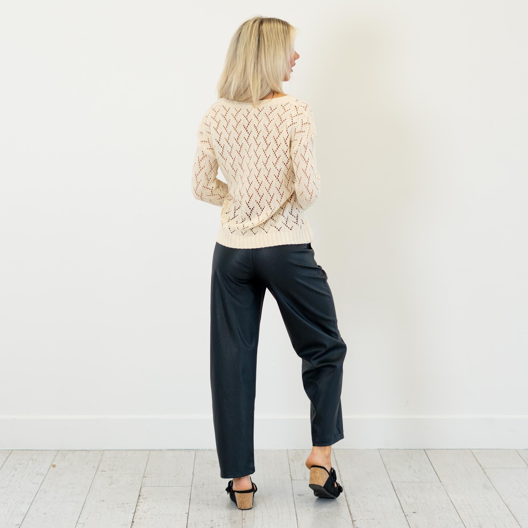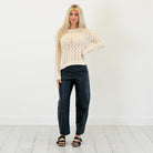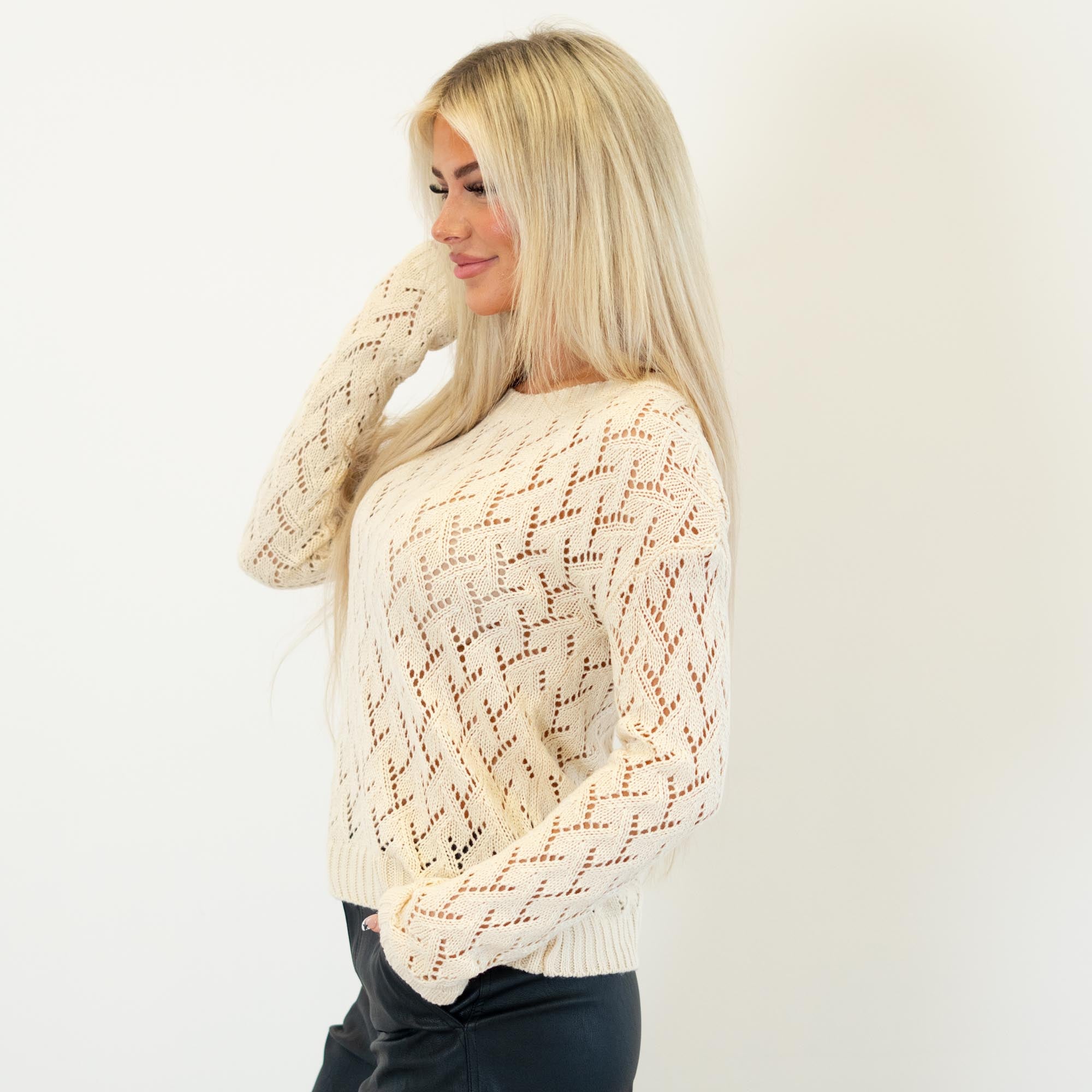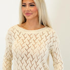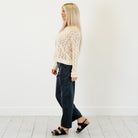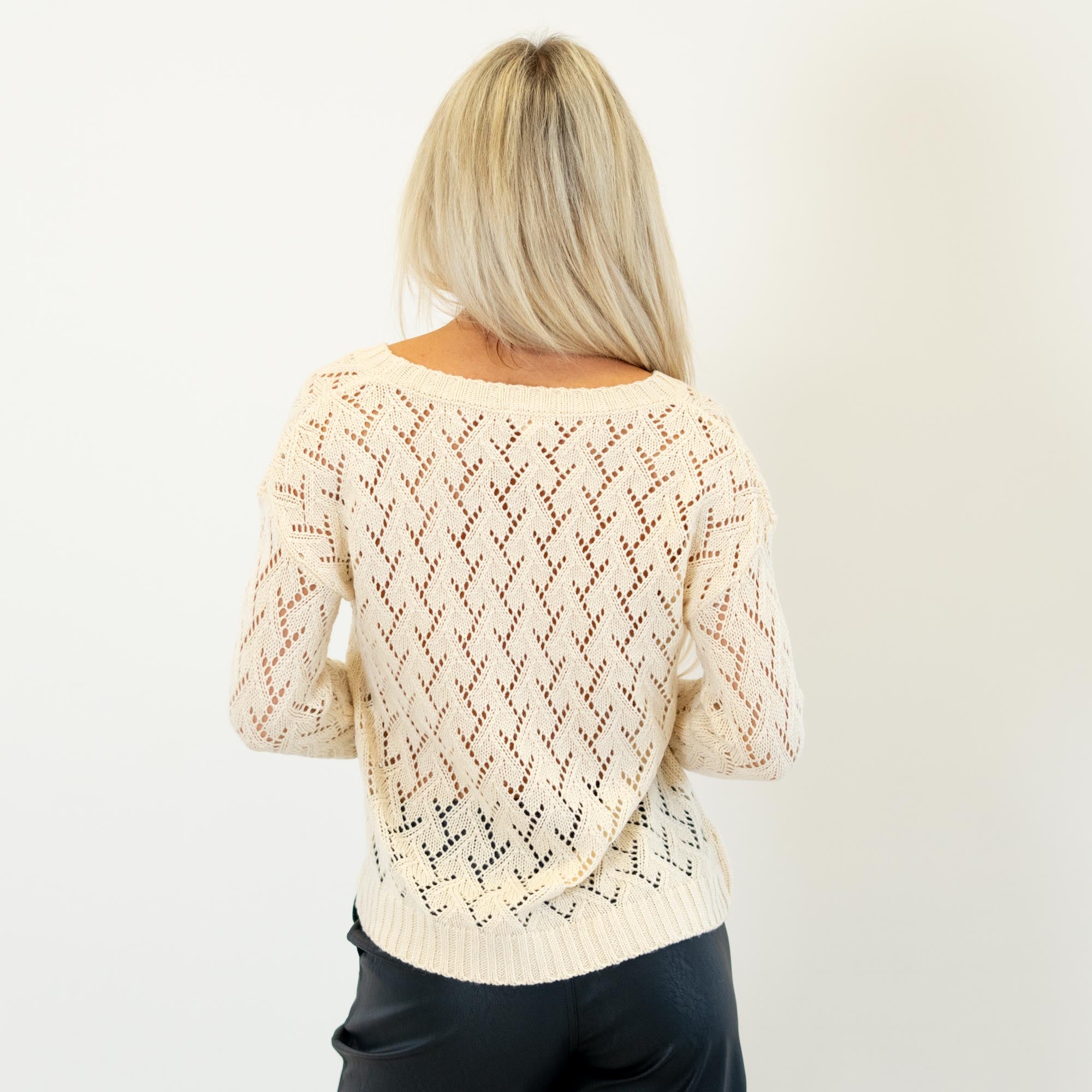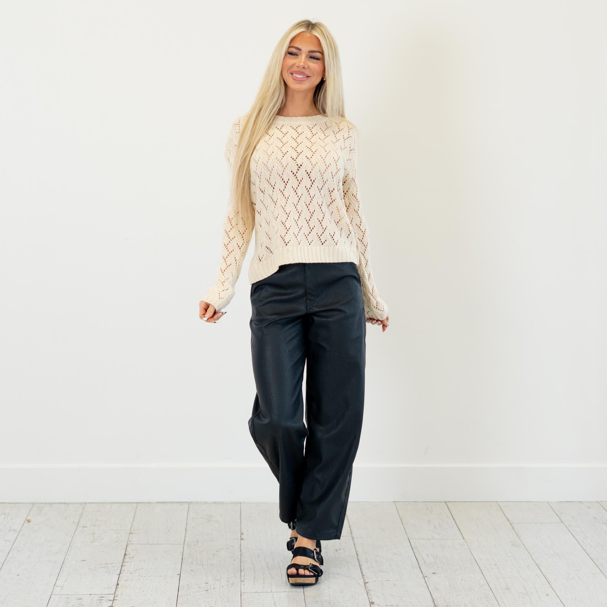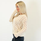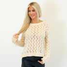 Soft and feminine, this cream pointelle sweater features a lightweight open-knit design with a cropped silhouette. Easy to layer and effortlessly chic, it’s the perfect cozy-meets-stylish piece for any season.
