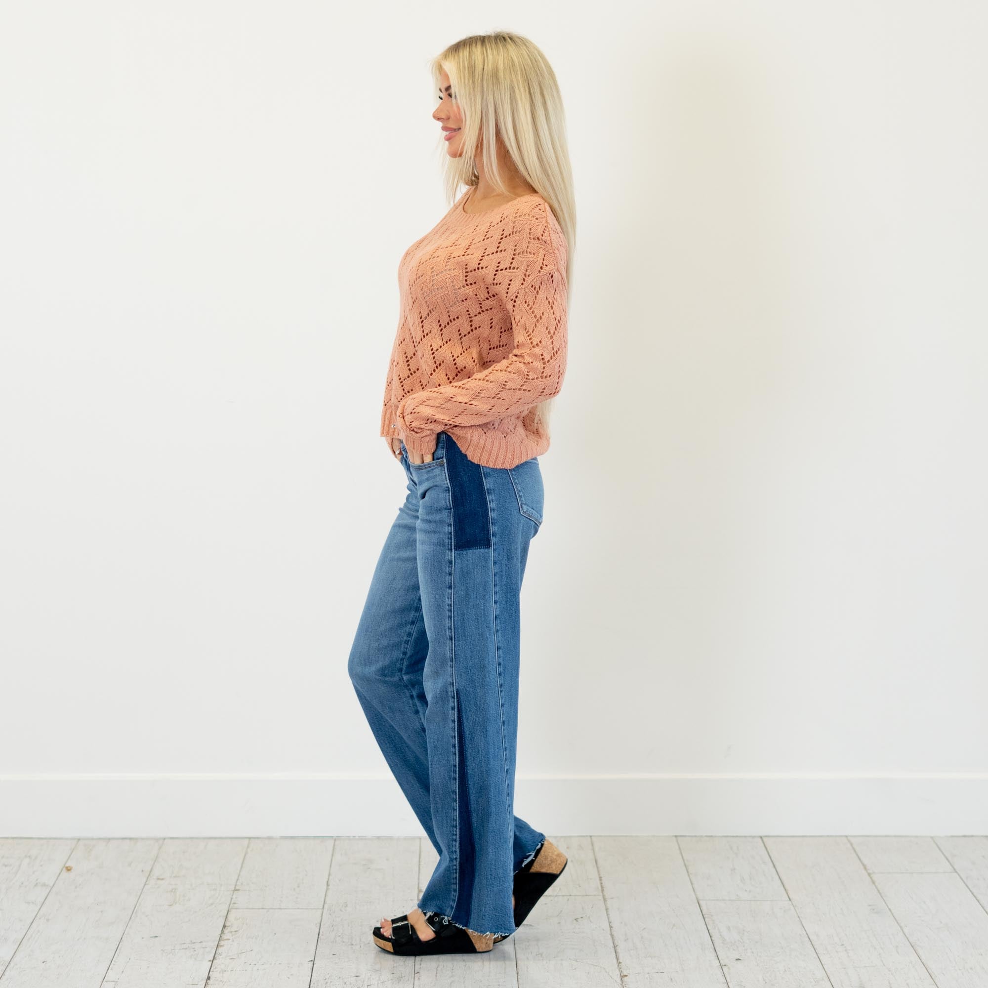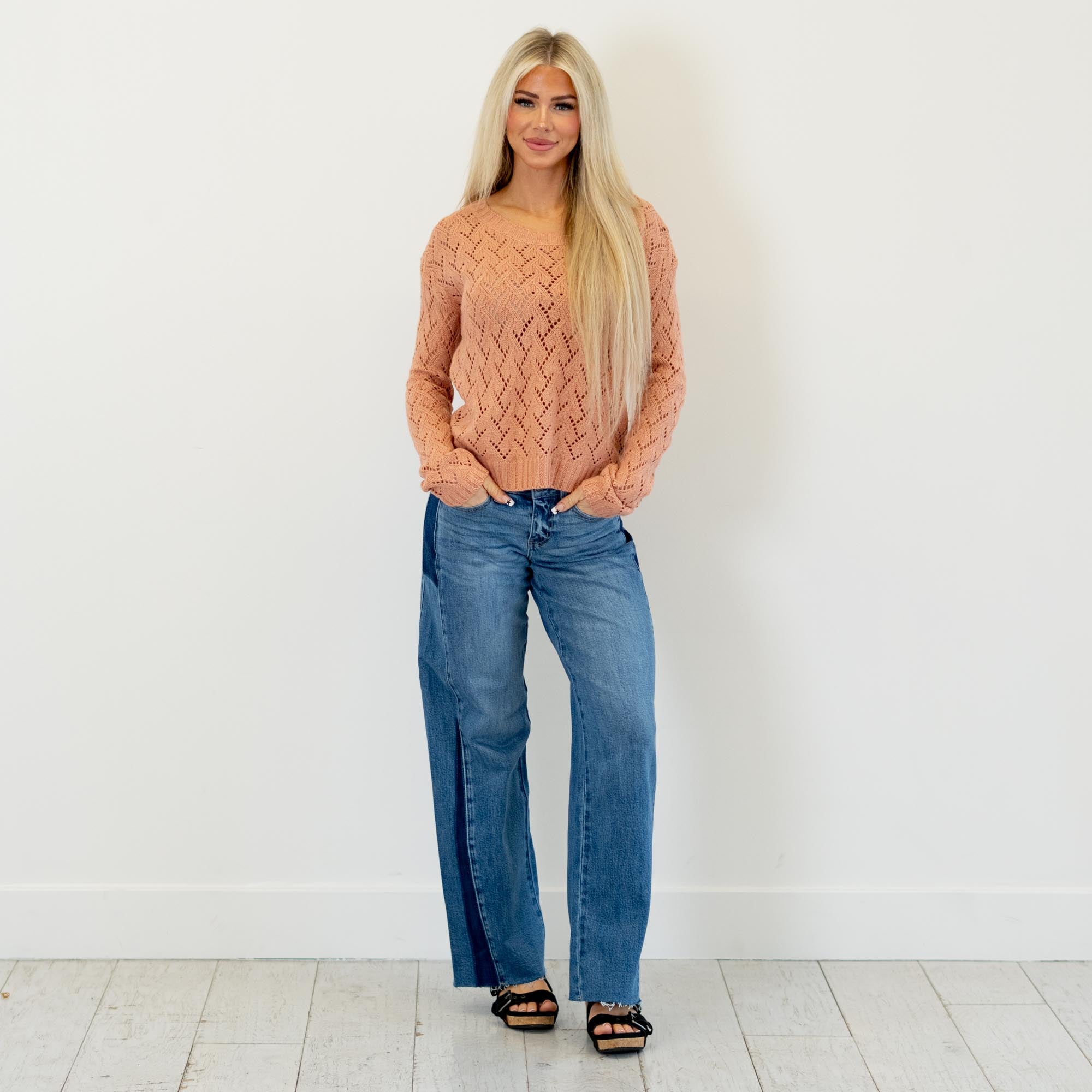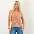 Soft and feminine, this cream pointelle sweater features a lightweight open-knit design with a cropped silhouette. Easy to layer and effortlessly chic, it’s the perfect cozy-meets-stylish piece for any season.