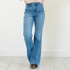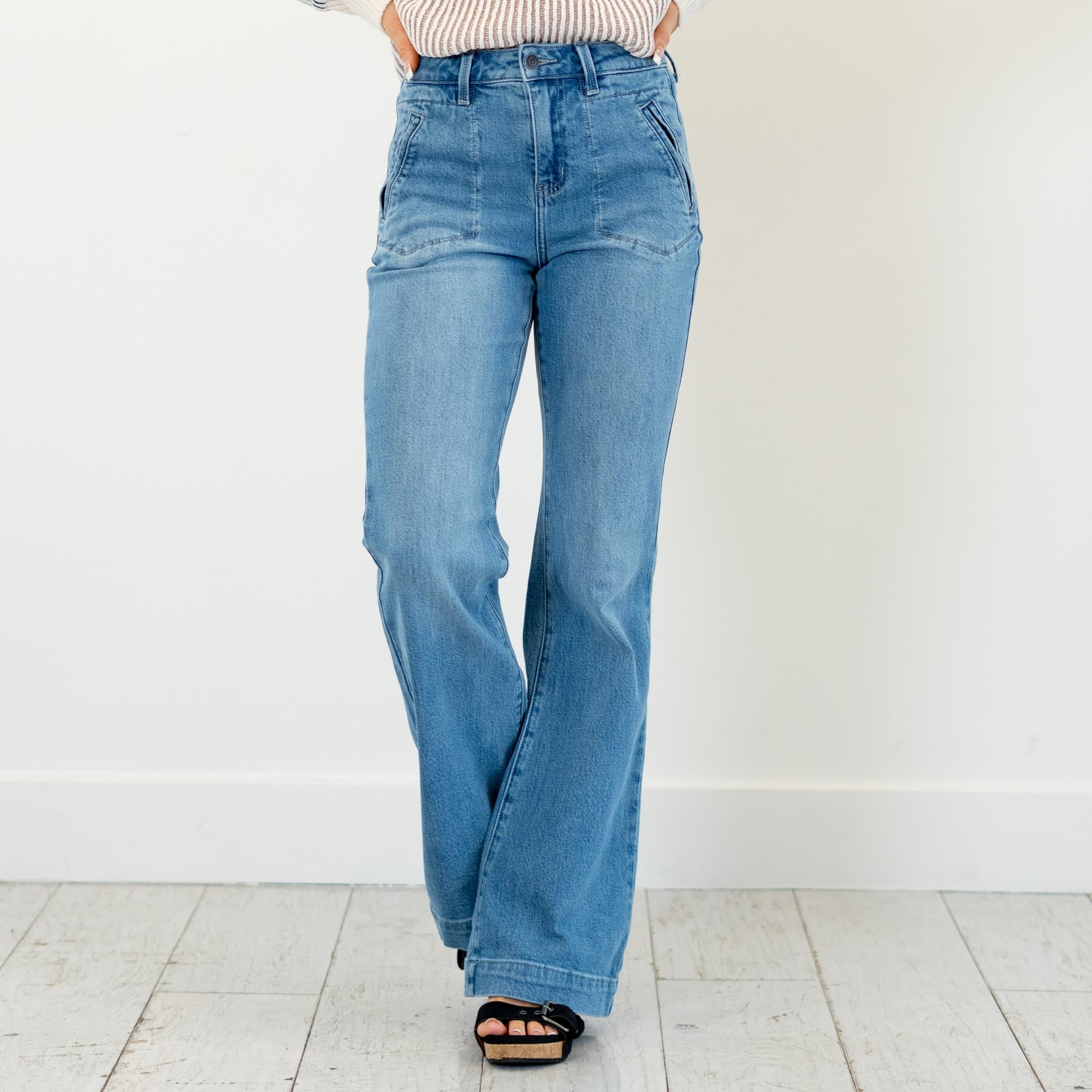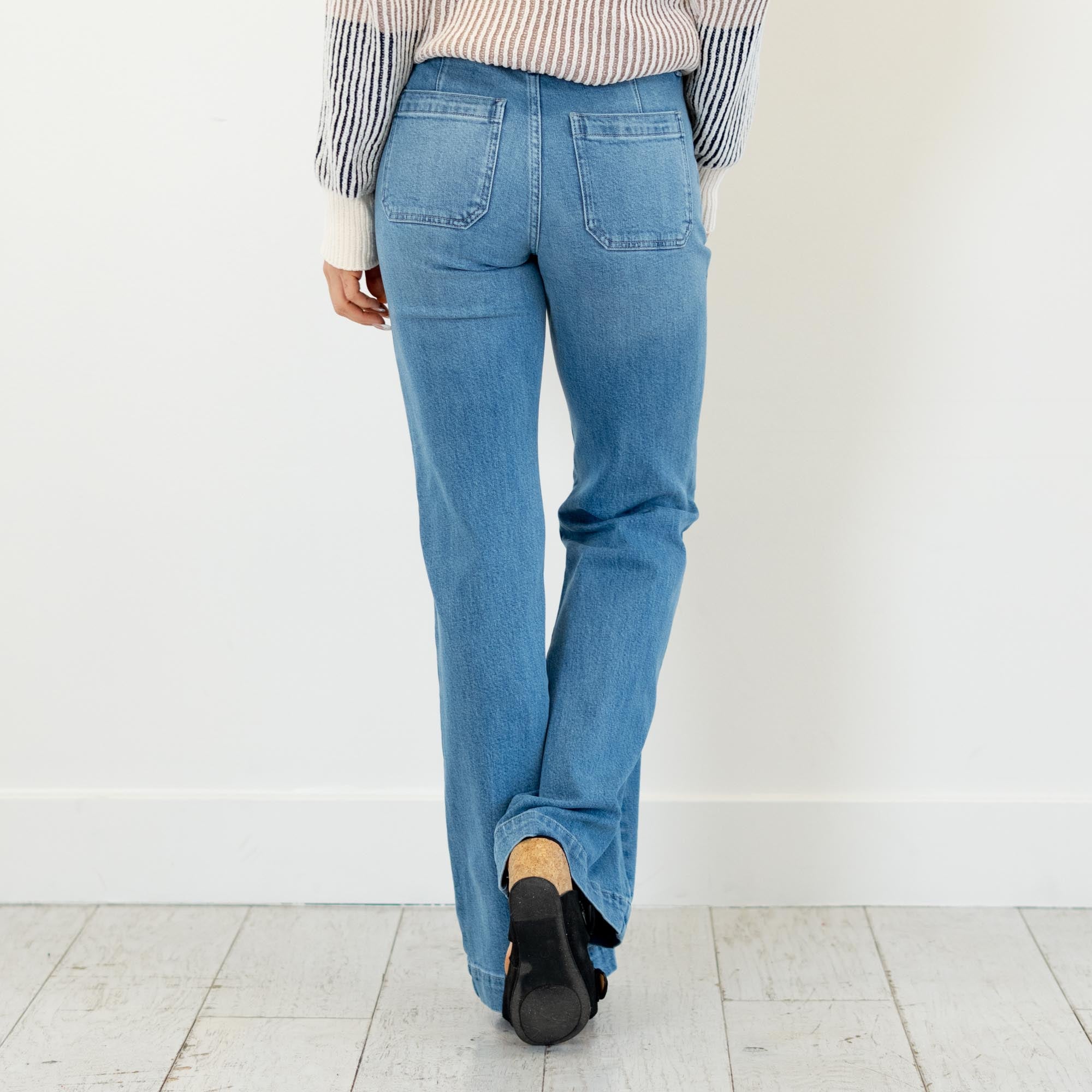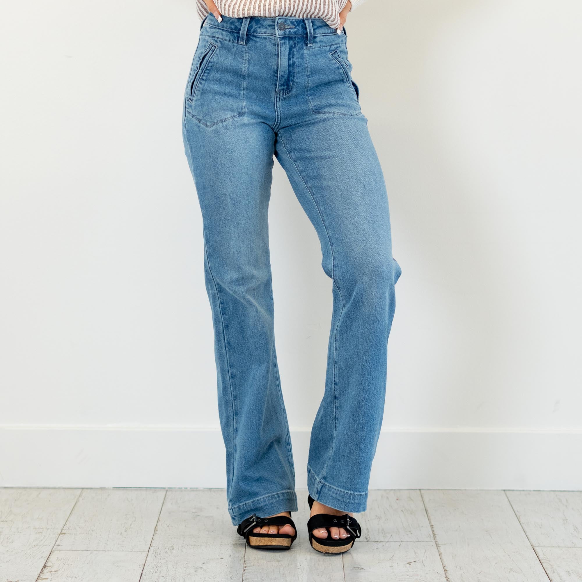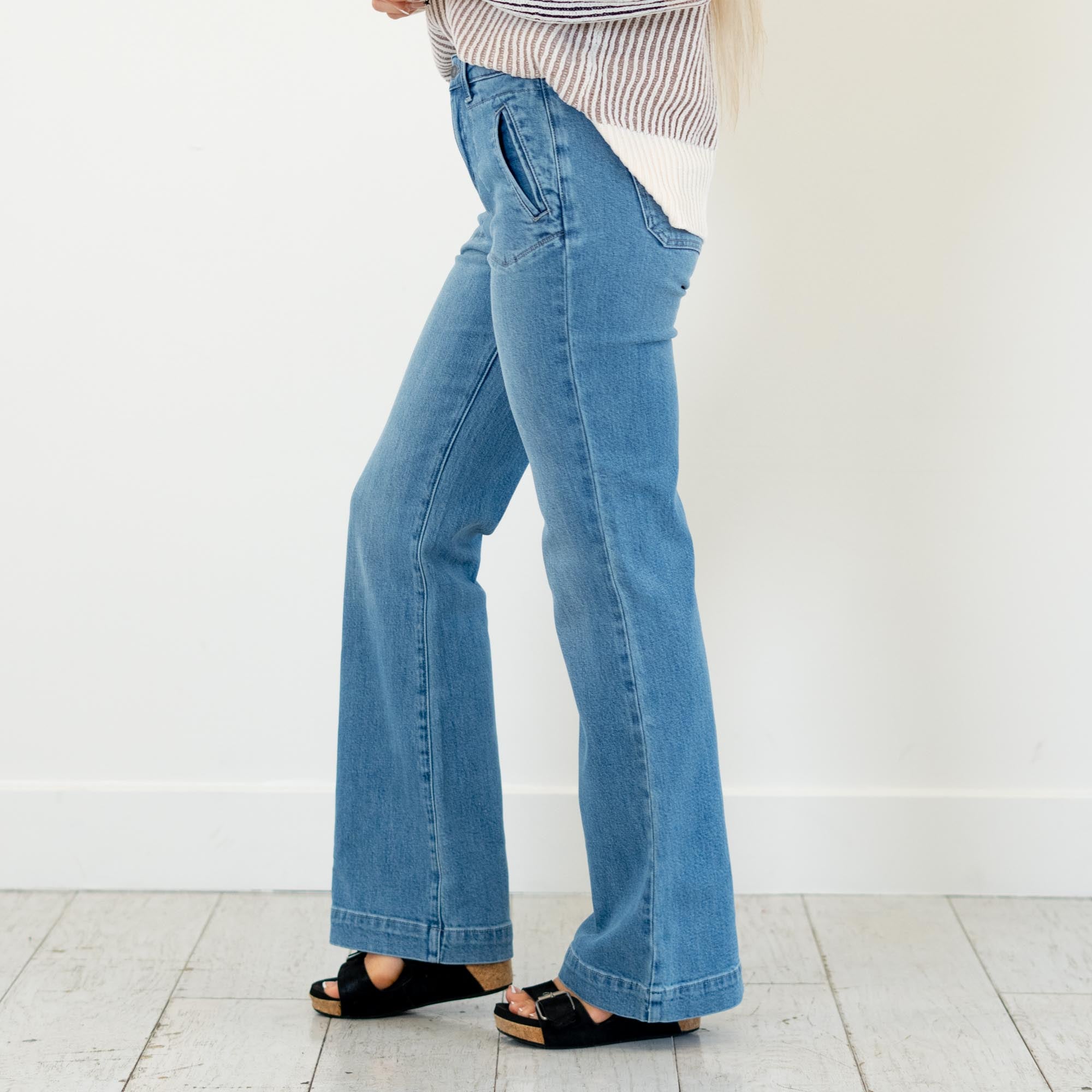 Soft‑drape flare in a medium‑dark wash, with trouser‑style pockets and tailored details—polished denim that flows with every step.