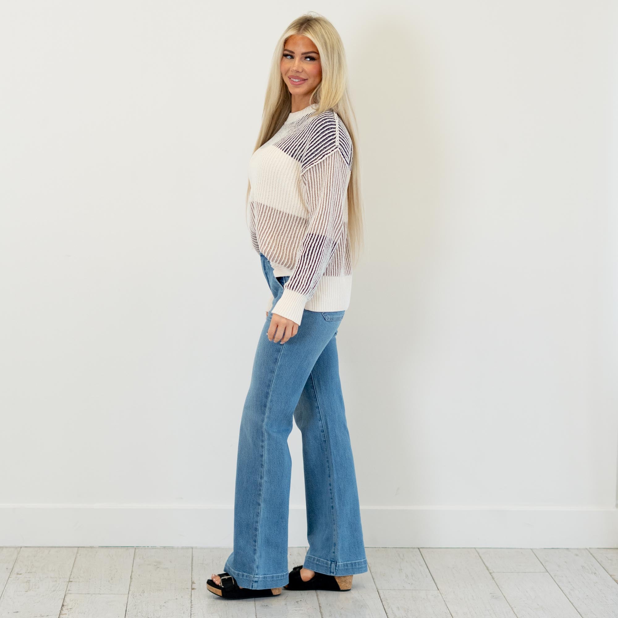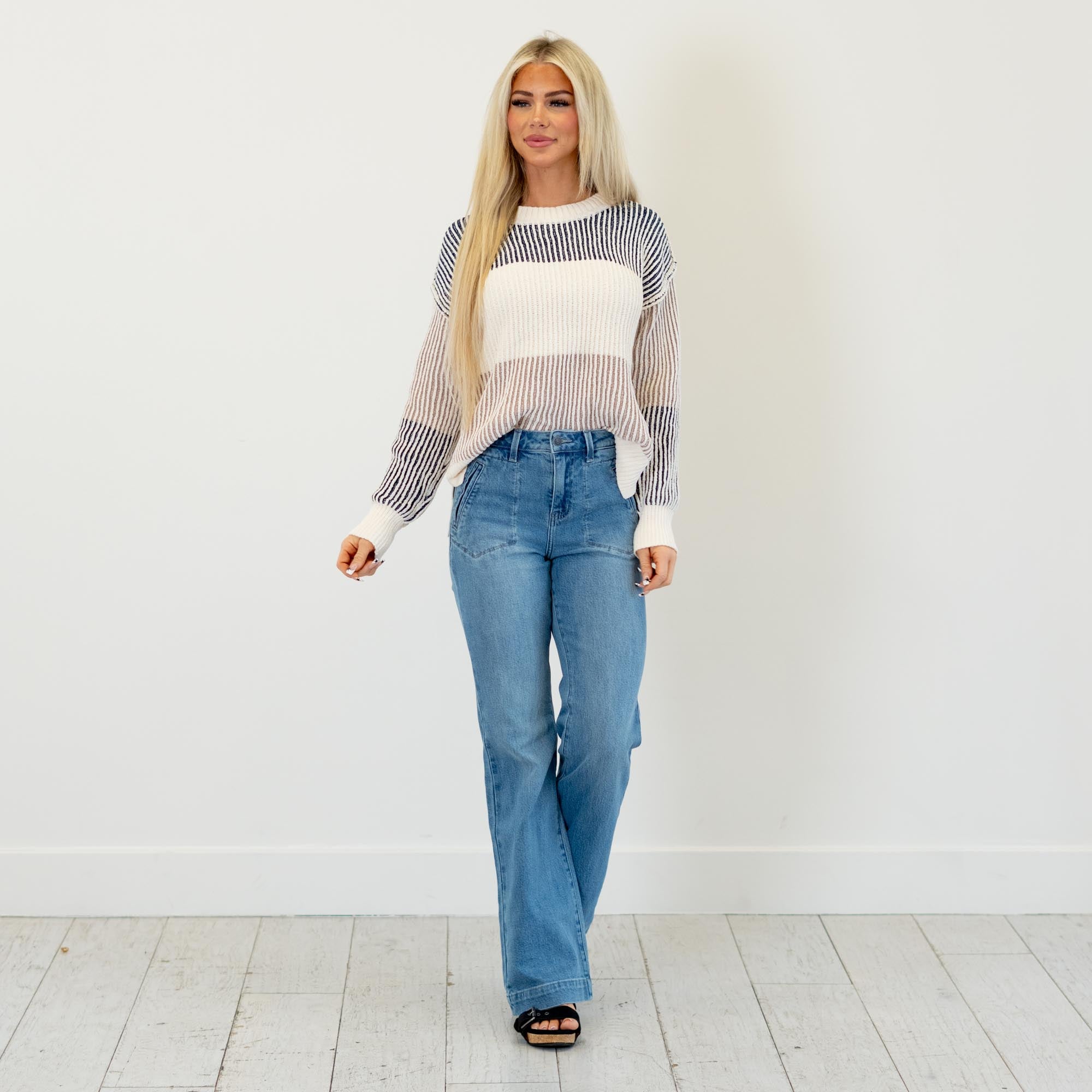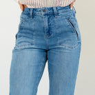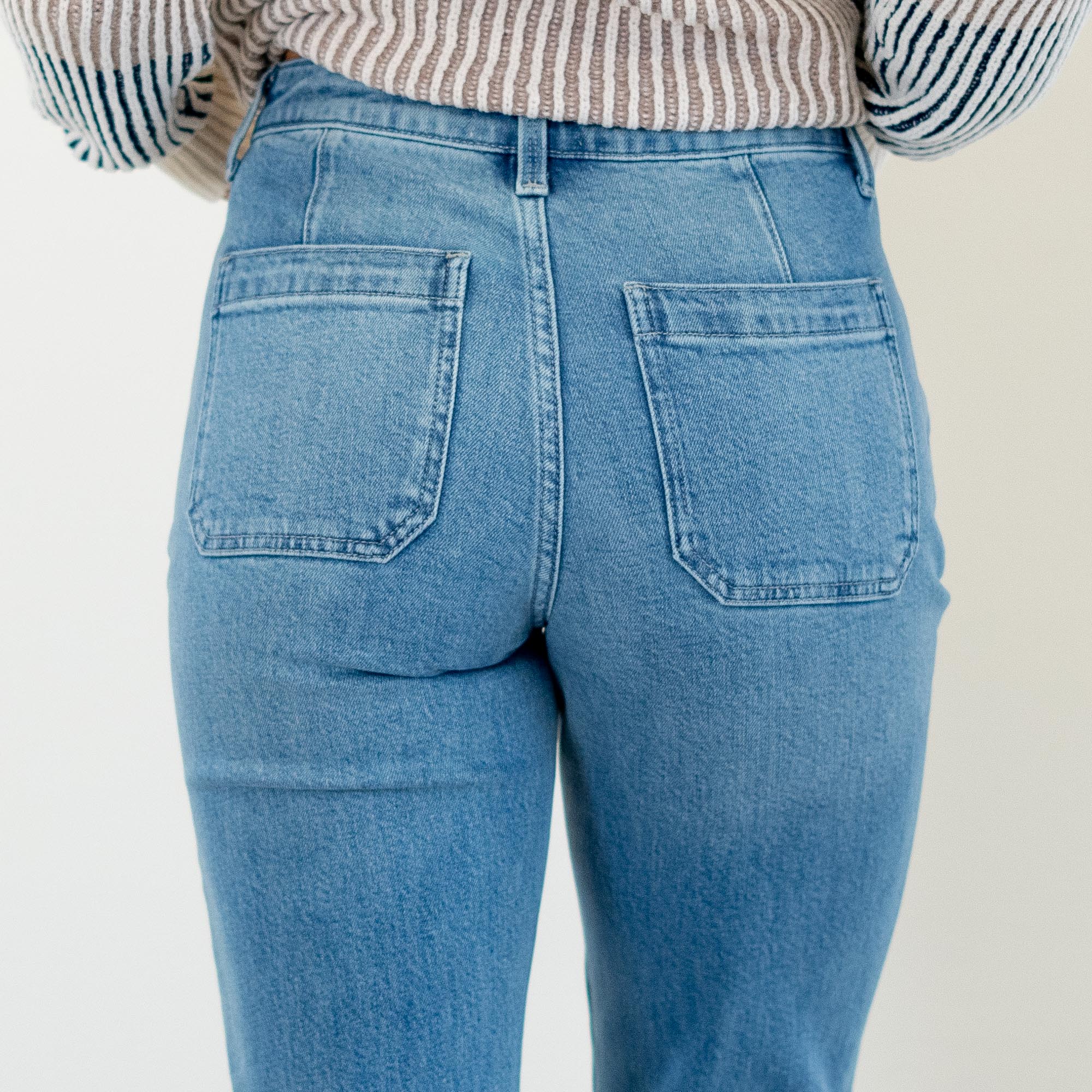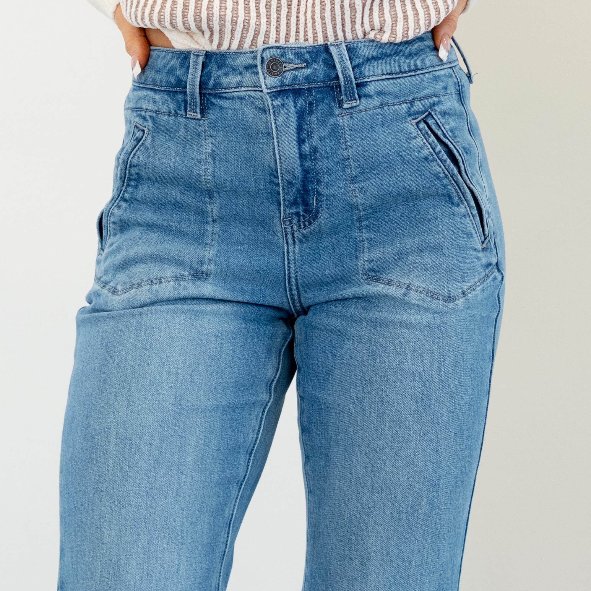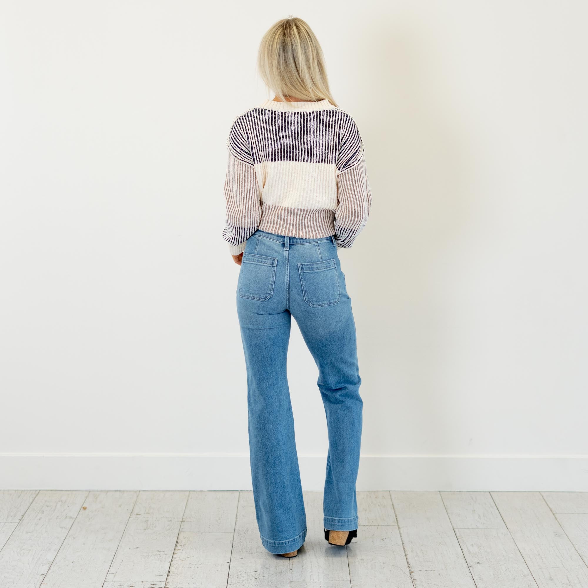Soft‑drape flare in a medium‑dark wash, with trouser‑style pockets and tailored details—polished denim that flows with every step.