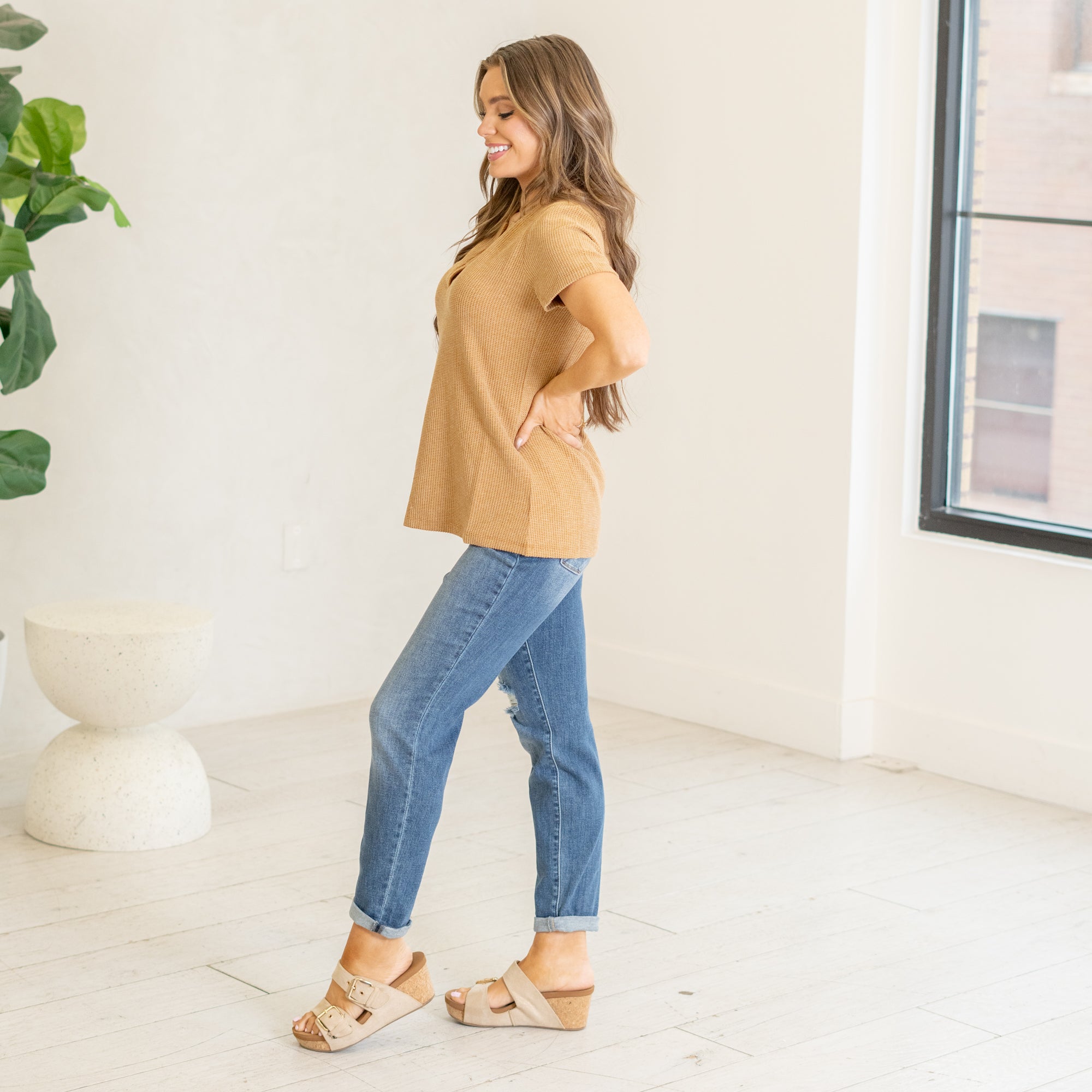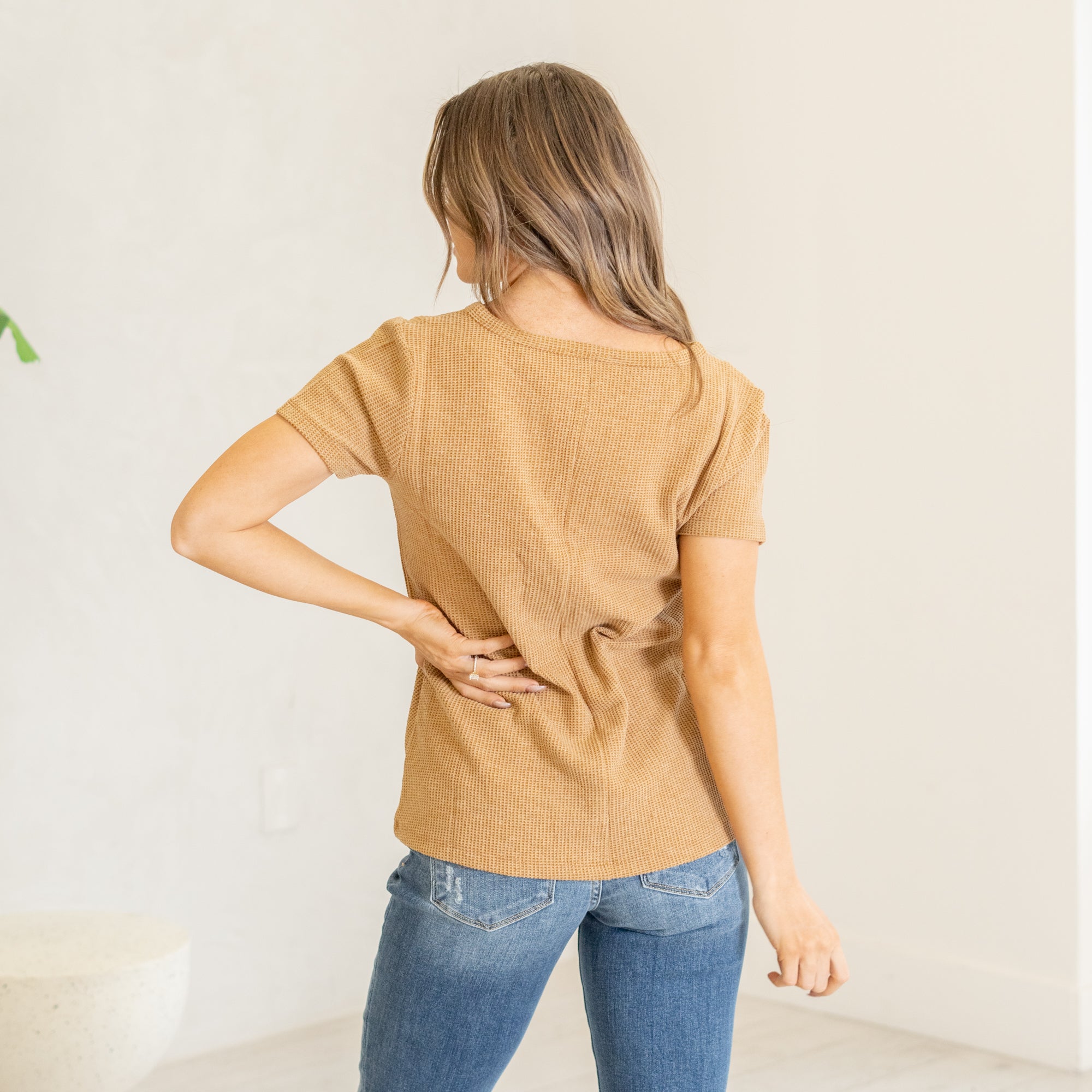 Melage baby waffle henley neck short sleeve top Deep Camel
