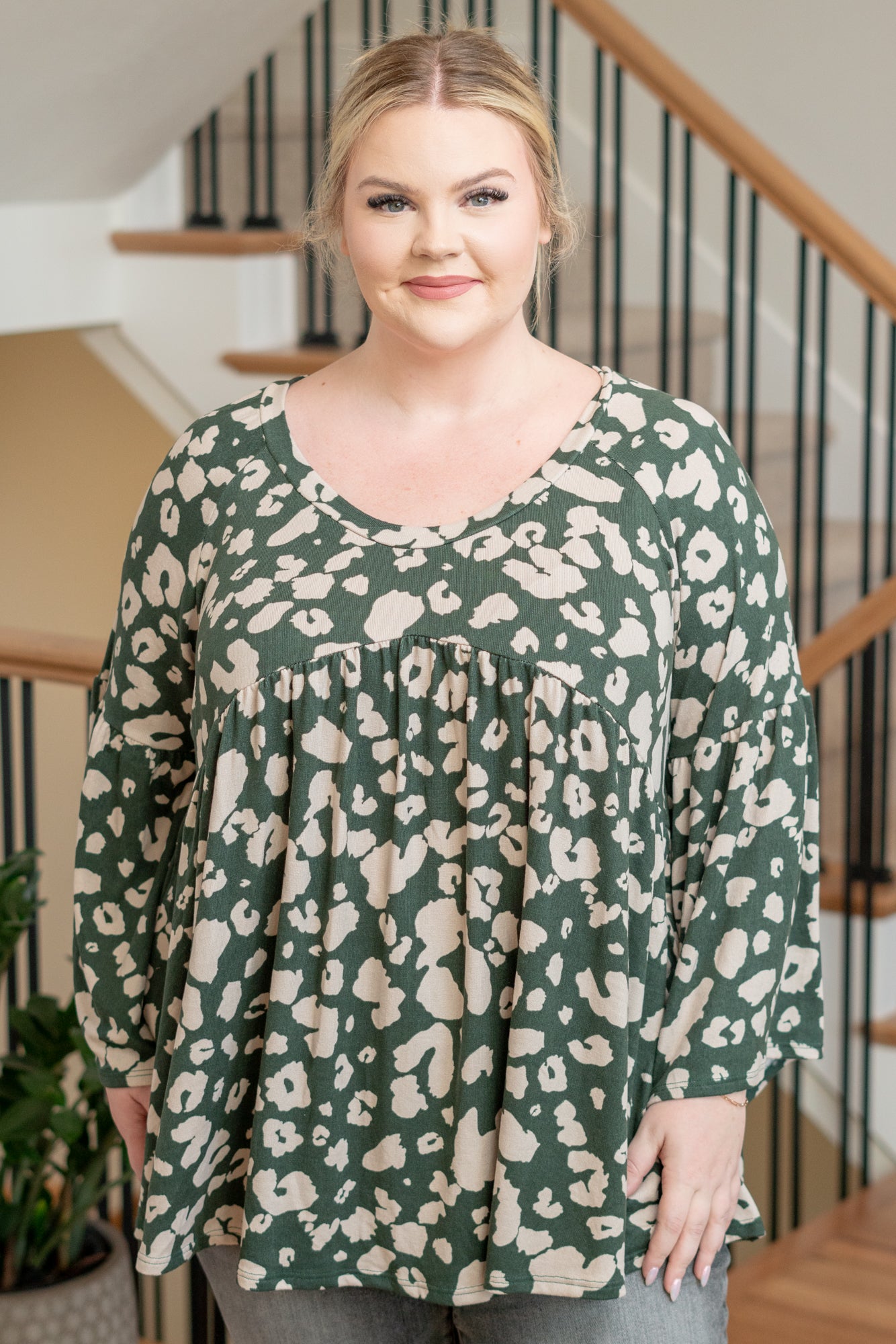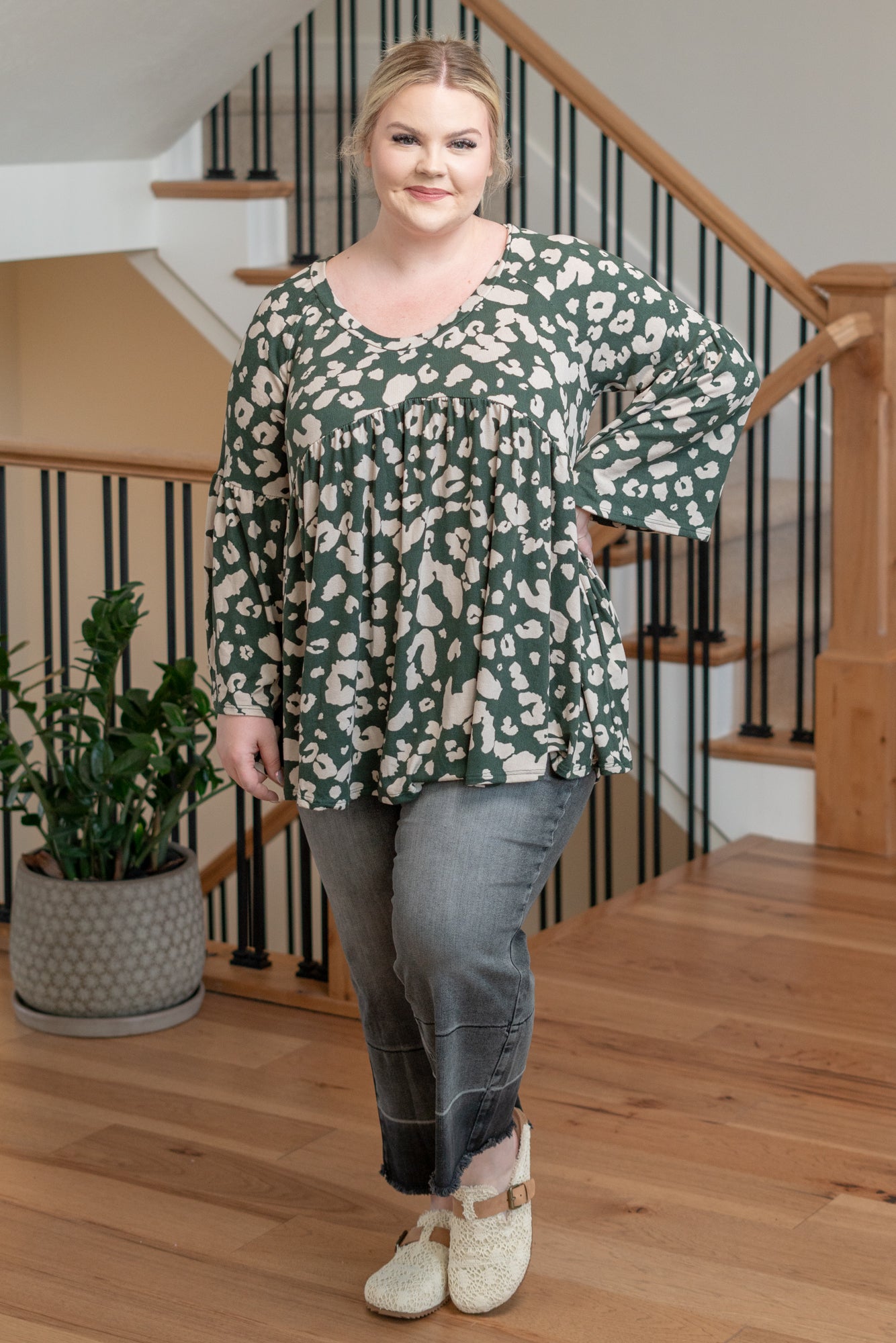 Plus Size Leopard Print Bell Sleeve Top - Green