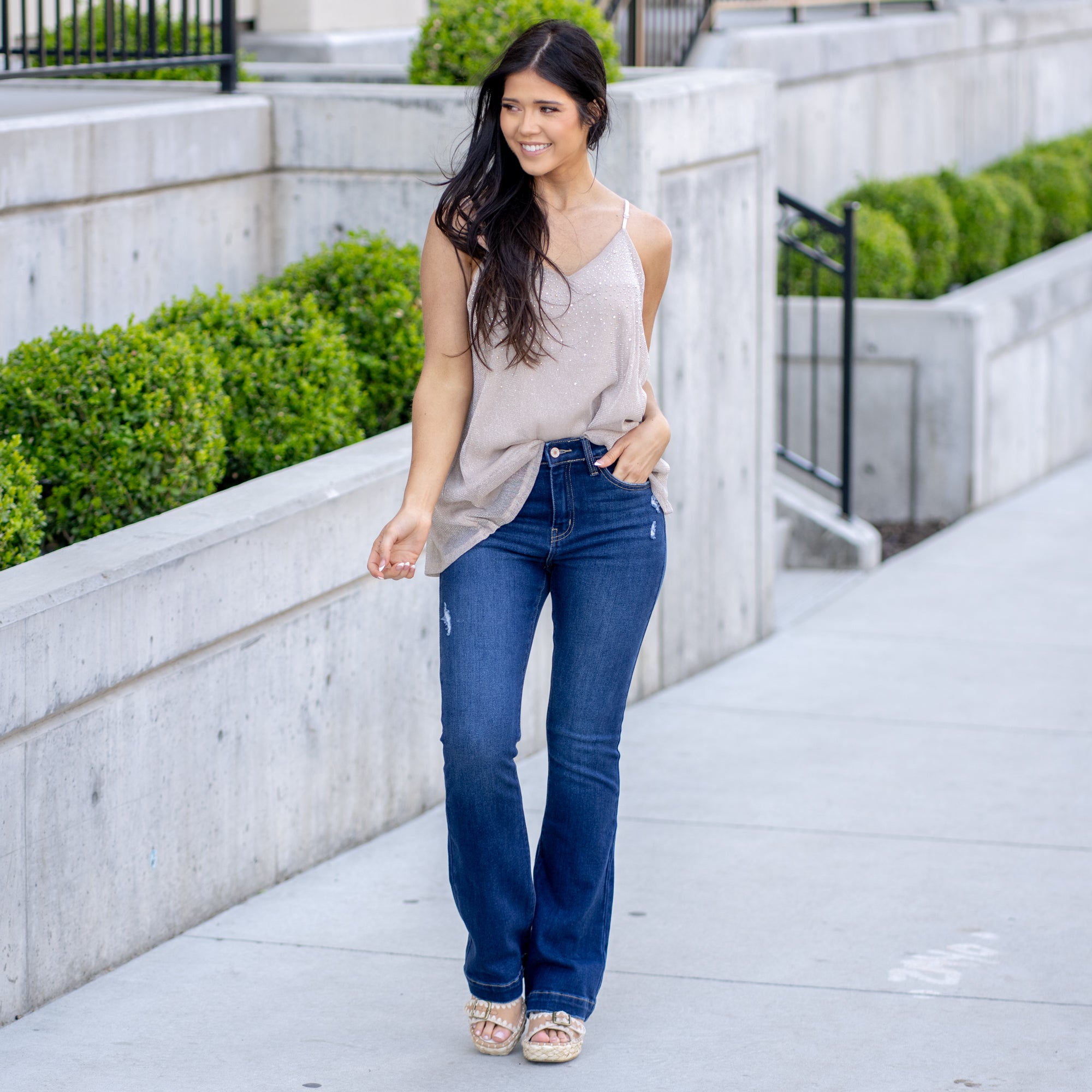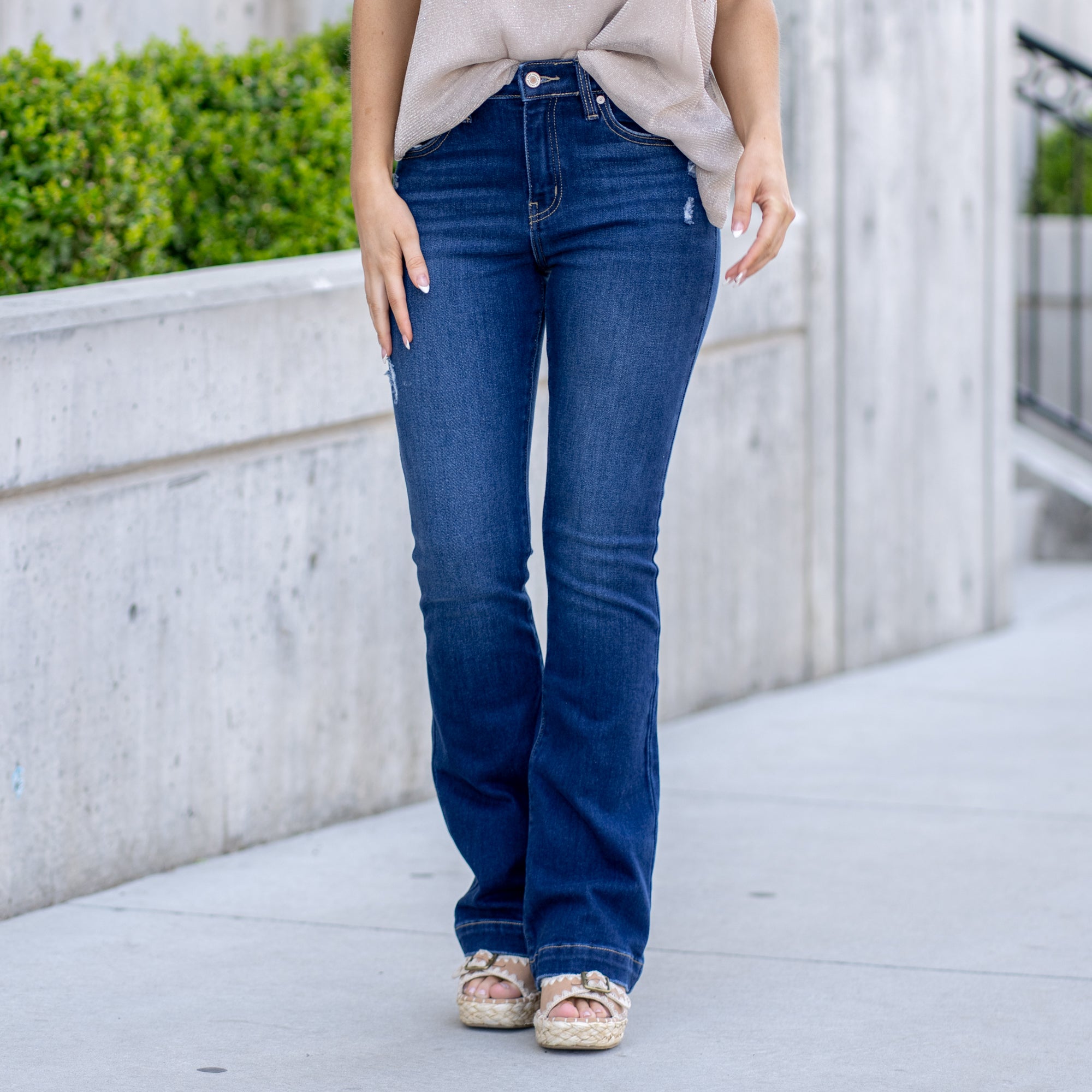 Don't be afraid to wear boot cuts again, not when they look this good! These high-rise jeans hit exactly the right spot on your waist and with some spandex, these will stretch as you wear them and get super comfy!