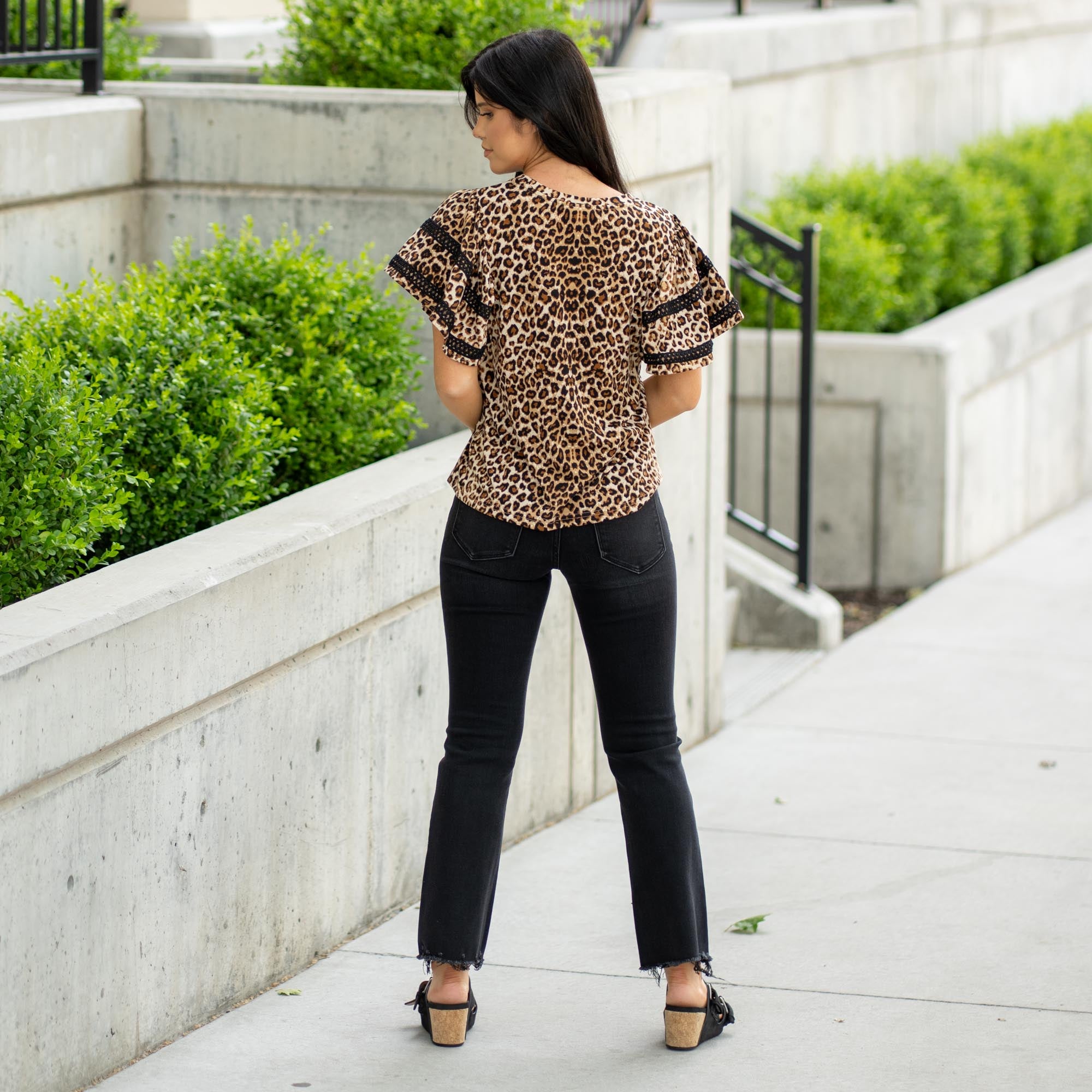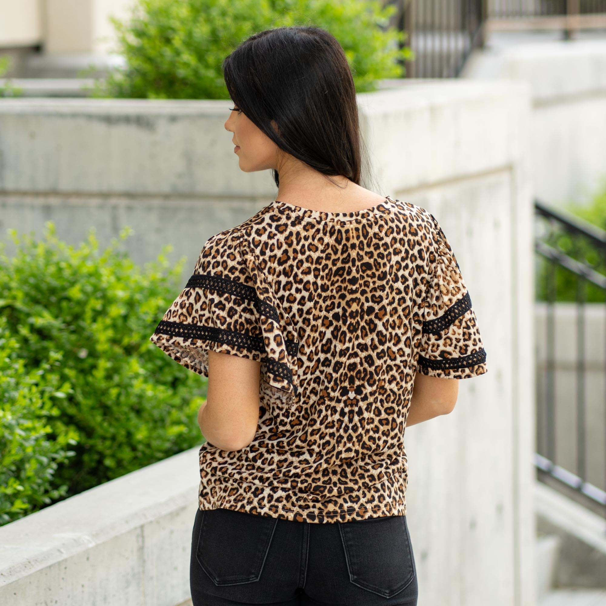 Leopard Jersey Crochet Trim Shrring Sleeves Top