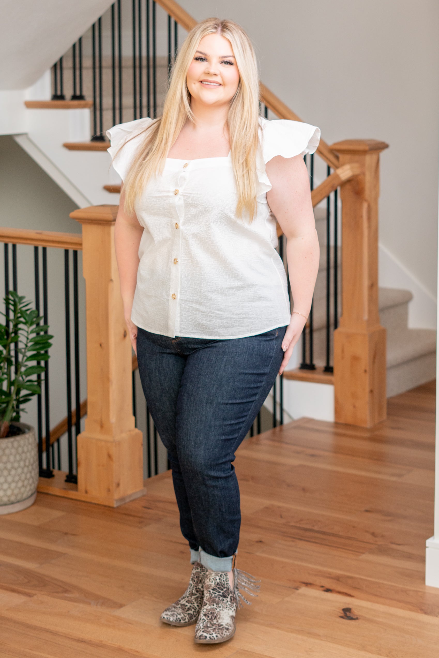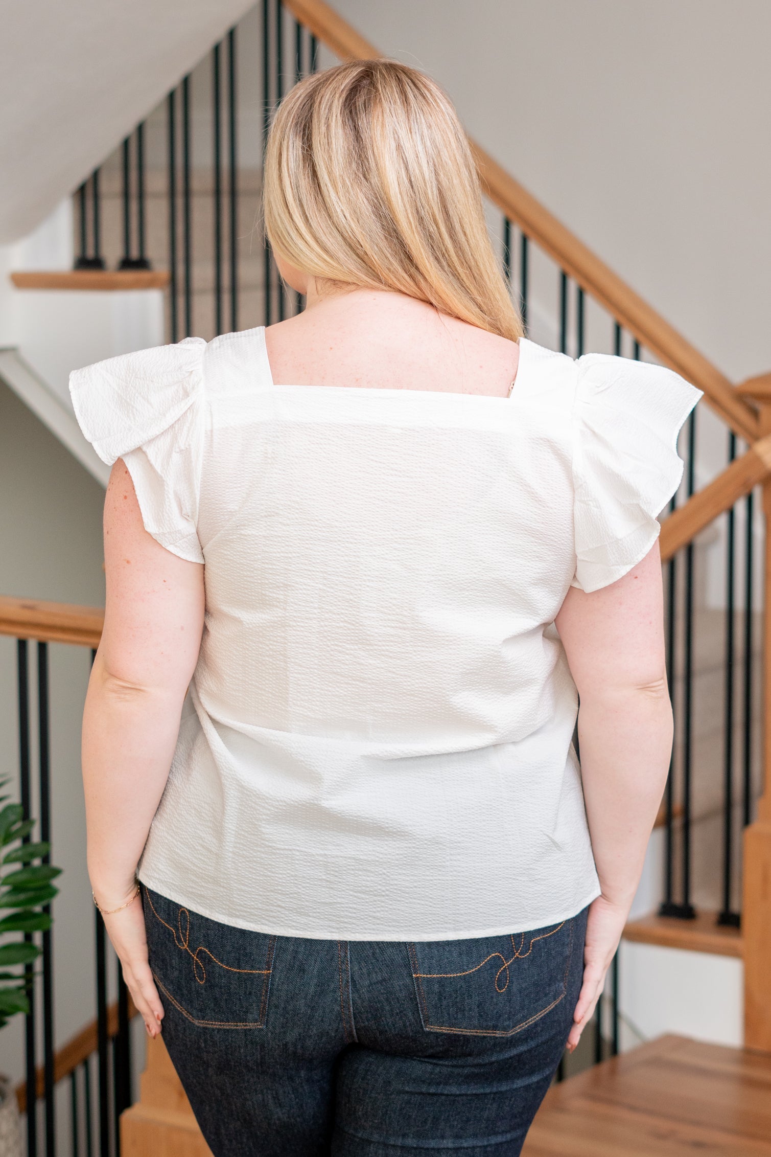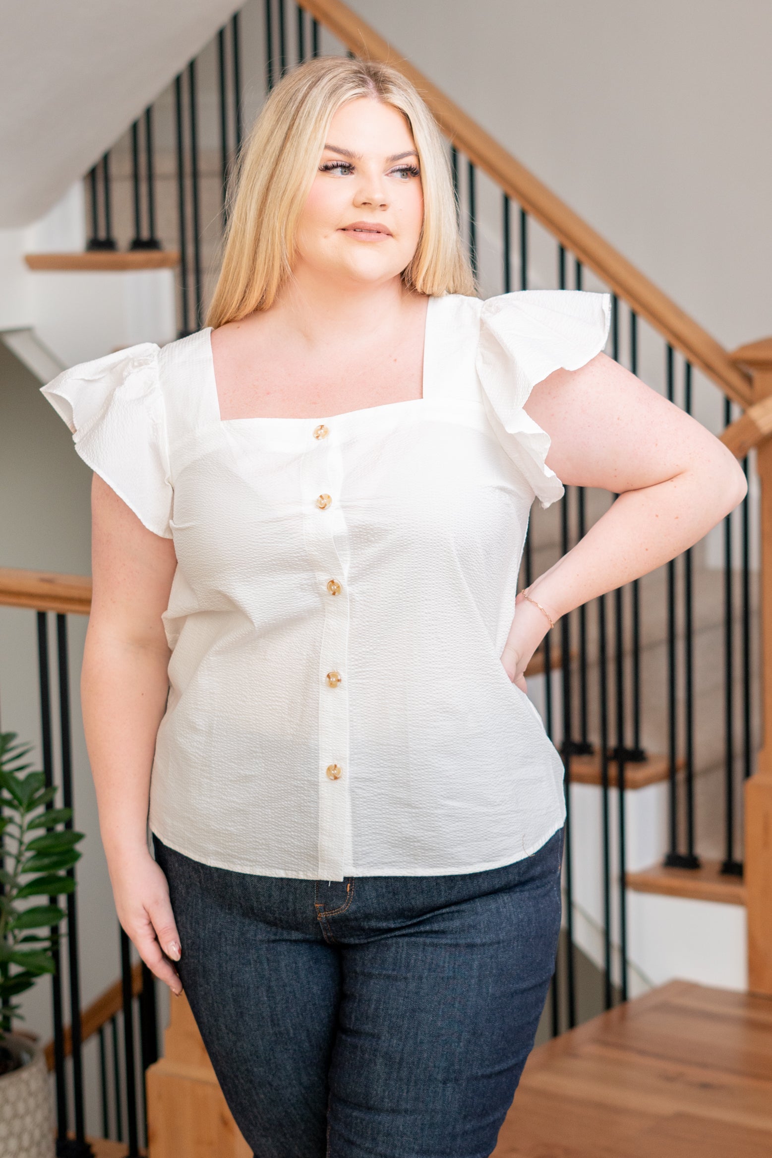 Upgrade your wardrobe with this chic button up top. With a flattering square neckline and flutter sleeves, this top offers both style and comfort. The button-up design adds a touch of sophistication, making it a versatile piece for various occasions.