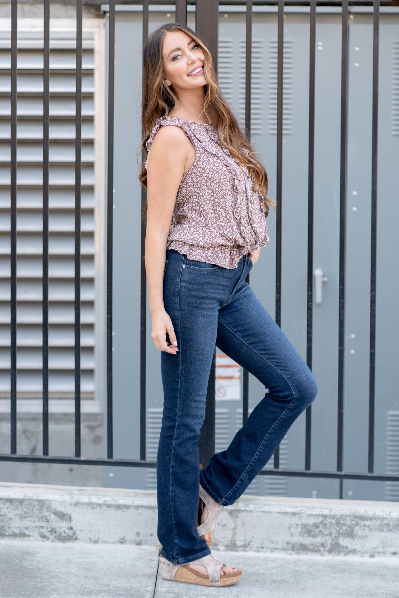 Alexis wears a size 25 in jeans, a small in tops, and 7 in shoes. She is wearing size 25 in these jeans.