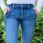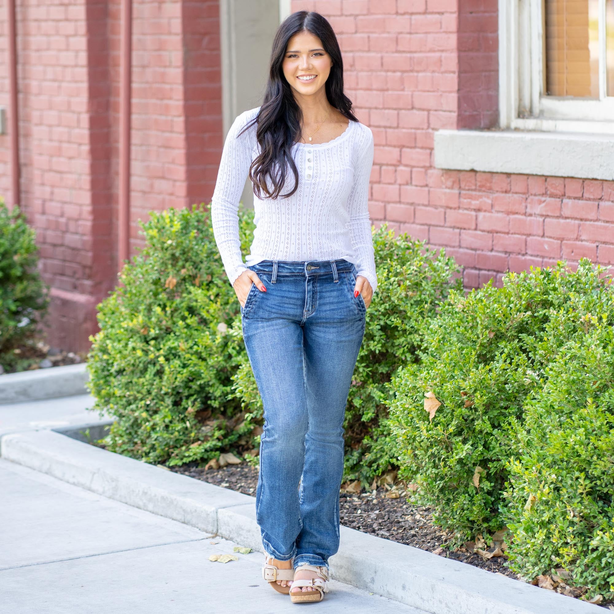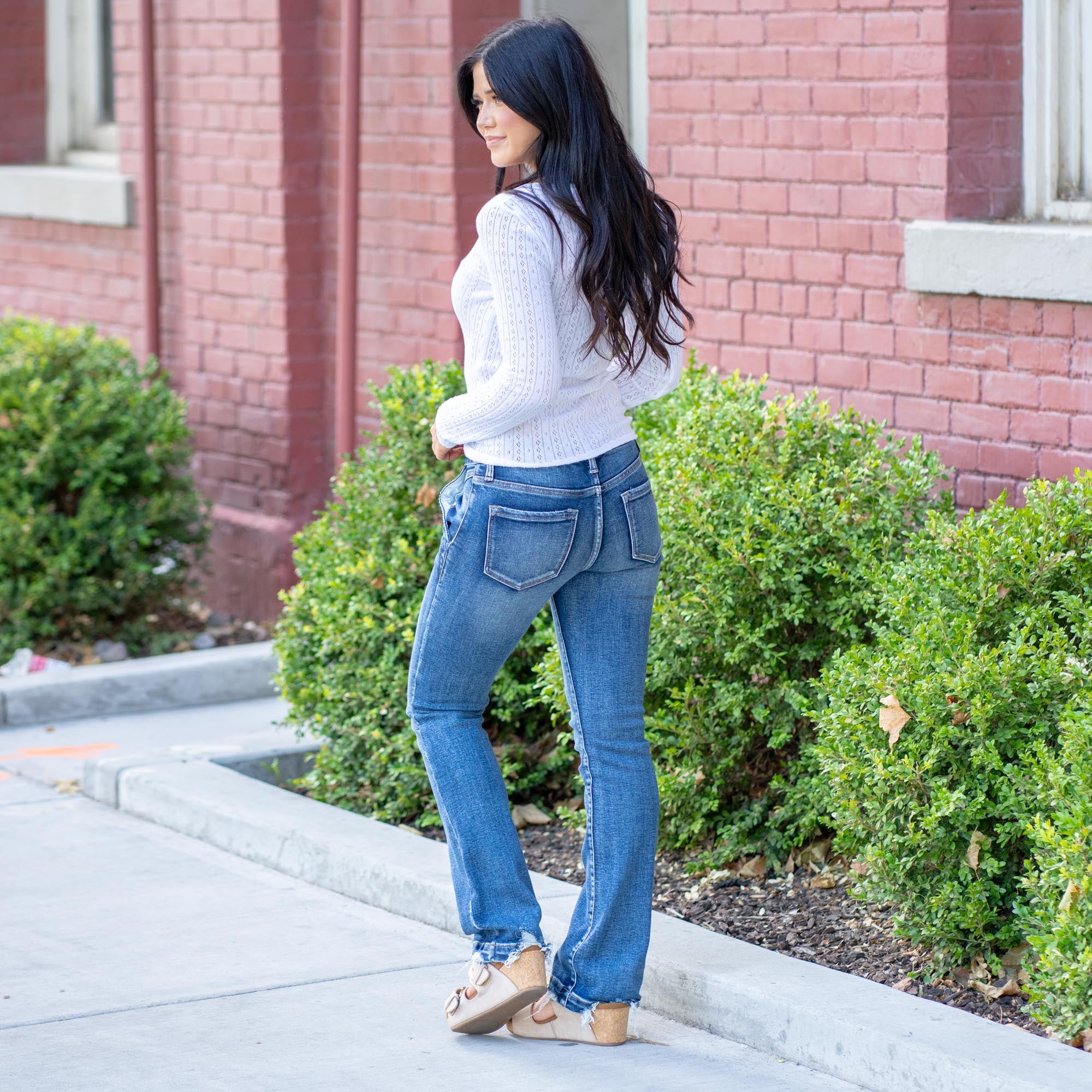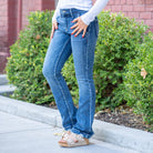 The Delcie Mid Rise Bootcut Jeans are the perfect mix of classic and modern detail. Sitting just below the belly button, this style flatters with a relaxed mid-rise fit before falling into a timeless bootcut silhouette.