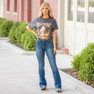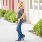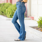 Light distressing lends a modern, lived-in feel, while the full-length bootcut design gives you that timeless flair that pairs perfectly with heels or boots. With their versatile wash and elevated fit, the Elegant Jewel is destined to become a staple in your closet — polished, flattering, and effortlessly chic.