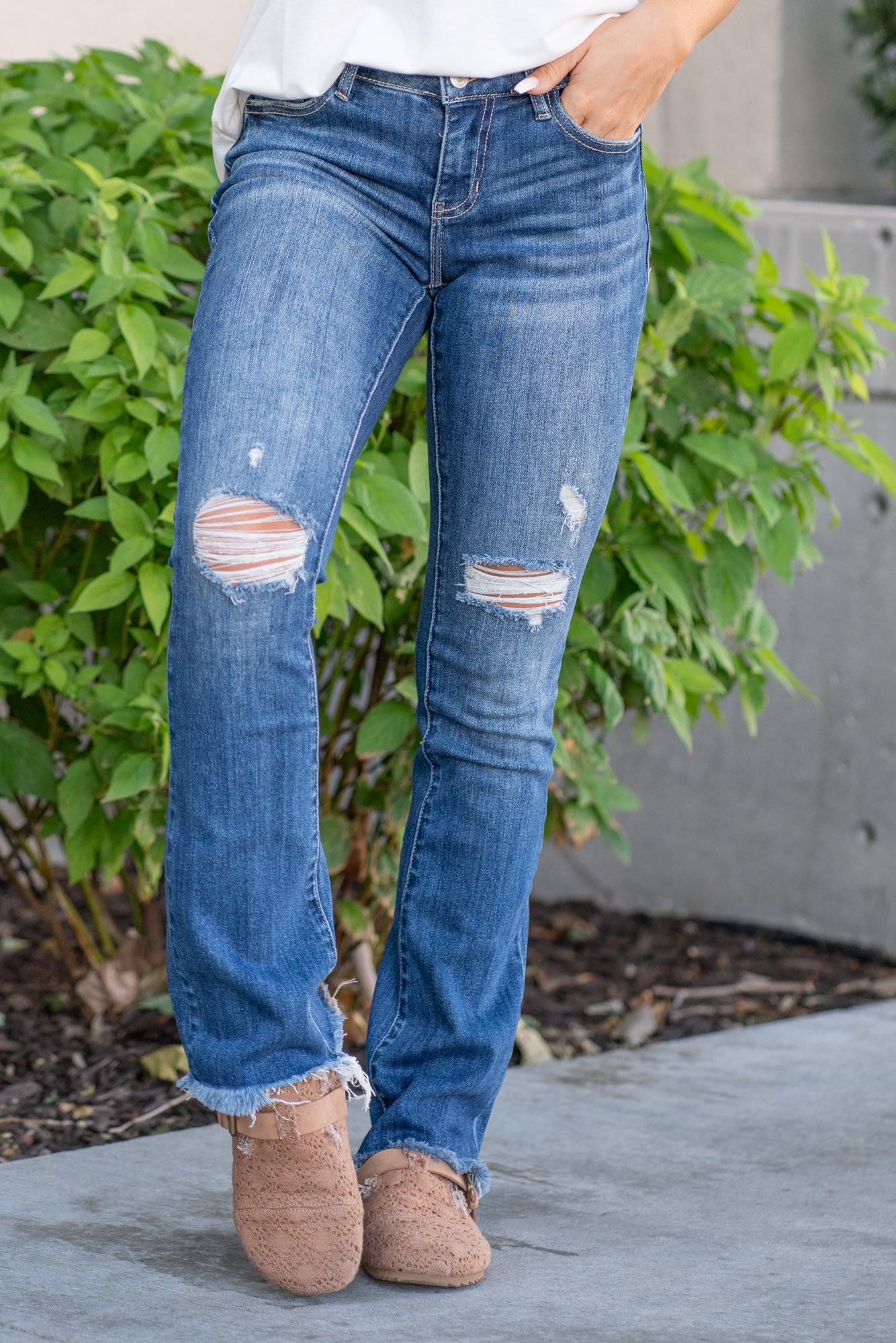 Step into effortless style with our Mia Low Rise Baby Bootcut Jeans. Crafted from a super-stretchy fabric, these jeans hug your curves while moving with you all day long. The low-rise waist brings a modern edge, and the bootcut silhouette gives your legs that long, lean look. Finished with a raw frayed hem, a single button closure, and a zip fly for that laid-back vibe you love