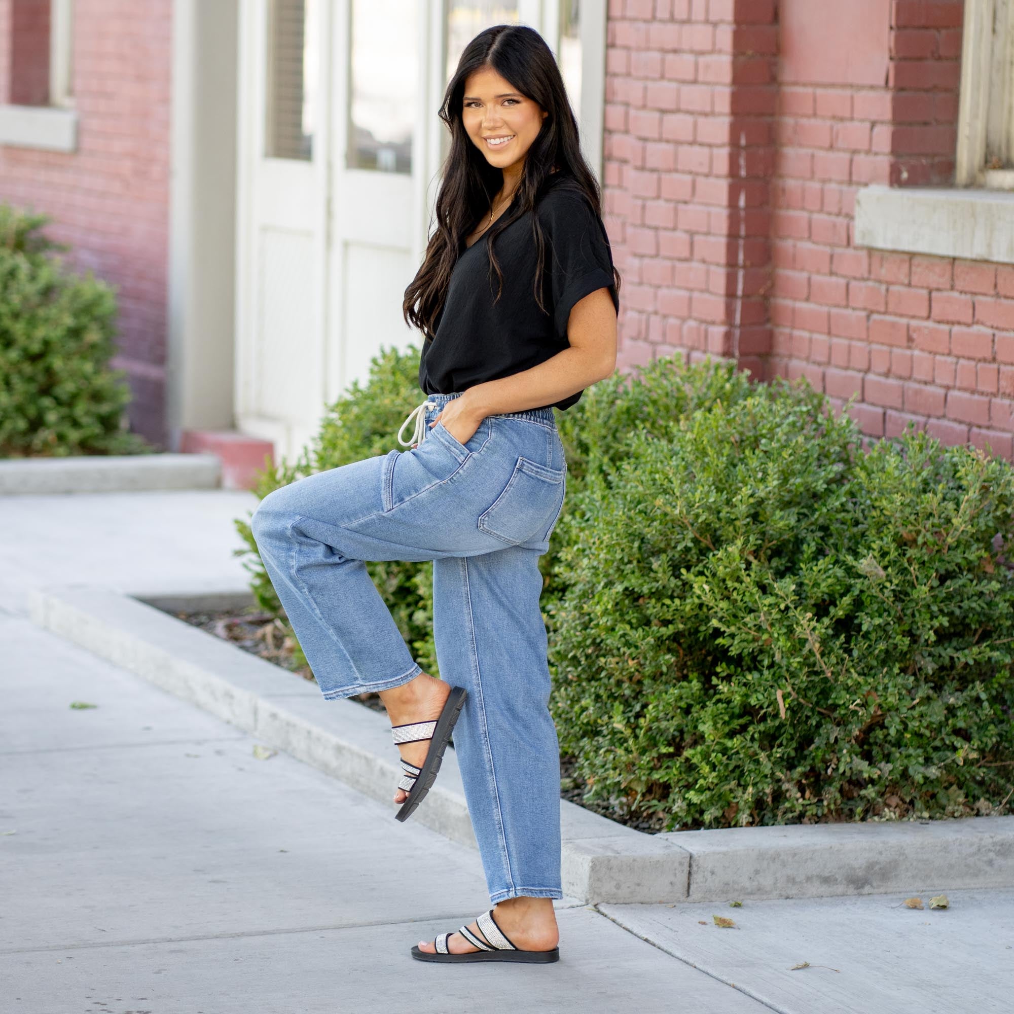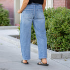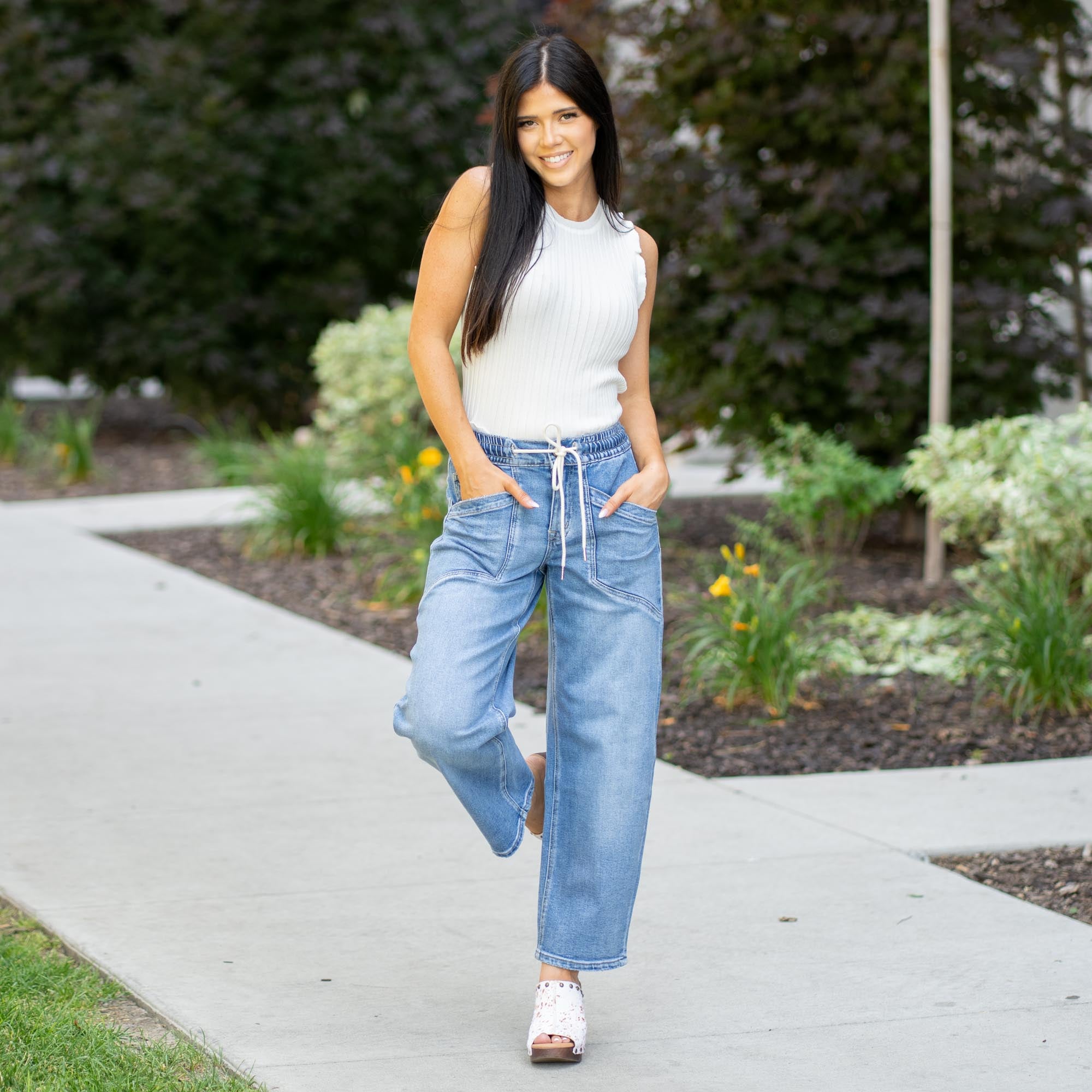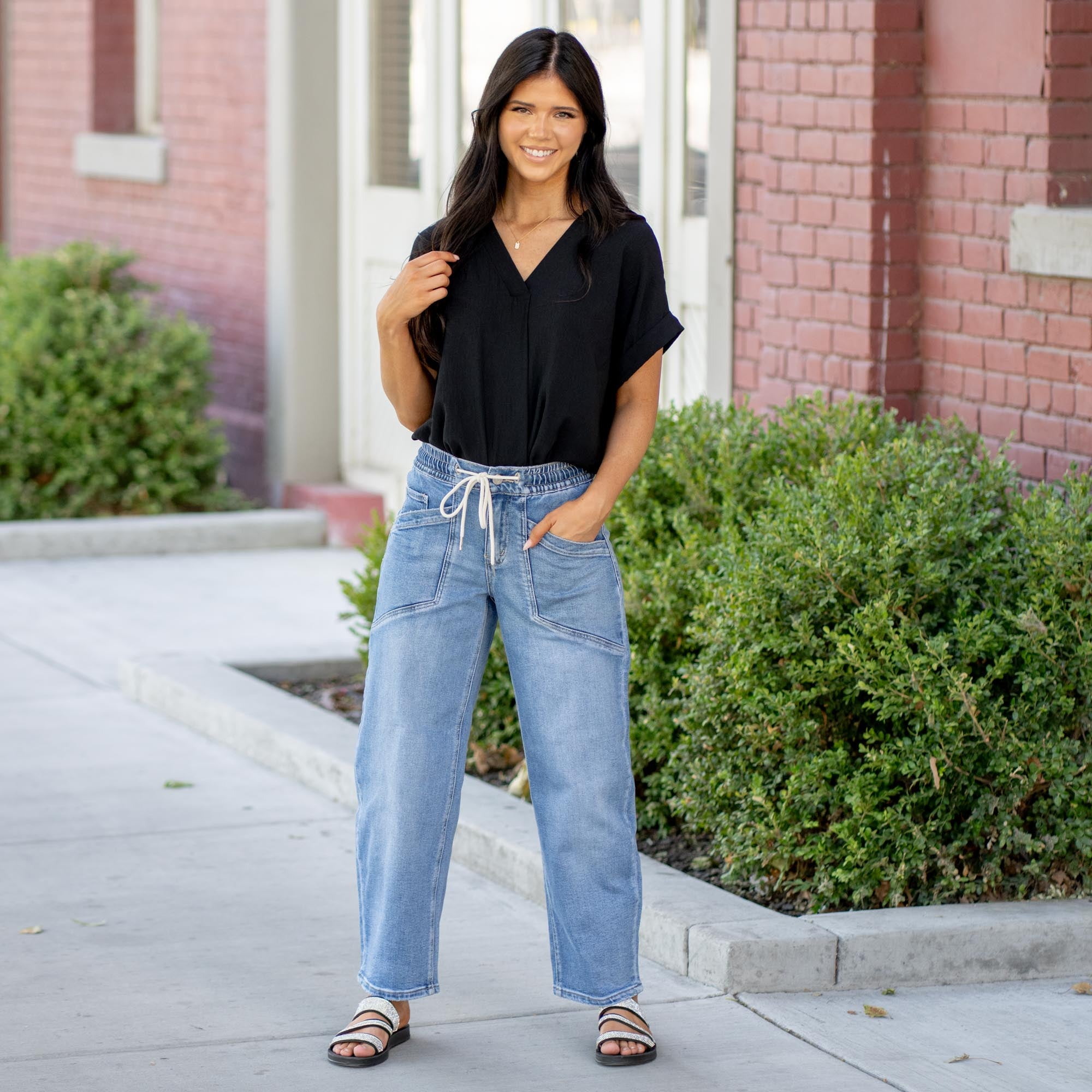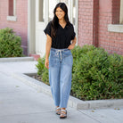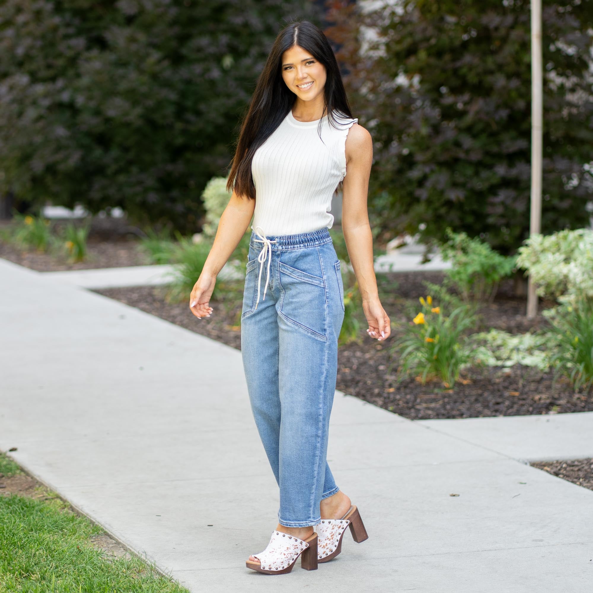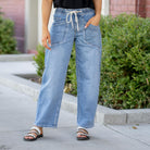 Elevate your everyday with the Upstanding High Rise Elastic Barrel Jeans. Designed with an easy pull-on waistband and a modern barrel silhouette, these jeans offer the perfect blend of structure and comfort. A cropped 27" inseam flatters your ankle line, while the comfort stretch denim and wide leg give you freedom to move in style. Whether you're dressing them up with boots or keeping it casual in sneakers, this pair delivers laid-back polish with an edge.