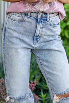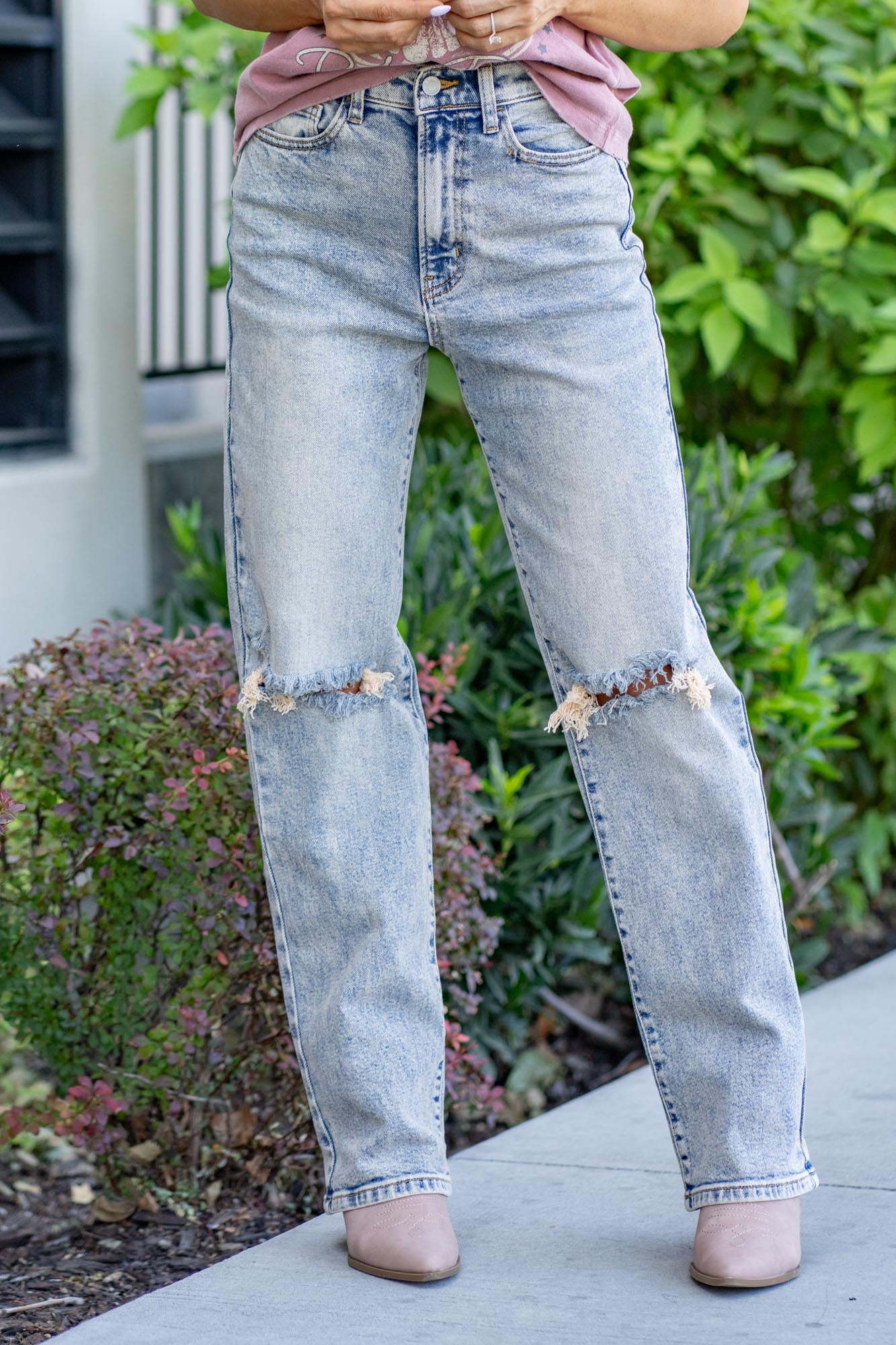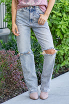 Distressed detailing at the knees gives them a rugged, lived-in vibe, while the light denim fabric with just a hint of stretch (99% cotton, 1% spandex) ensures lasting comfort and shape. Complete with belt loops, a zip fly, and a 31" inseam, these jeans are ready to pair with your favorite sneakers, boots, or heels for an effortlessly chic look.