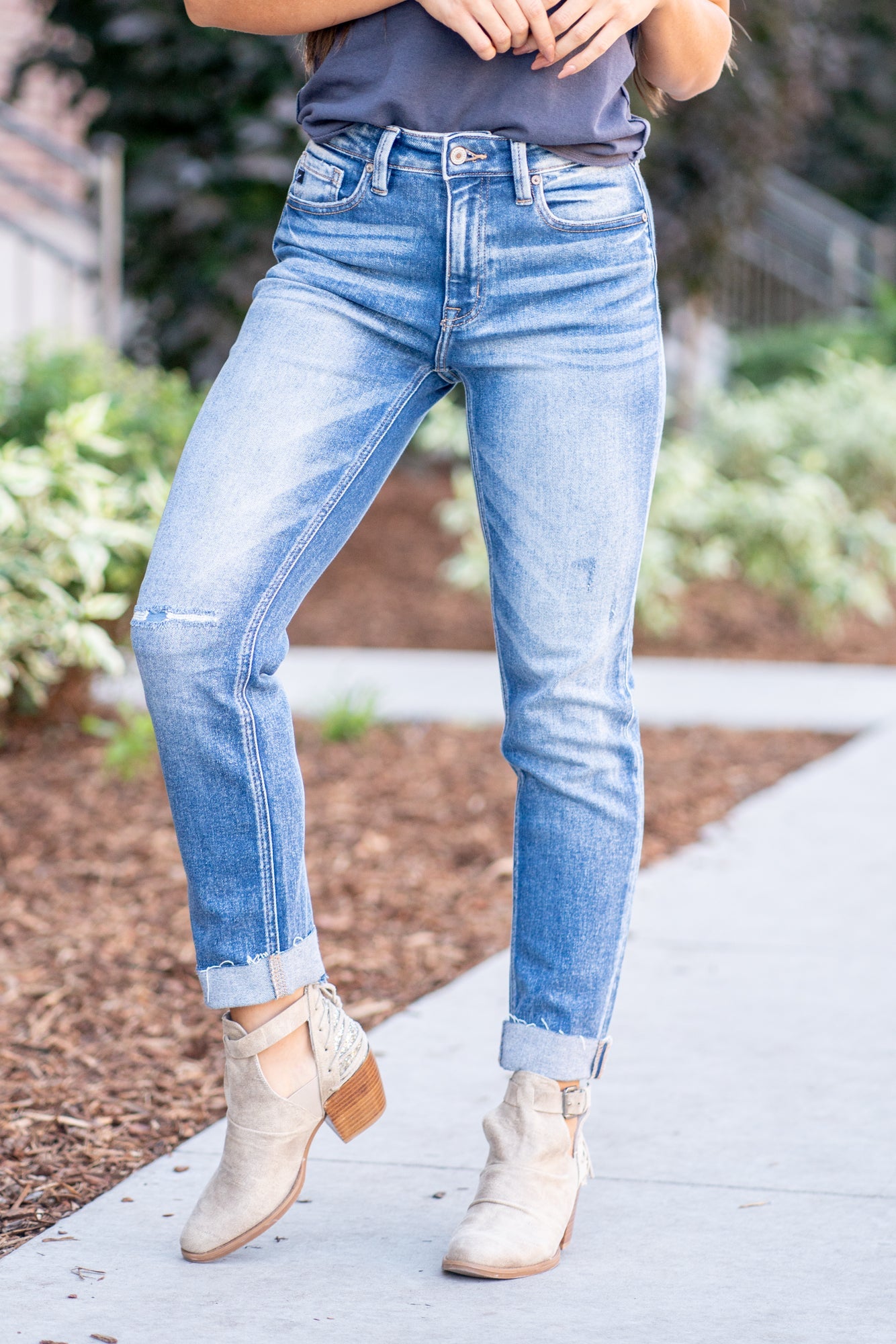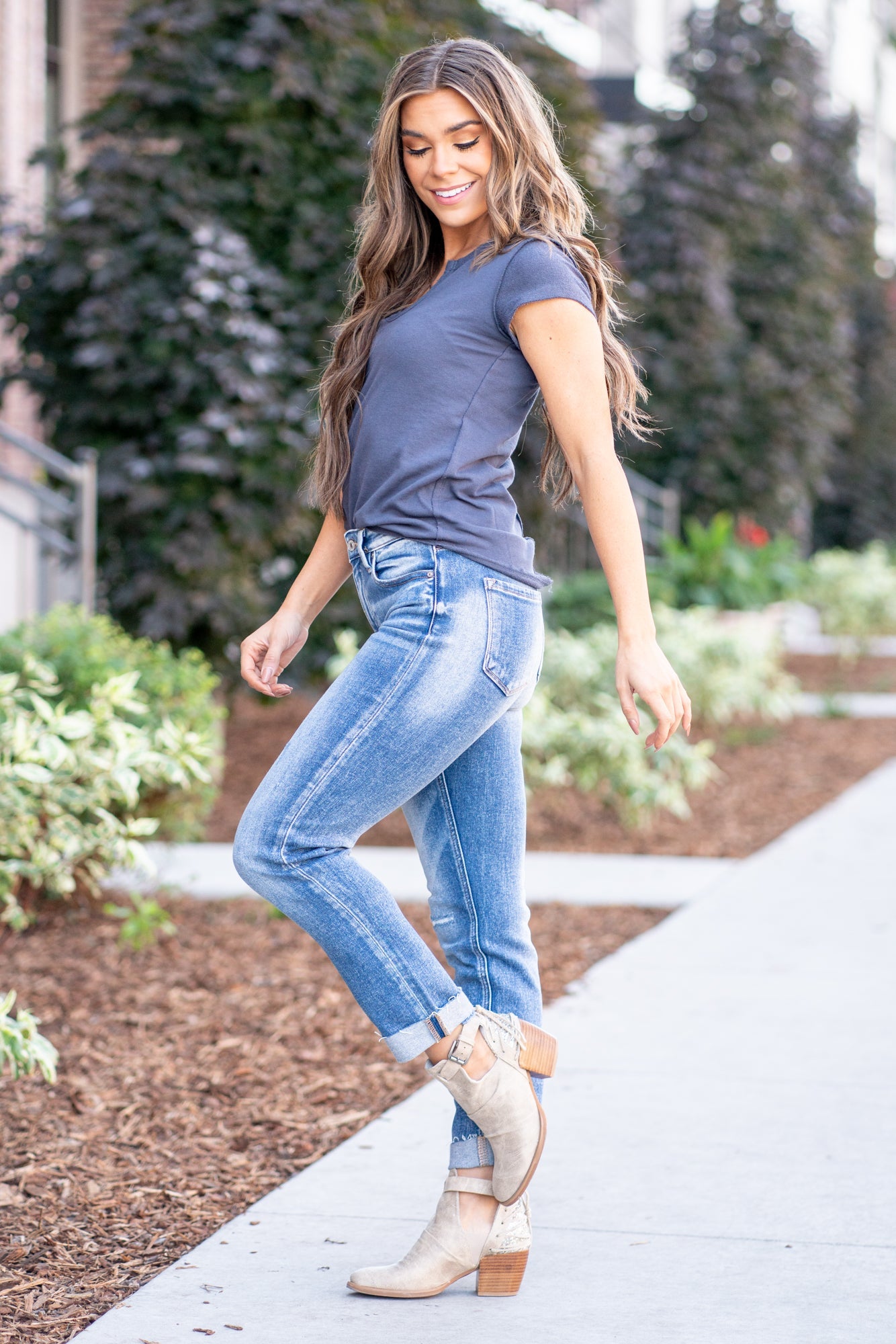 These high-rise slim straight jeans hit at exactly the right spot on your waist and with some spandex, these will stretch as you wear and get super comfy!