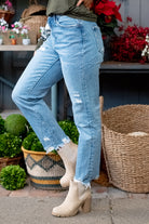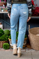 These jeans are made from non-stretch denim, giving them a sturdy and durable feel. The slouchy fit creates a relaxed and laid-back silhouette, while distressed detailing adds a touch of edginess. The legs are relaxed, giving the jeans a comfortable and spacious feel. Designed in the classic mom jean style, these jeans have a high-waisted line that sits at the natural waist and a deconstructed raw hem for a trendy, unfinished look. Wear them with a tucked-in shirt and sneakers for a casual, cool outfit.