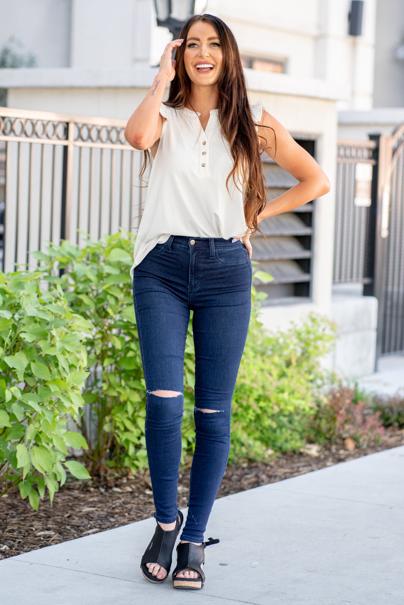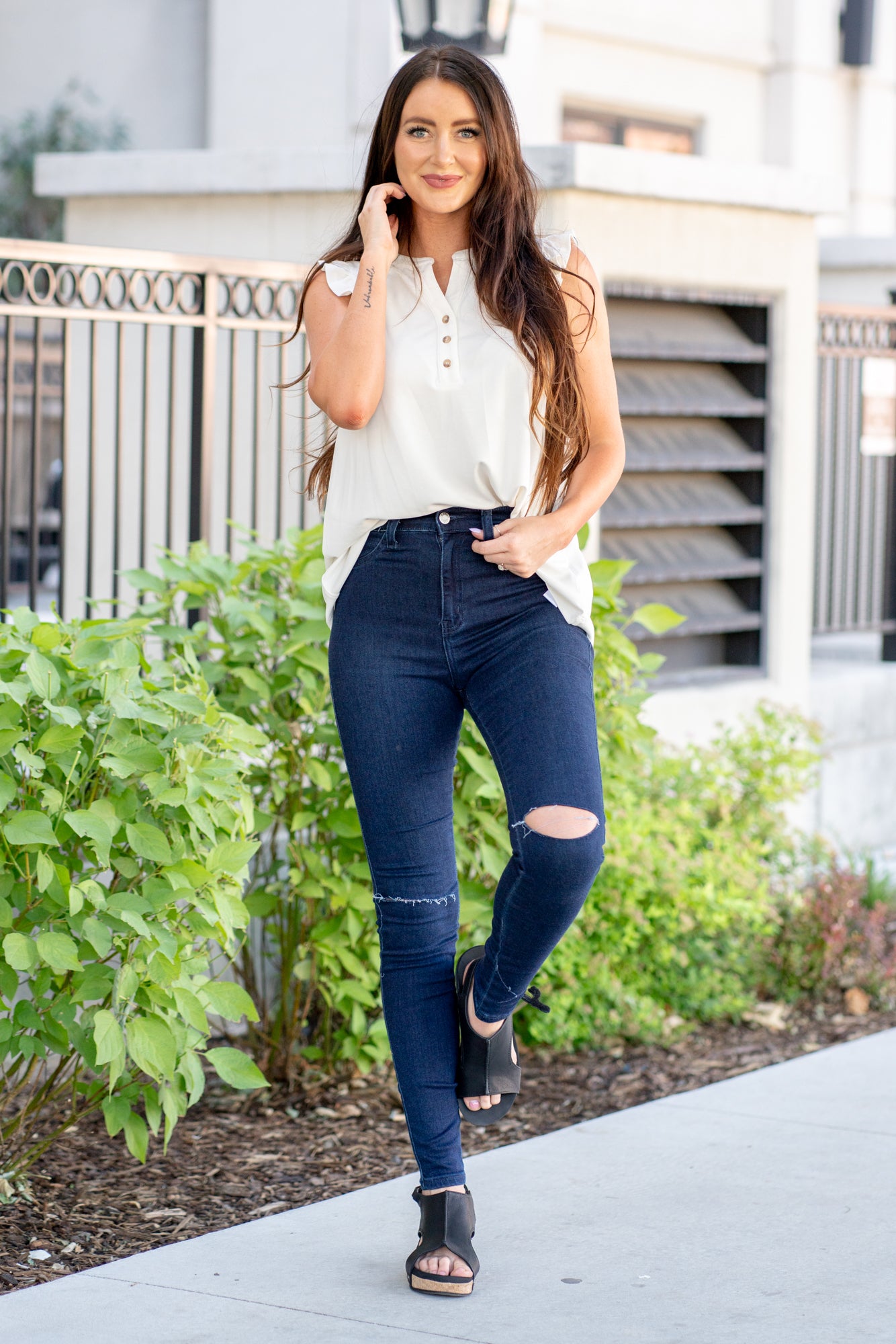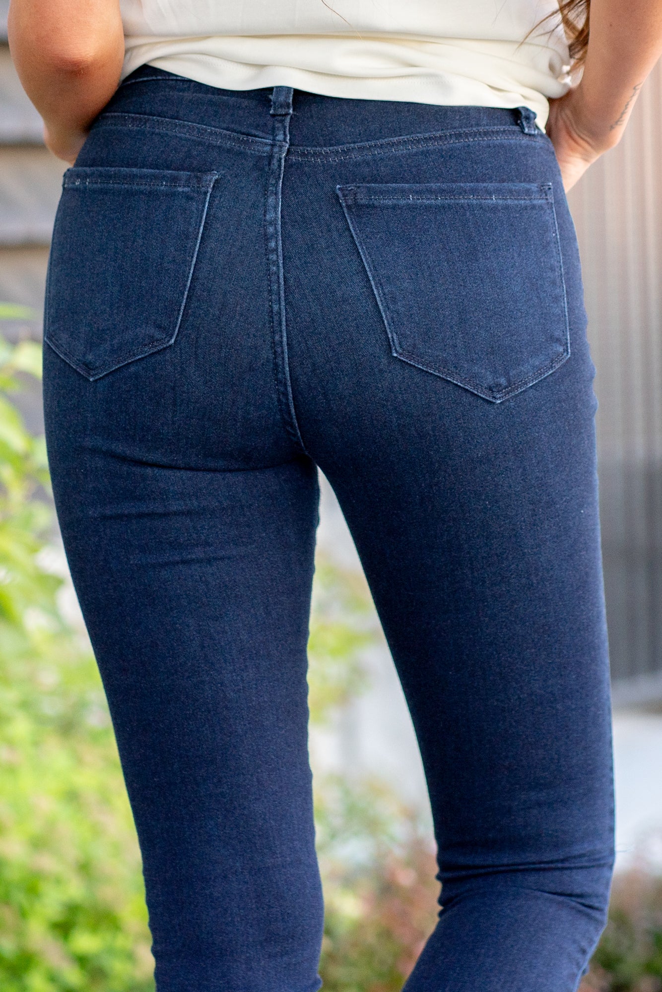 Alexis wears a size 25 in jeans, a small in tops, and 7 in shoes. She is wearing size 1 in these jeans.