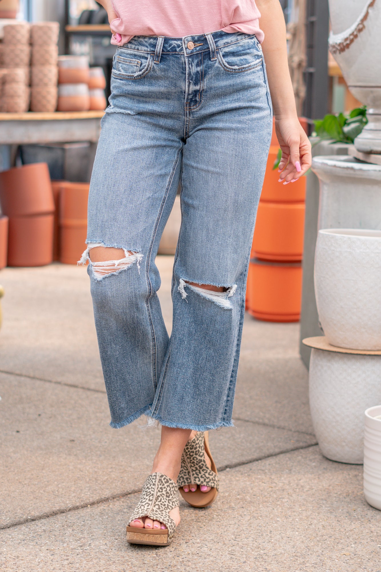 The Punctual Dad Jeans serve up that laid-back, borrowed-from-him vibe with a flattering high rise twist. Crafted from comfort stretch denim, this slim wide-leg fit features subtle distressing, a raw frayed hem, and a cropped length that hits just right. Easy to throw on and easy to style, these jeans give off cool-without-trying energy—perfect for your go-anywhere, do-anything days.