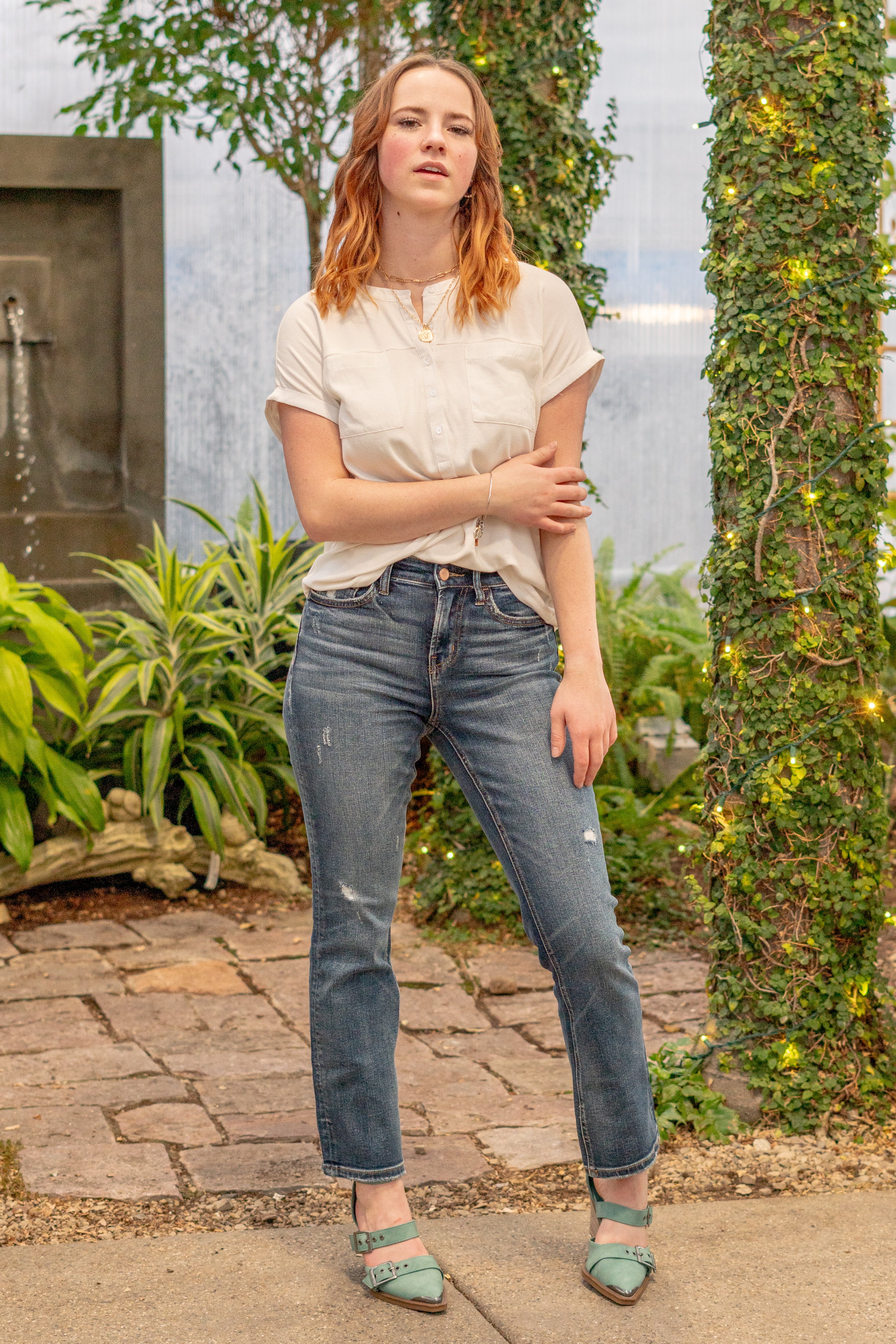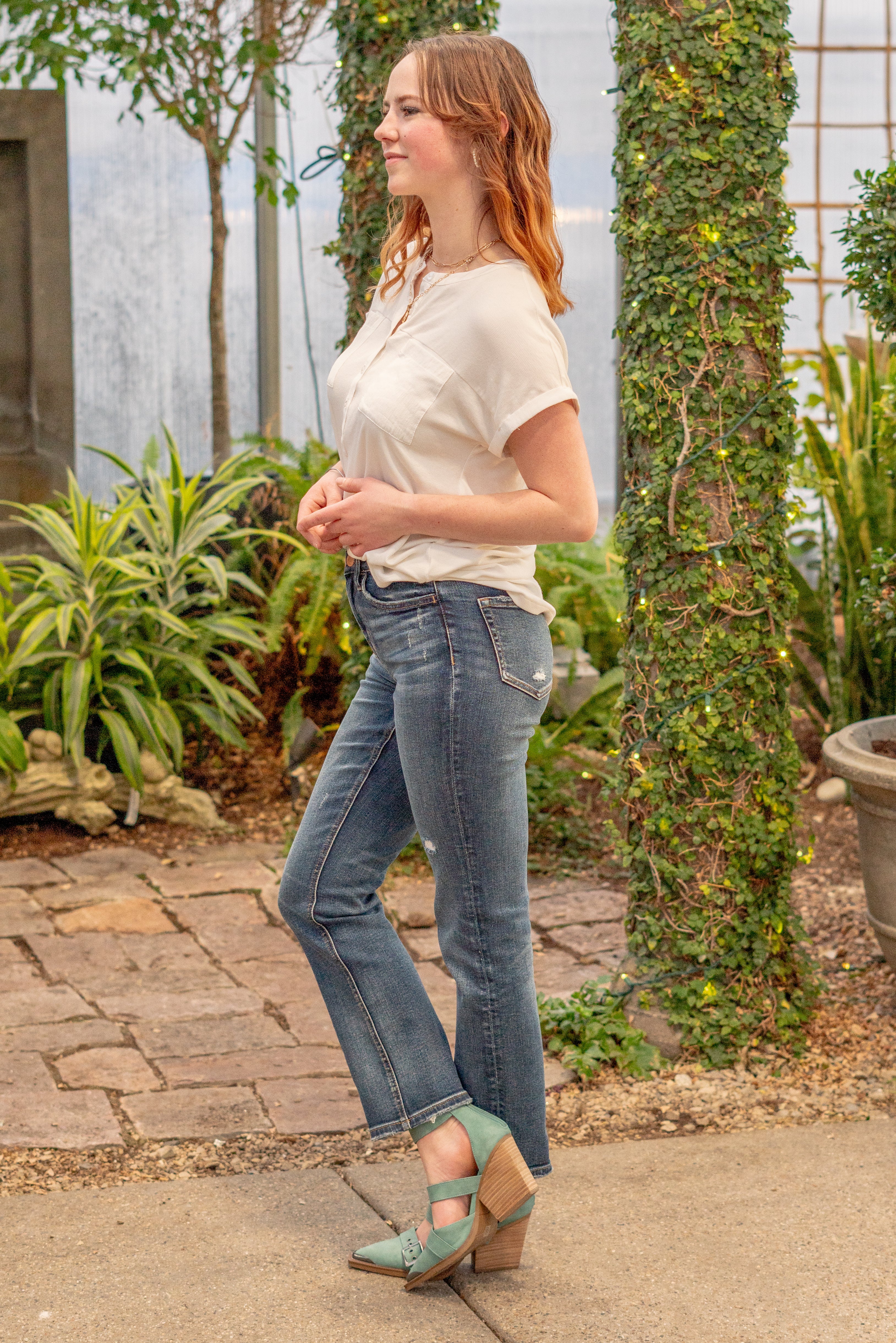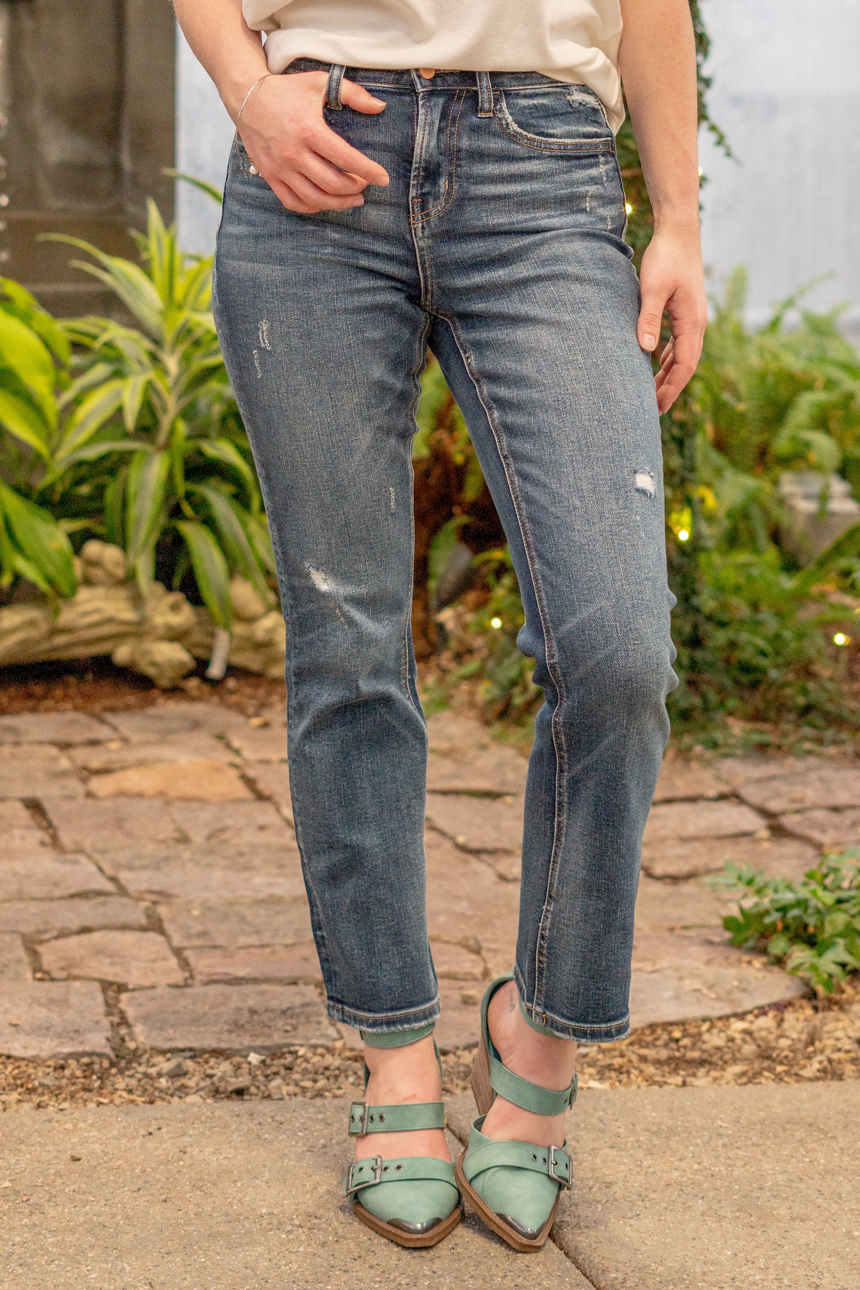 Discover elevated comfort and style with our High Rise Ankle Slim Straight Jeans. Crafted from comfort stretch denim, these jeans feature a high-rise waist, subtle distressed detailing, and ankle length for a modern look. Step into effortless sophistication with our straight jeans.
