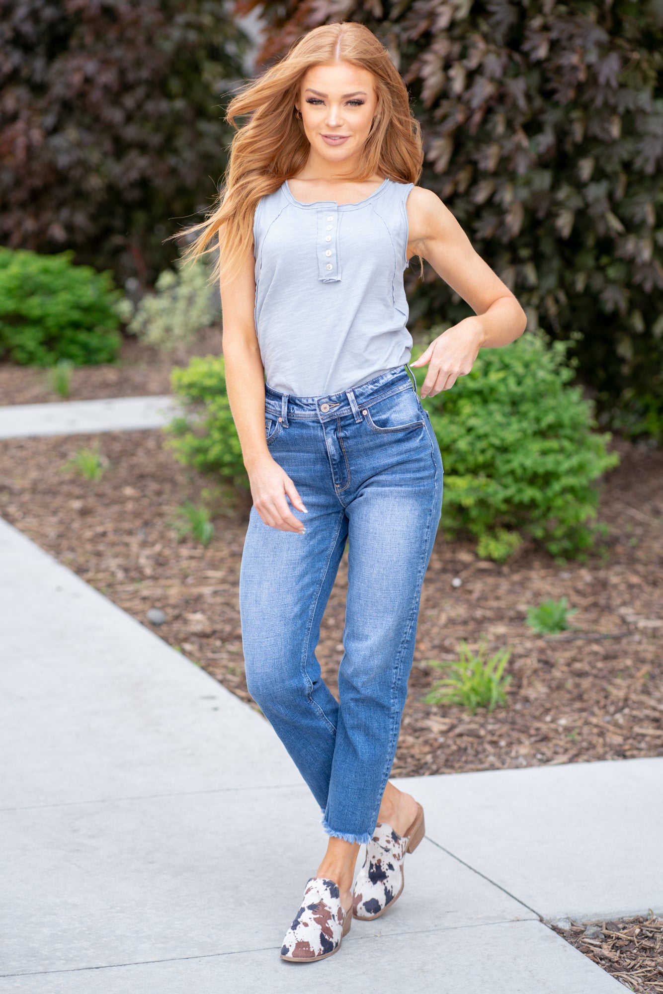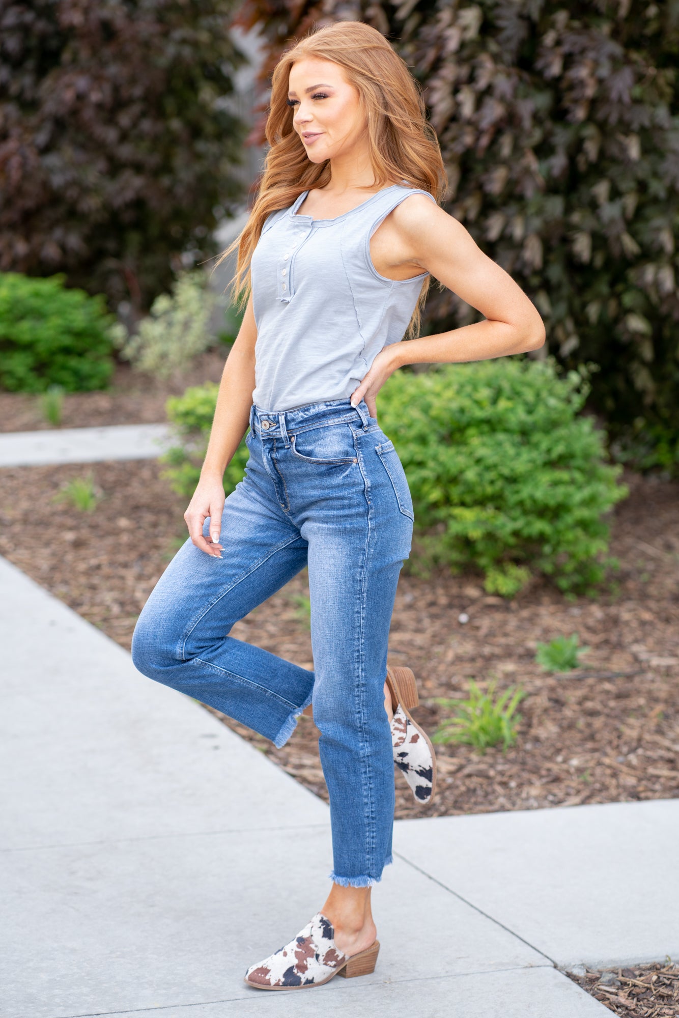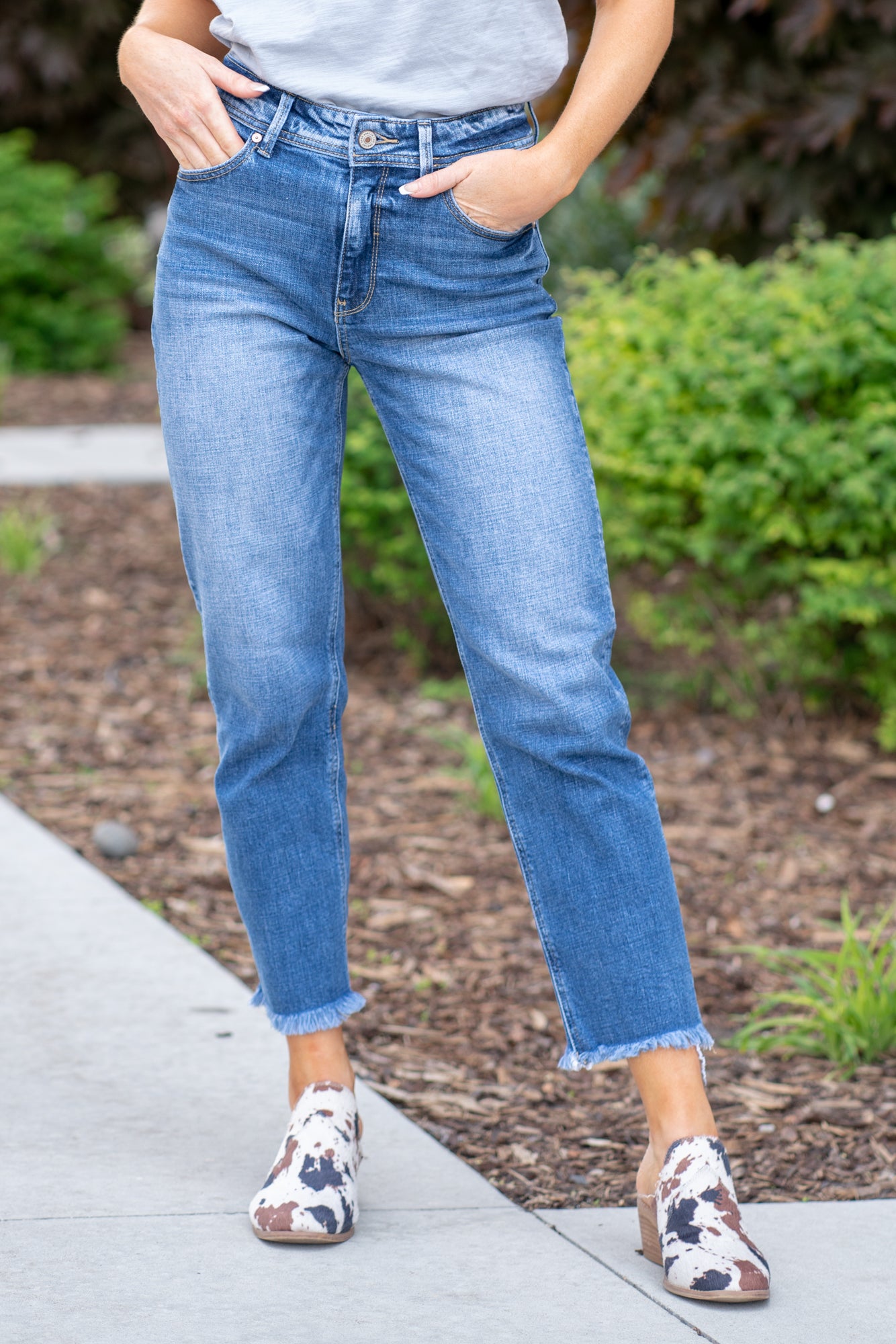 These jeans are high rise slim straight or straight relaxed denim jean pants with a medium wash. They are made of durable denim fabric with added comfort stretch and have a zip fly. The jeans feature a basic 5 pocket style and grinding at the back pockets for added style.