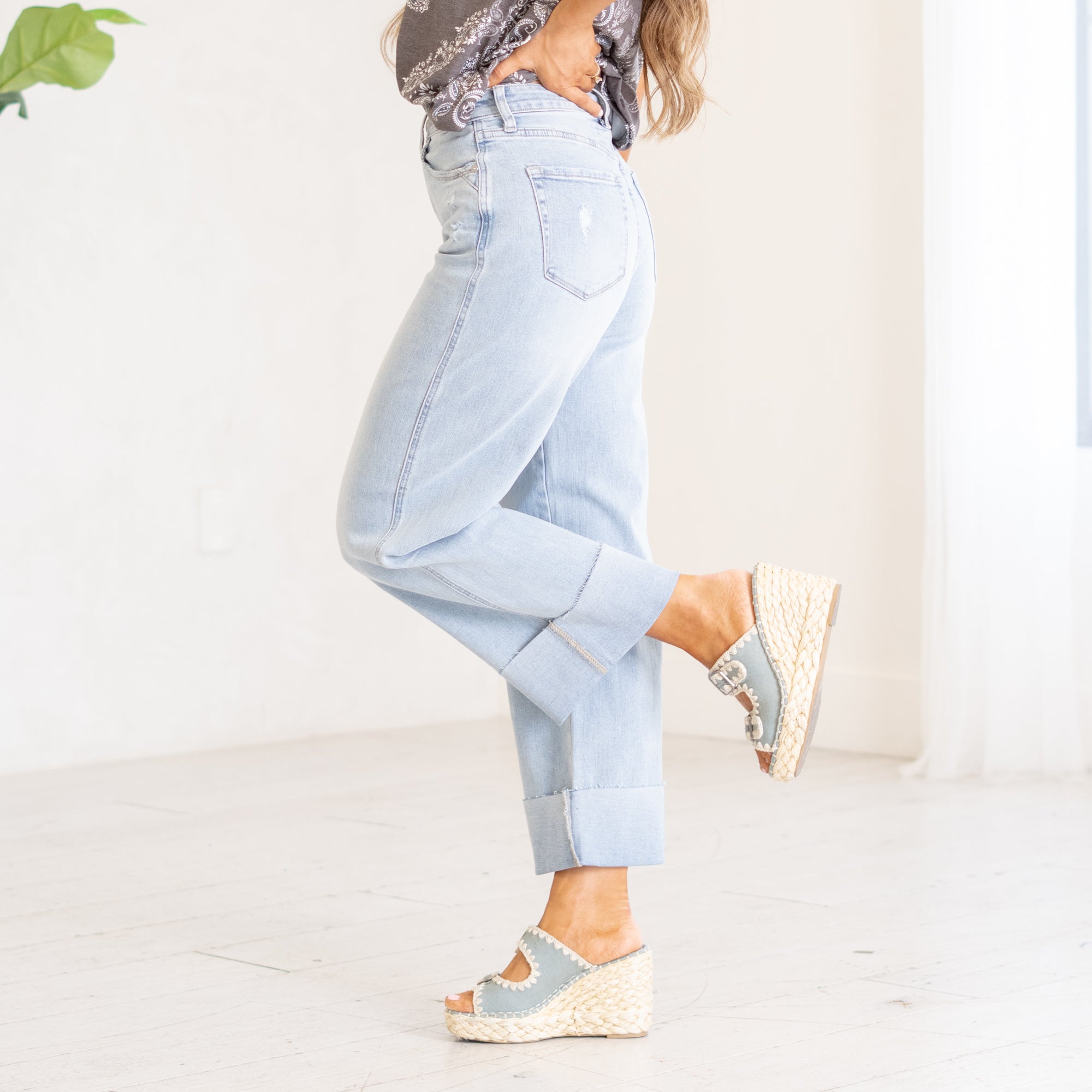 - Rigid denim = size up for a relaxed fit in the waist.