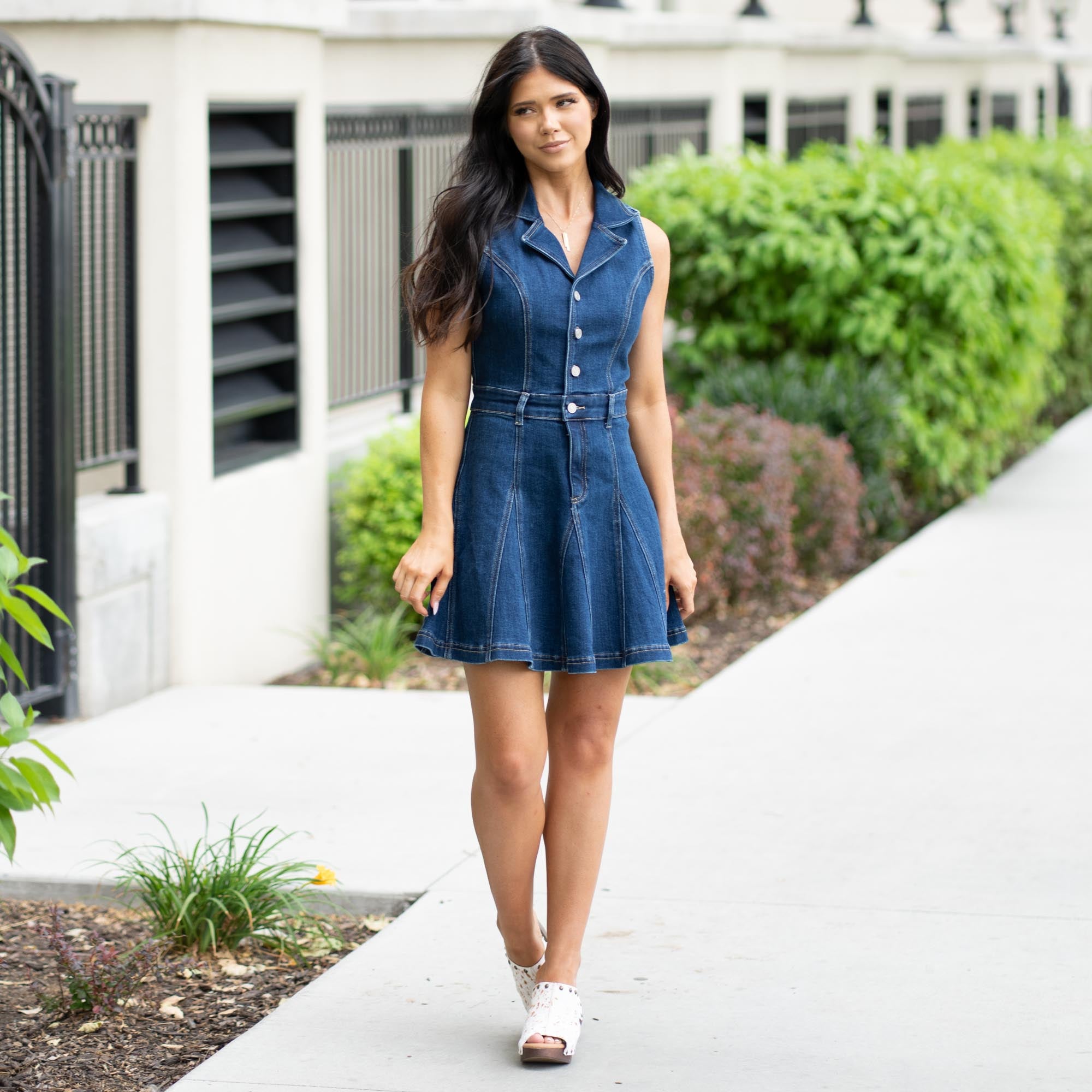 The Adeline Mini Denim Dress is your new must-have for effortless style. Crafted in a rich dark wash, this sleeveless mini features a classic button-down front with a zip fly, tailored darting, and a structured collar for a flattering, feminine fit. Made true to size with a hint of stretch for comfort—dress it up with boots or keep it casual with sneakers.