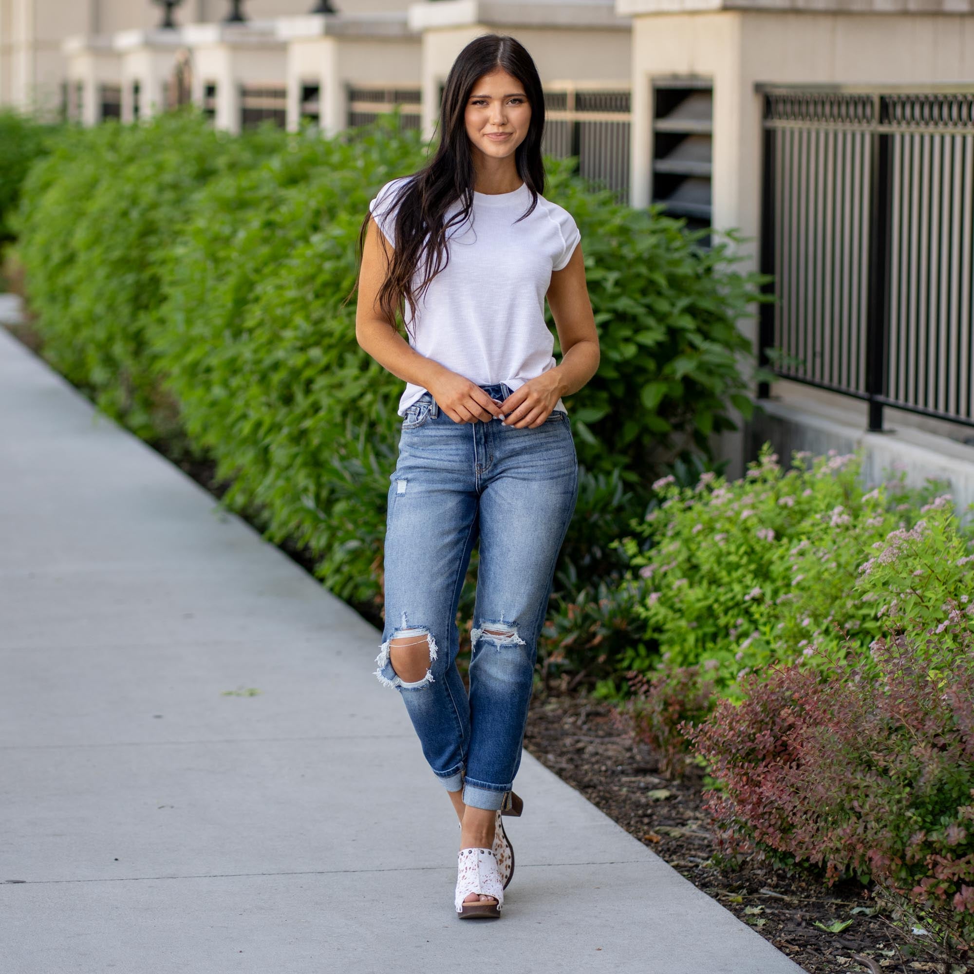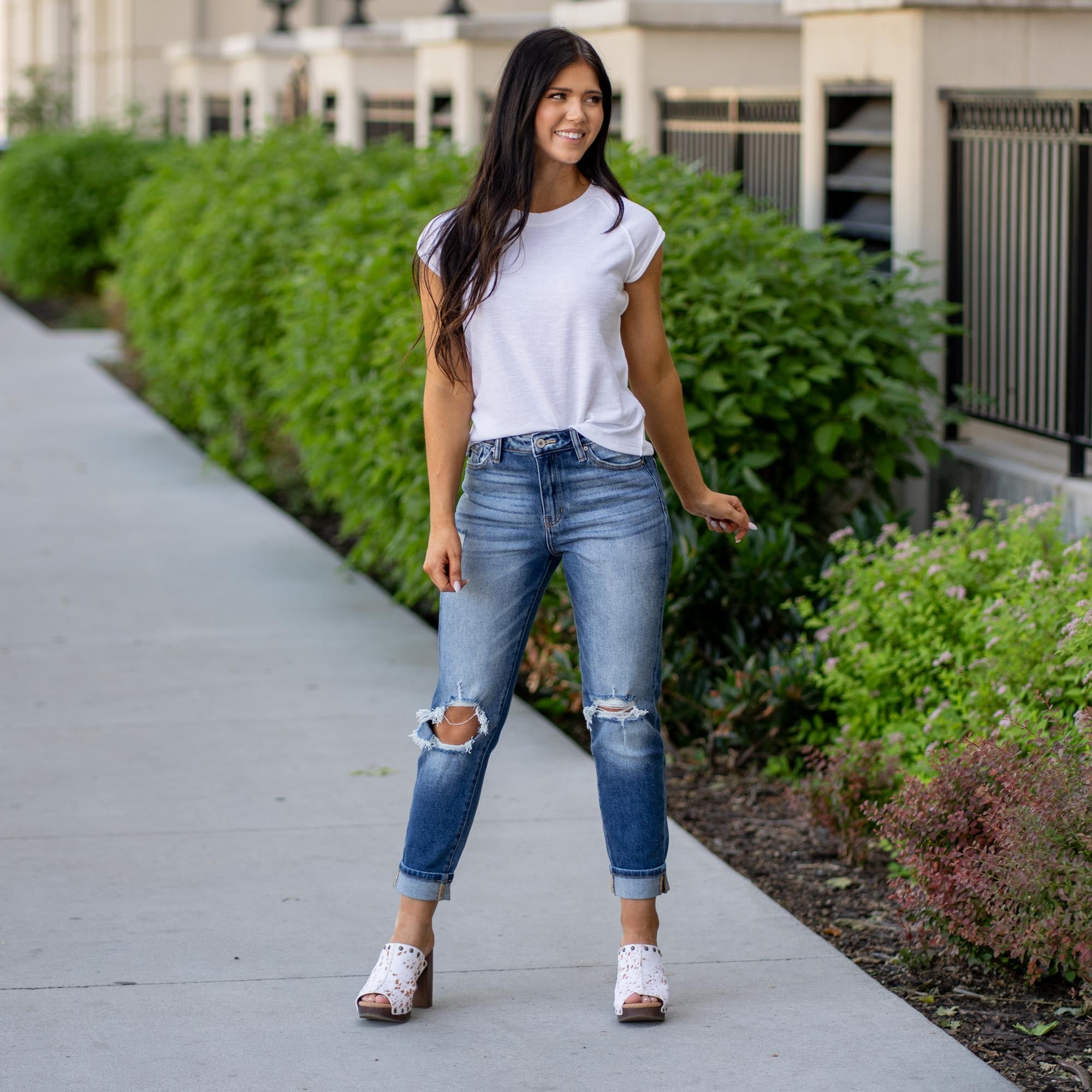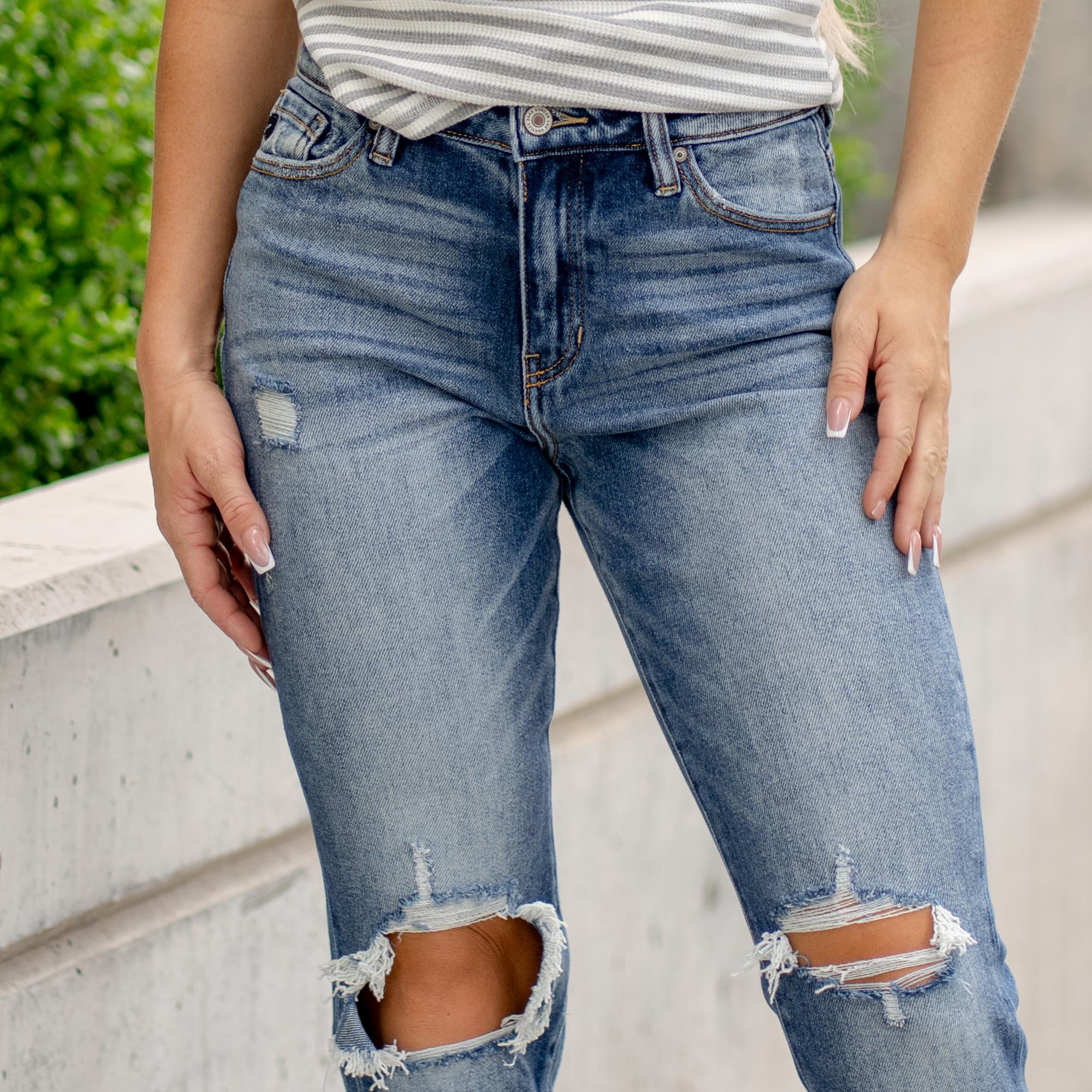 The Milan High Rise Jeans blend laid-back comfort with trend-forward details in an ultra-relaxed mom fit. Sitting high on the waist, they drape effortlessly through the legs for that perfectly undone vibe. Crafted from soft stretch denim in a heavily faded wash, they feature open-knee destruction and a folded hem for a worn-in, lived-in finish. Complete with a five-pocket design, zip fly, and single-button closure—this pair brings casual cool to any outfit.
