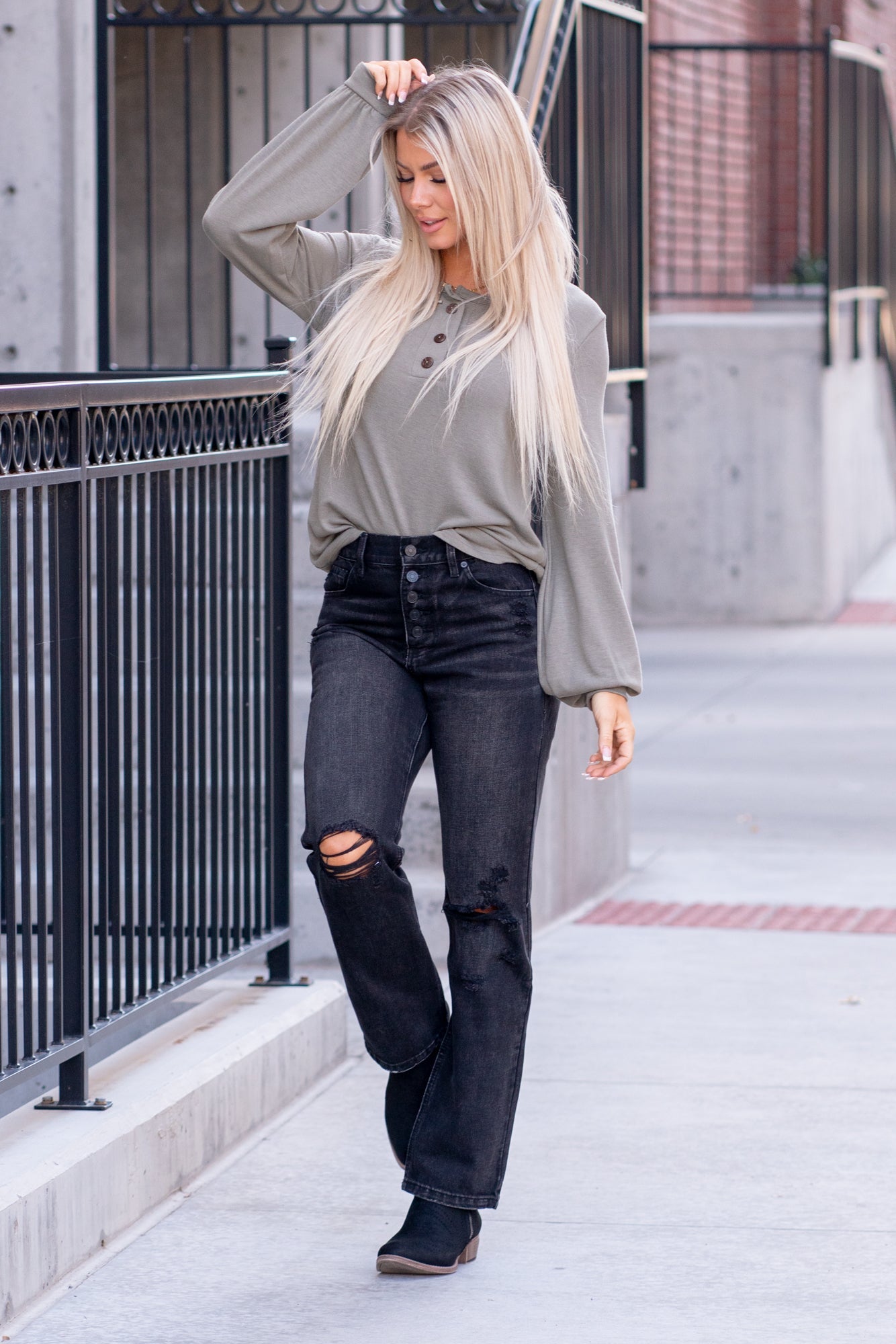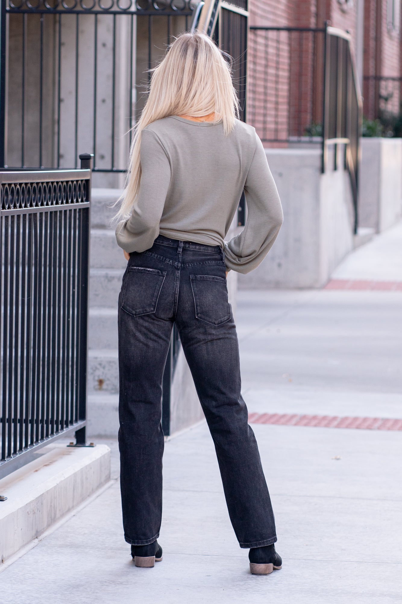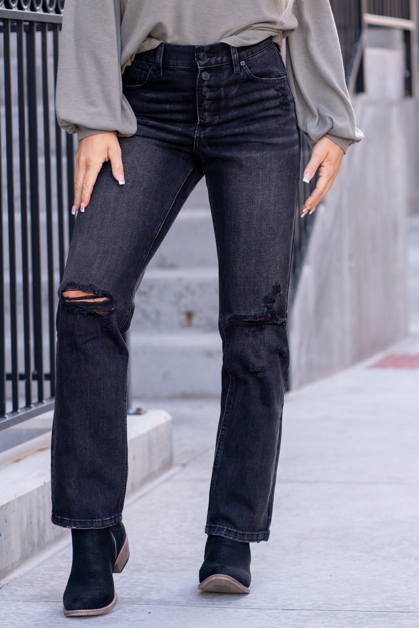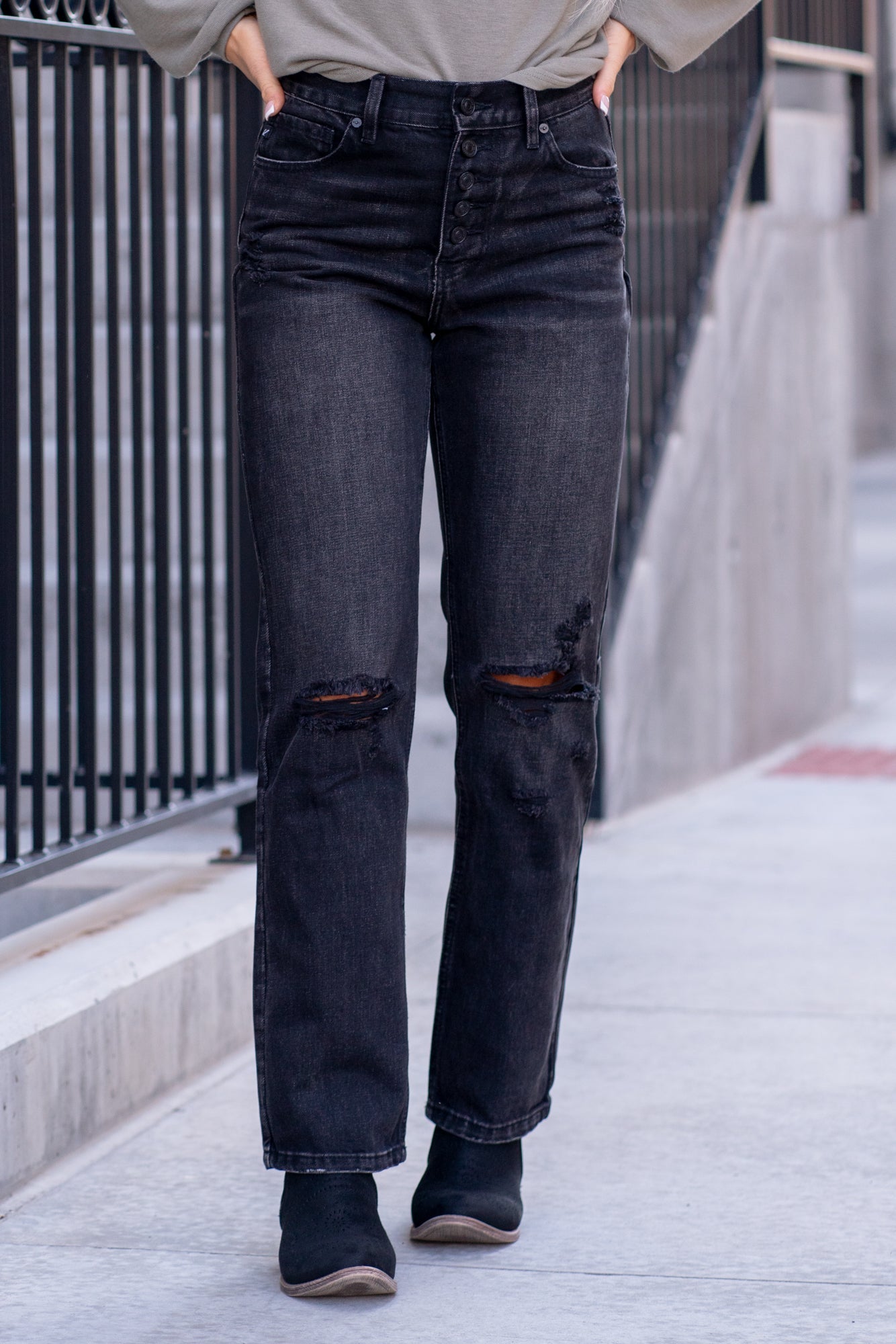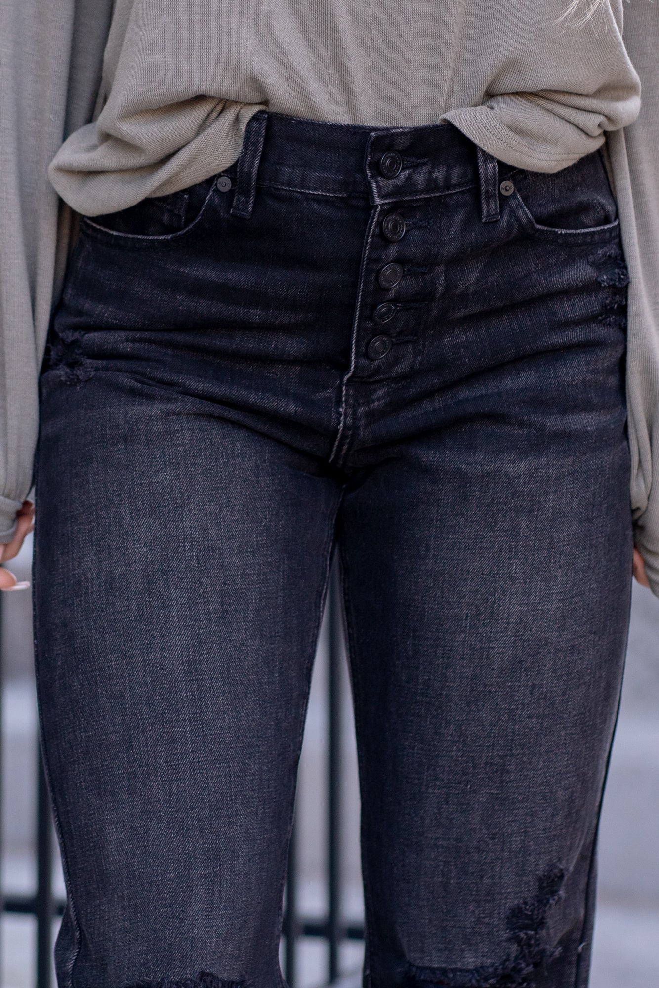 Introducing our Lynne Ultra High Rise Straight Jeans in a sleek dark gray wash with subtle light whiskering and medium knee distress. These jeans sit above the waistline for a full-body look, and the denim falls straight from the hip with a slight, barely noticeable taper. They feature a classic 5-pocket style and an exposed 5-button fly for added detail. Elevate your denim collection with this stylish and versatile pair.