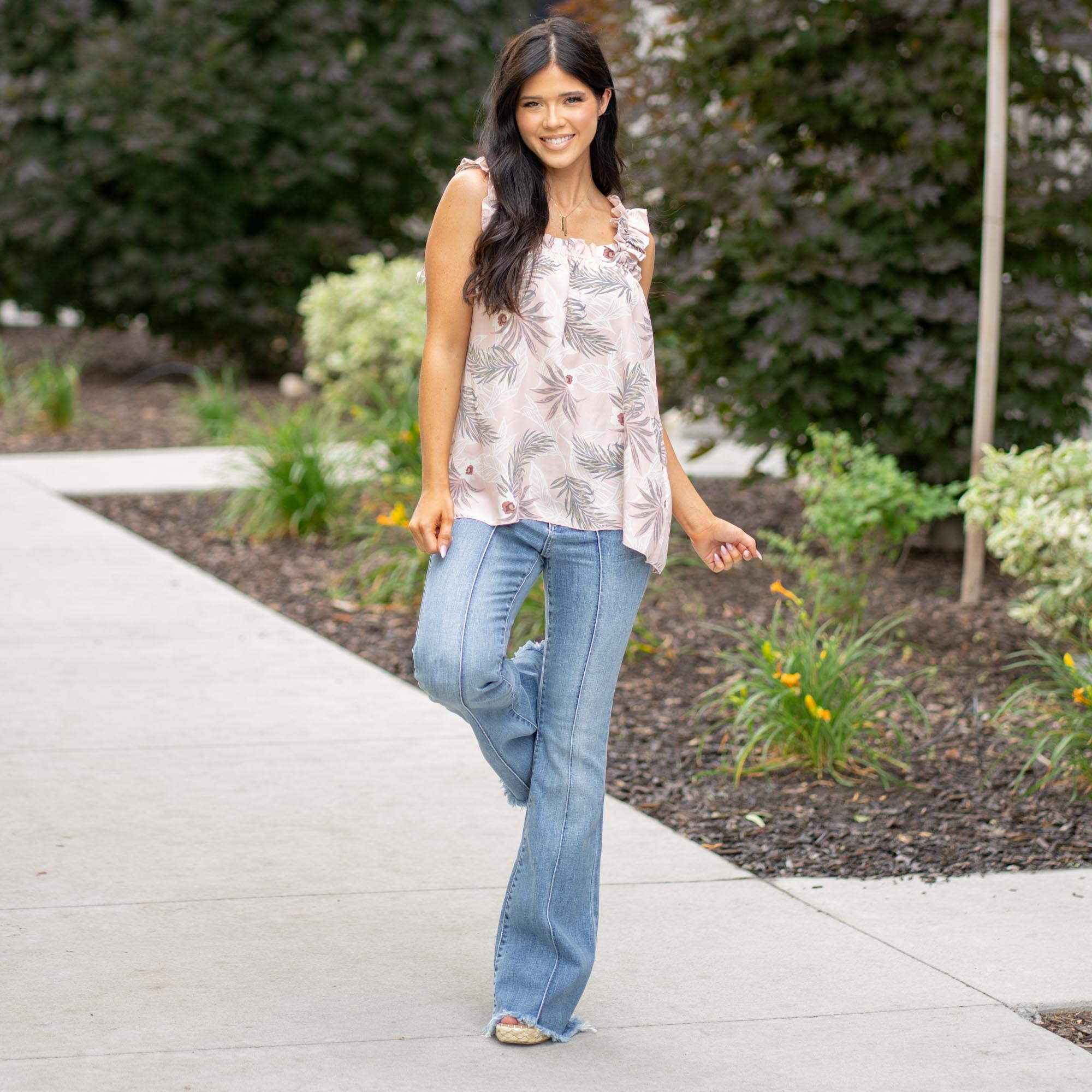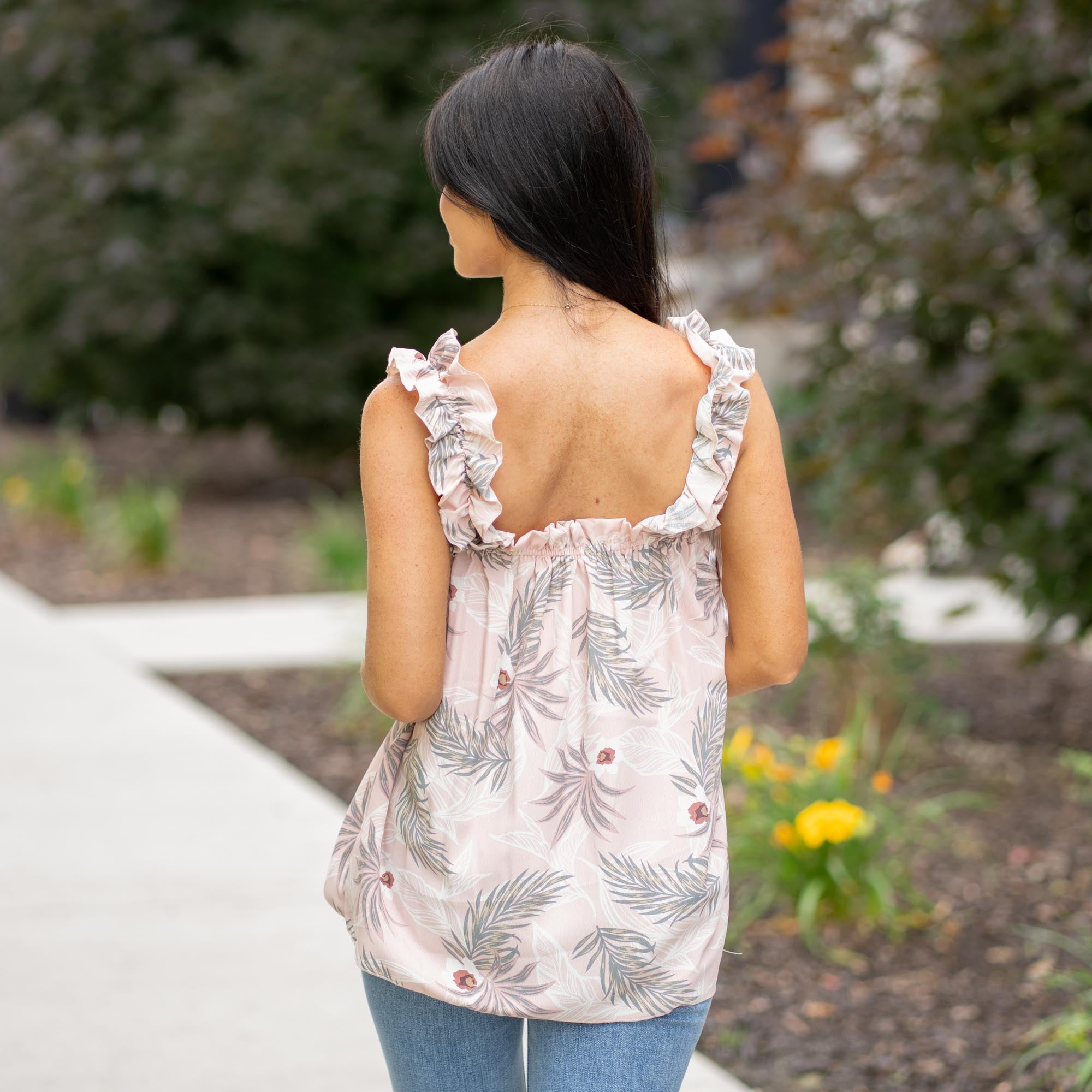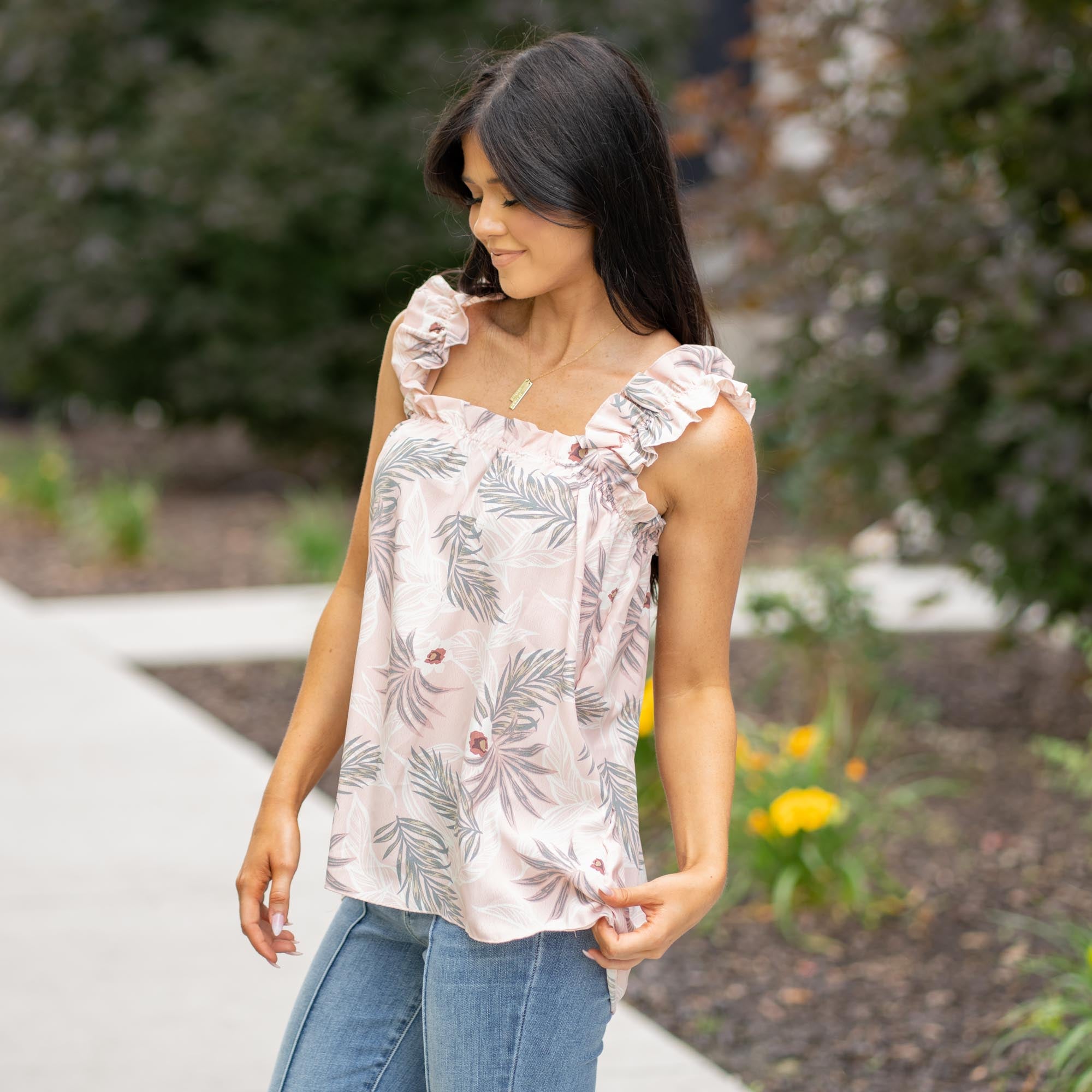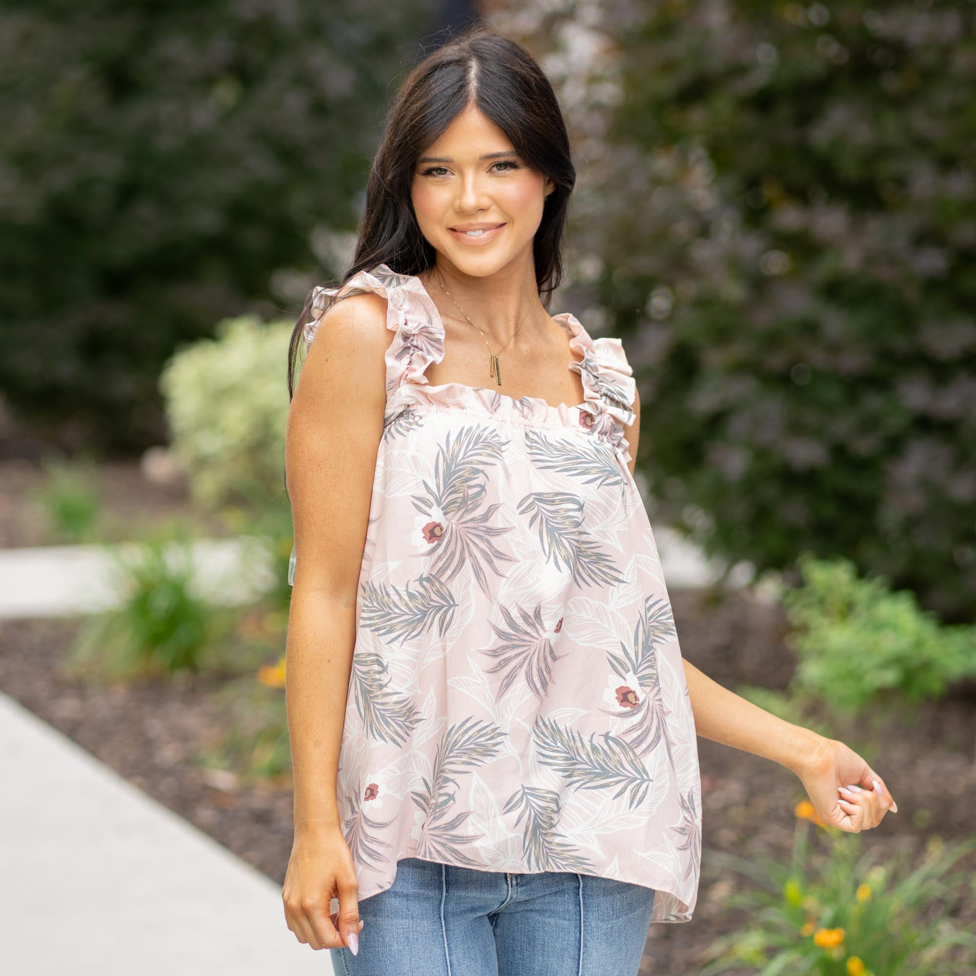 Breeze into warmer days with the Isla Ruffled Shoulder Floral Tank. Crafted from airy rayon slub in a vibrant tropical print, this woven tank top features playful ruffled straps that add a touch of femininity and flair. Whether you're heading to brunch, the beach, or out for the evening, this flattering piece is your go-to for effortless summer style.