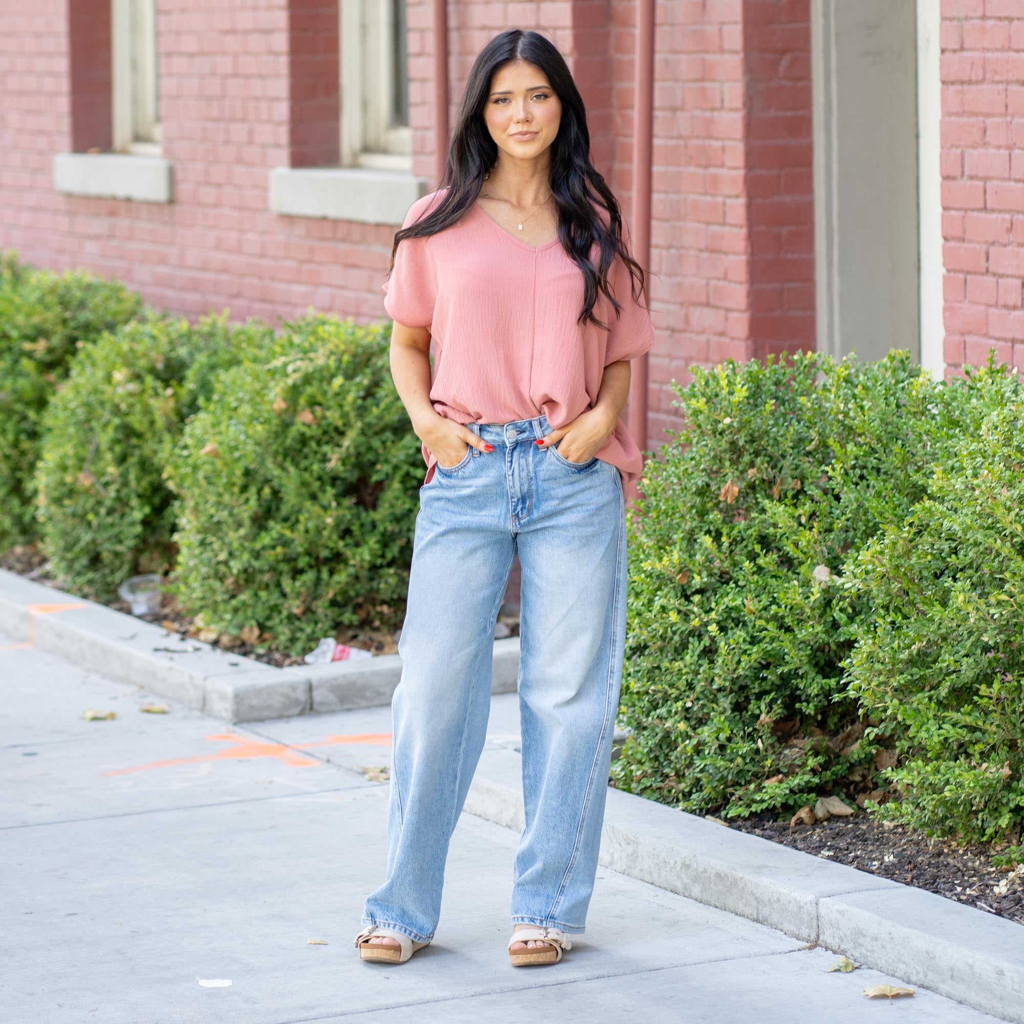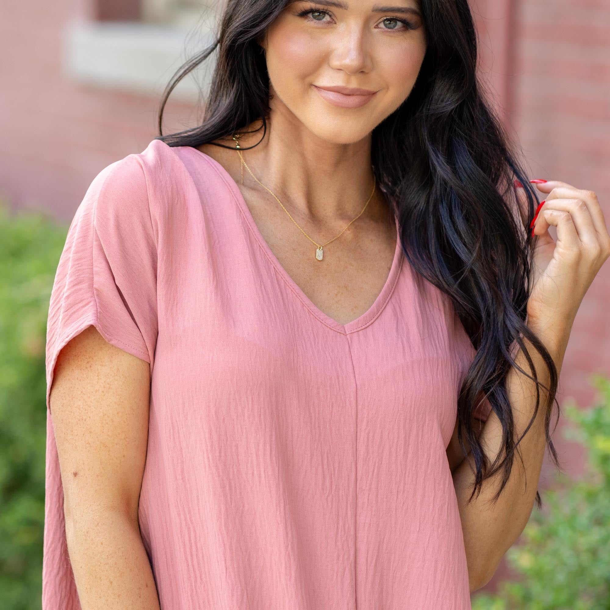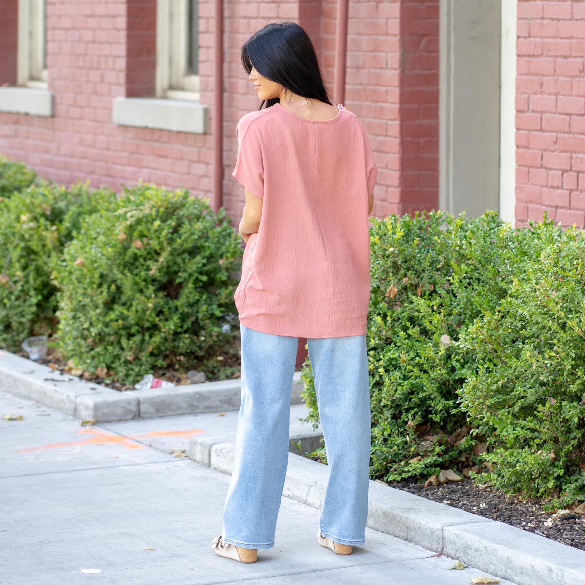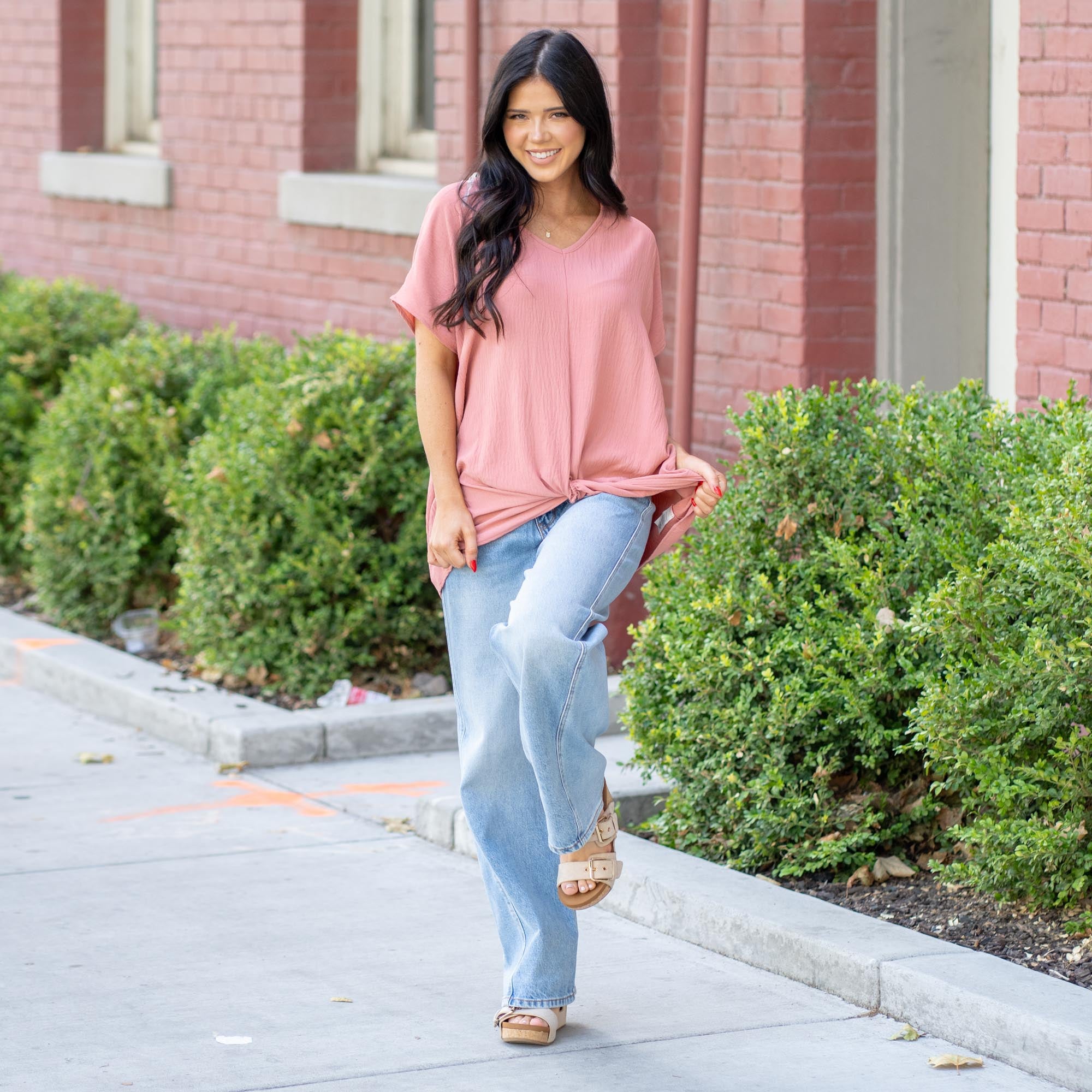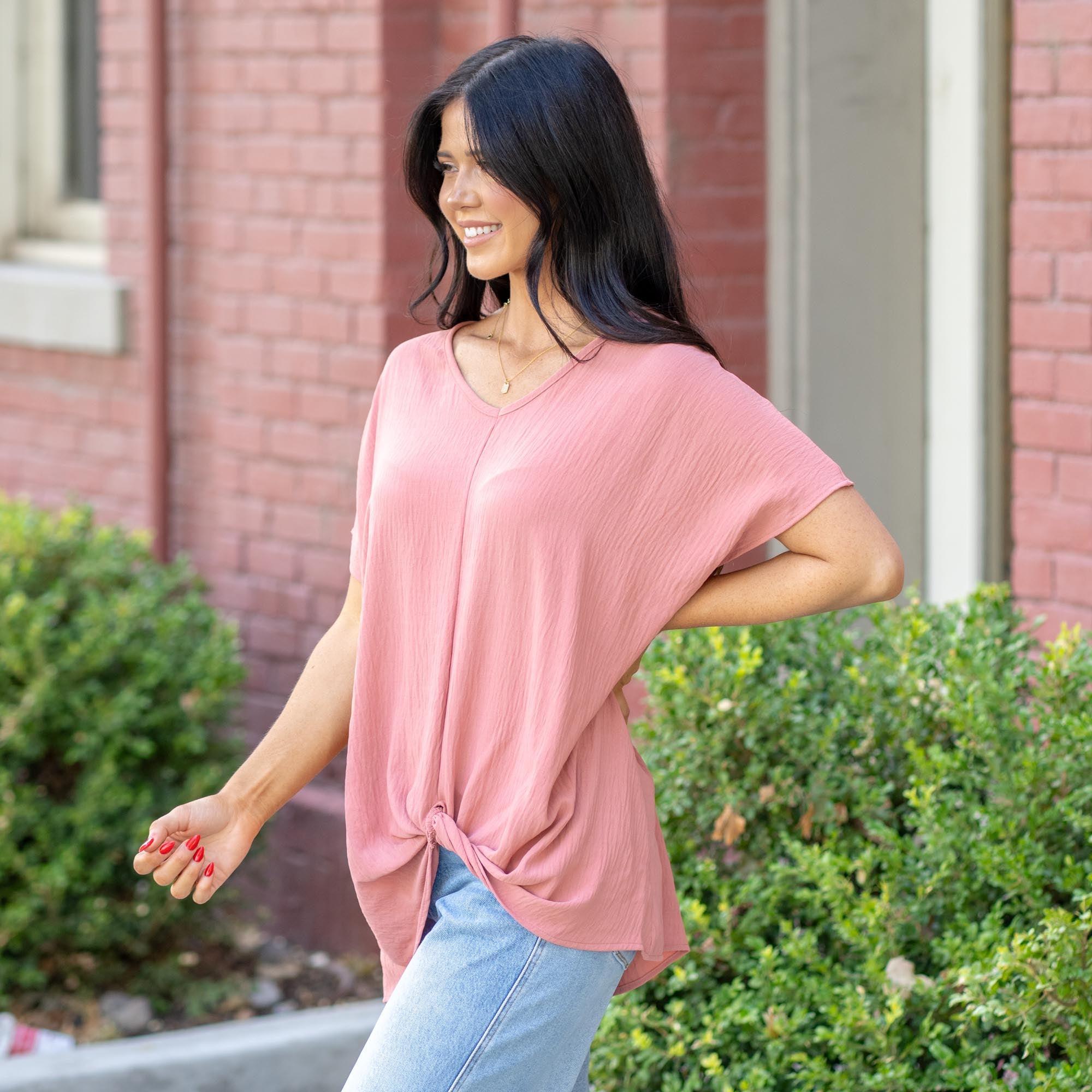 The Sienna Knot Front Dolman Top is the perfect mix of laid-back comfort and polished style. Made from a breathable airflow woven fabric, it feels light and effortless for all-day wear. The V-neckline adds a touch of femininity, while the dolman short sleeves give it a relaxed, drapey silhouette. A front knot detail ties the look together — literally — making it easy to wear with high-rise denim, skirts, or shorts.