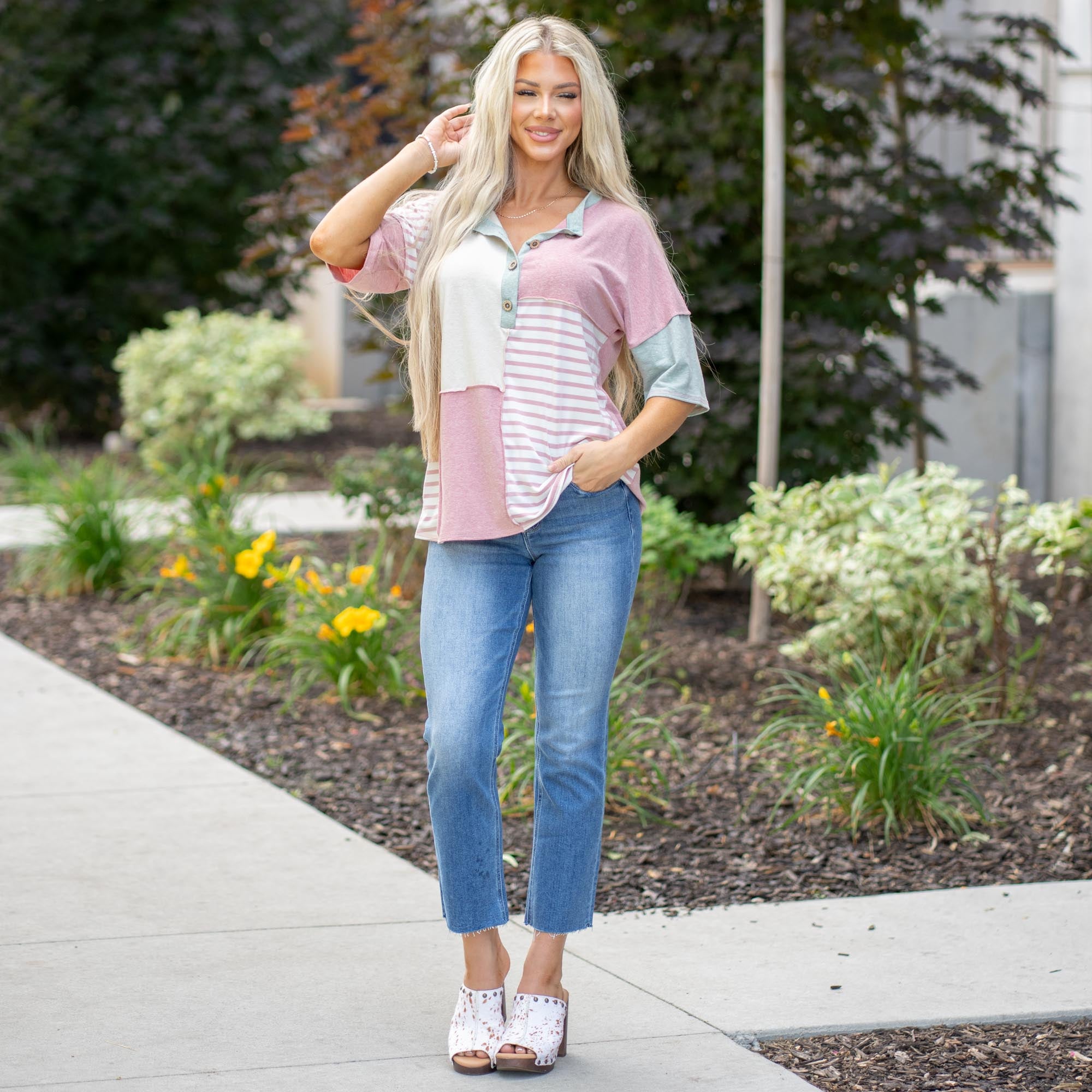 Elevate your casual wardrobe with the Sanity Colorblock Knit Button Top. This relaxed-fit piece features a flattering round neckline and button-down front, accented with a bold colorblock design that combines triblend softness with PR stripe detailing. Unique threading adds a hint of texture, giving this top an artfully undone edge. Whether you're styling it with denim or layering it under a jacket, Sanity brings confident, everyday chic to your closet.