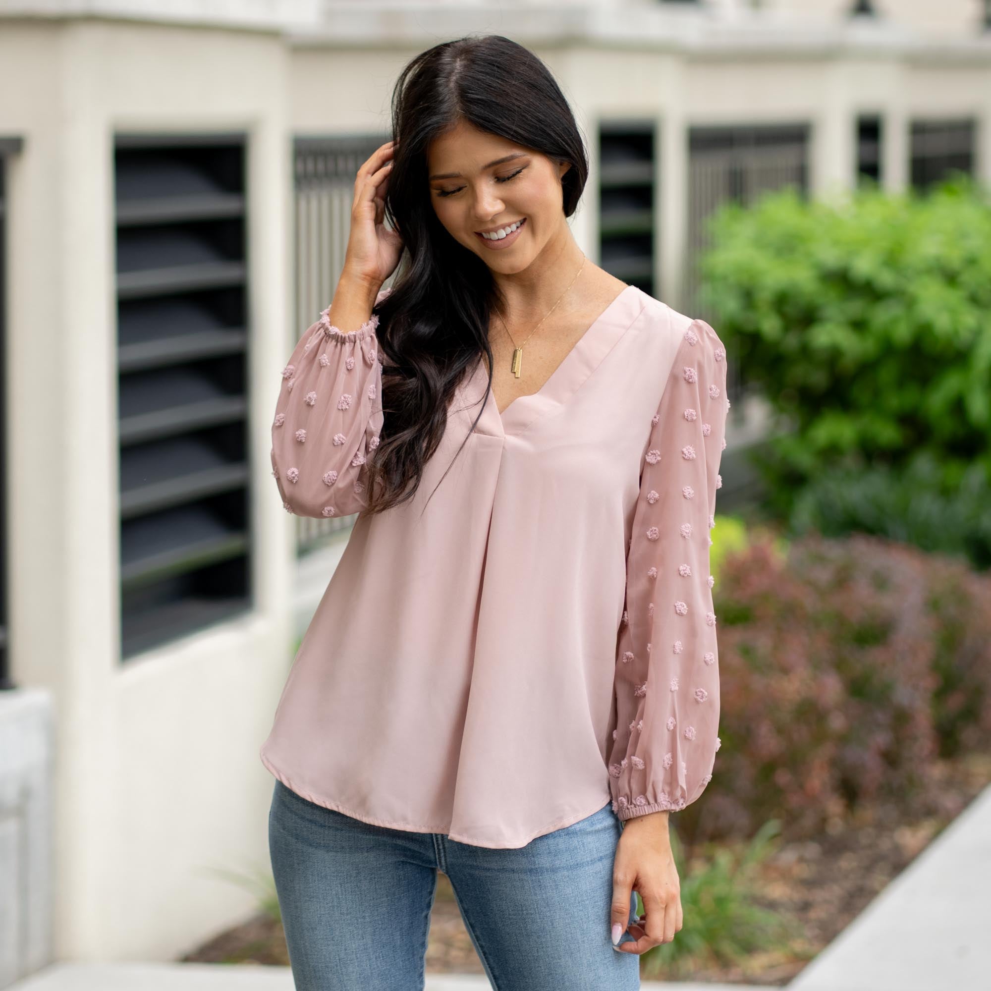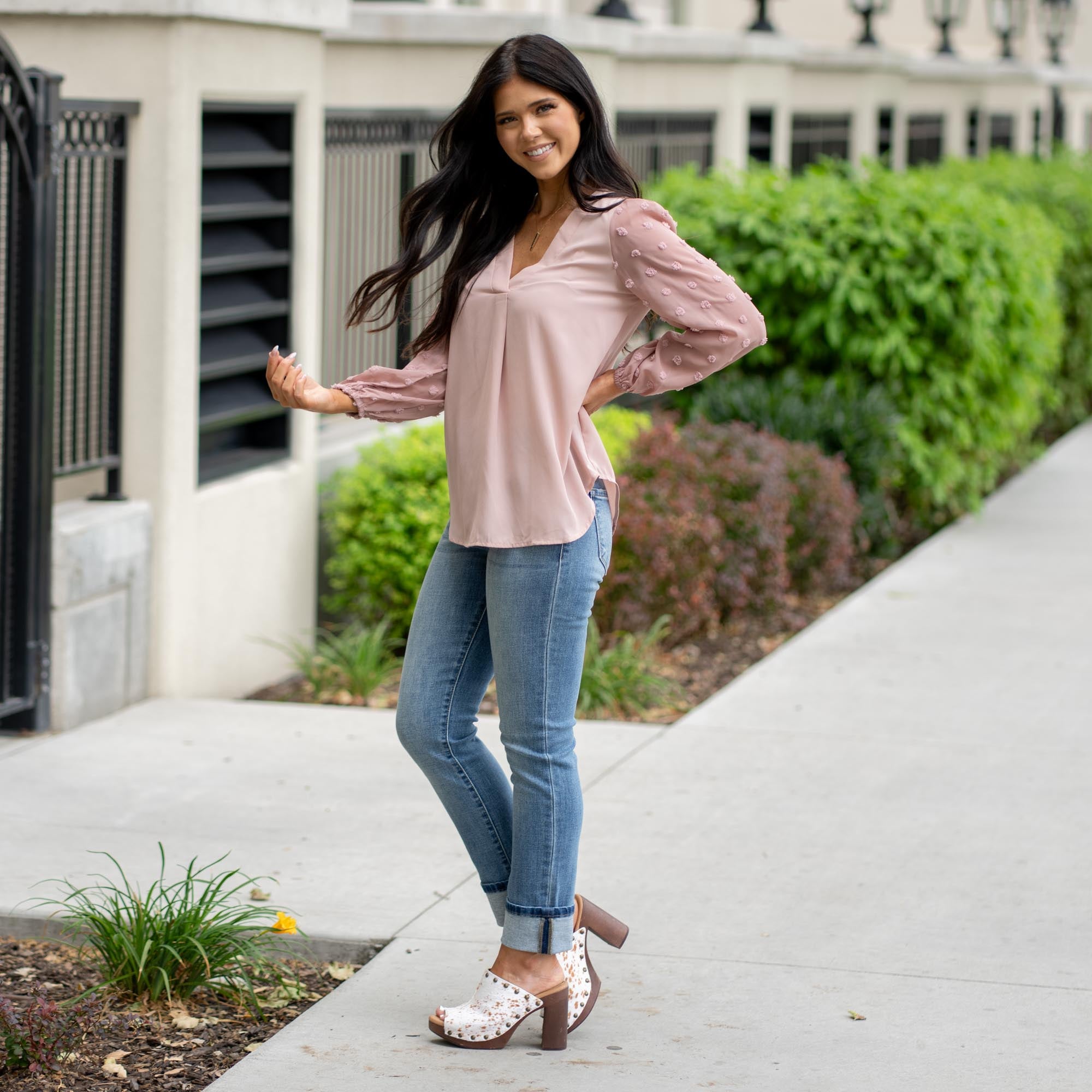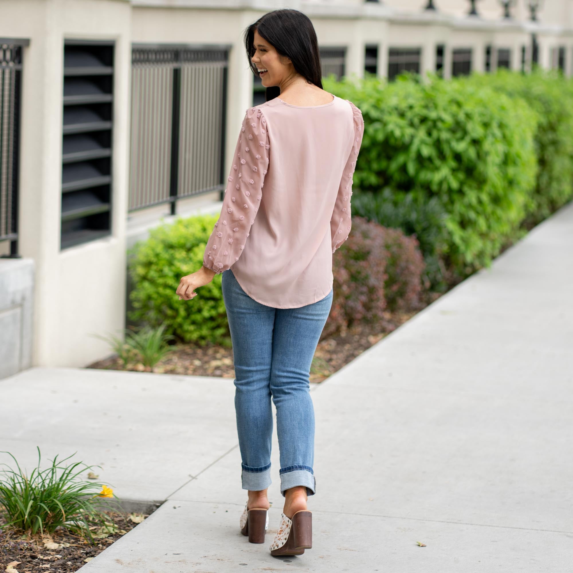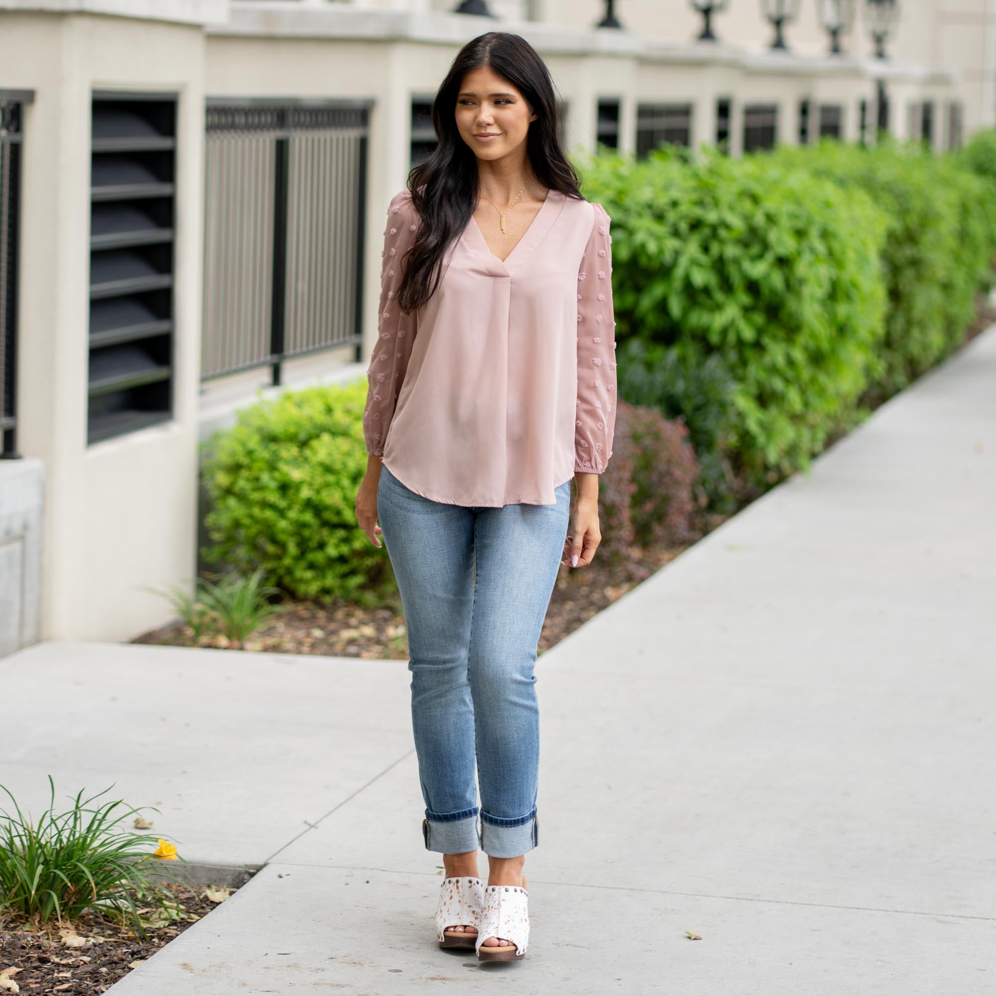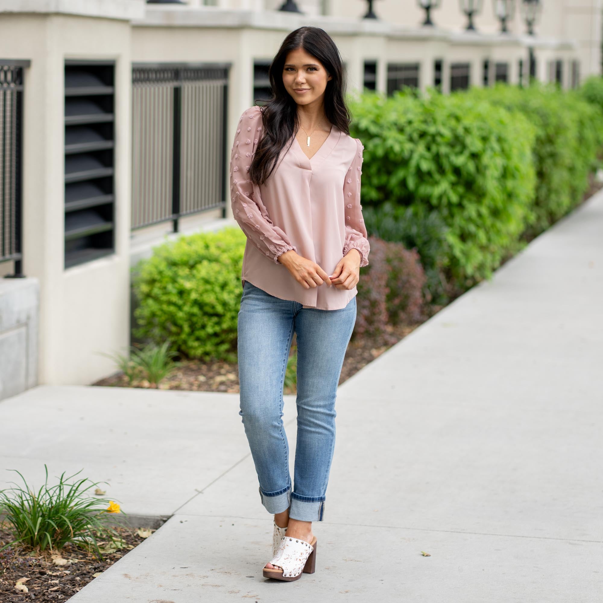 This darling chiffon top features delicately embroidered sleeves that add just the right amount of flair. Light and breezy, it’s perfect for everything from sunny brunches to casual nights out. Let your style speak sweetly in this effortless piece.