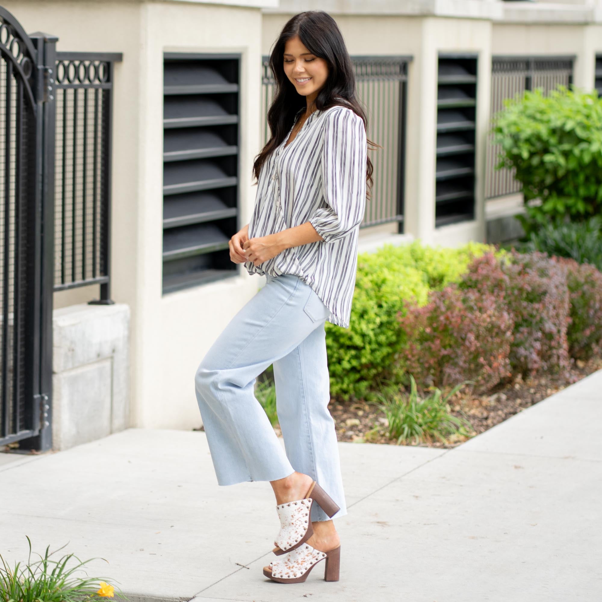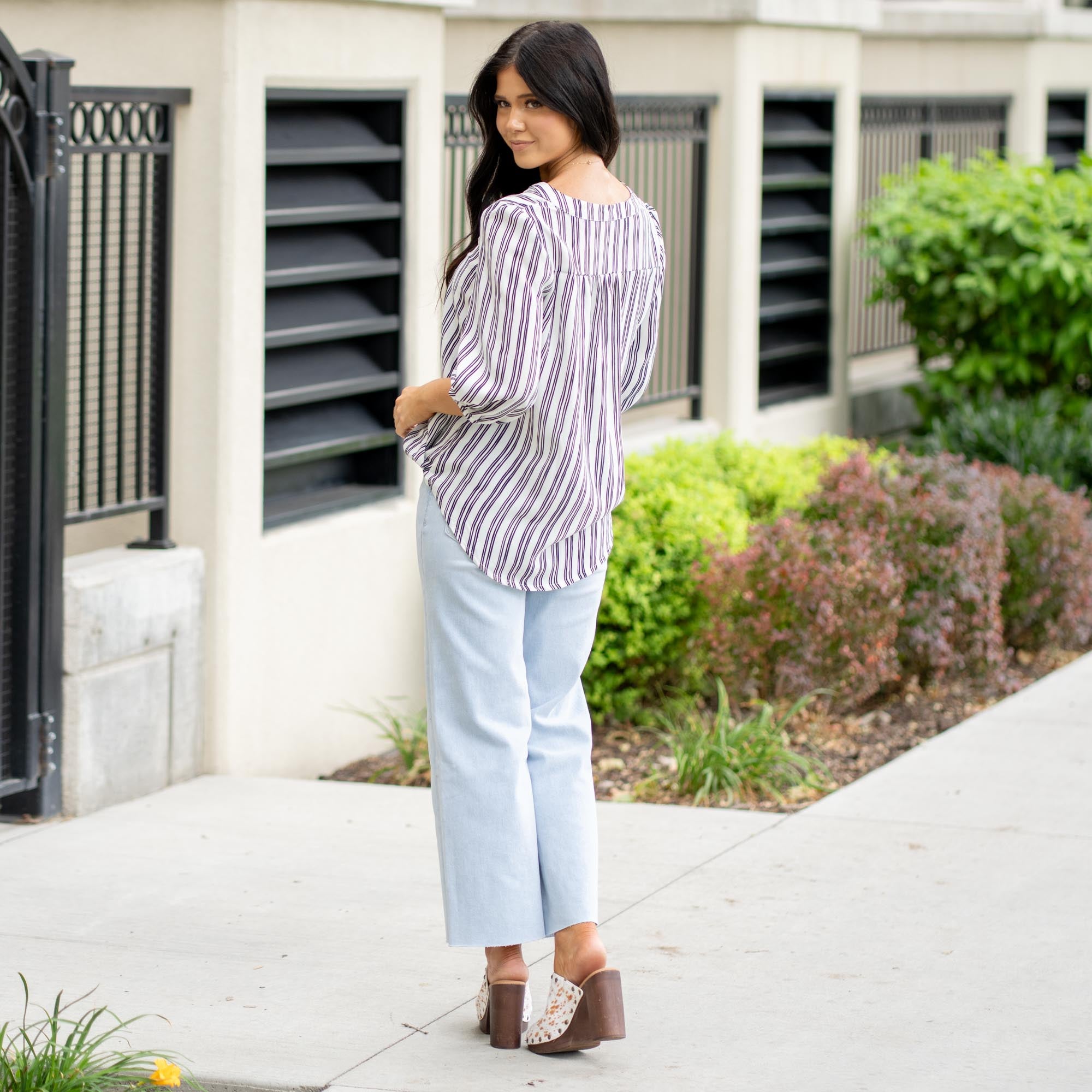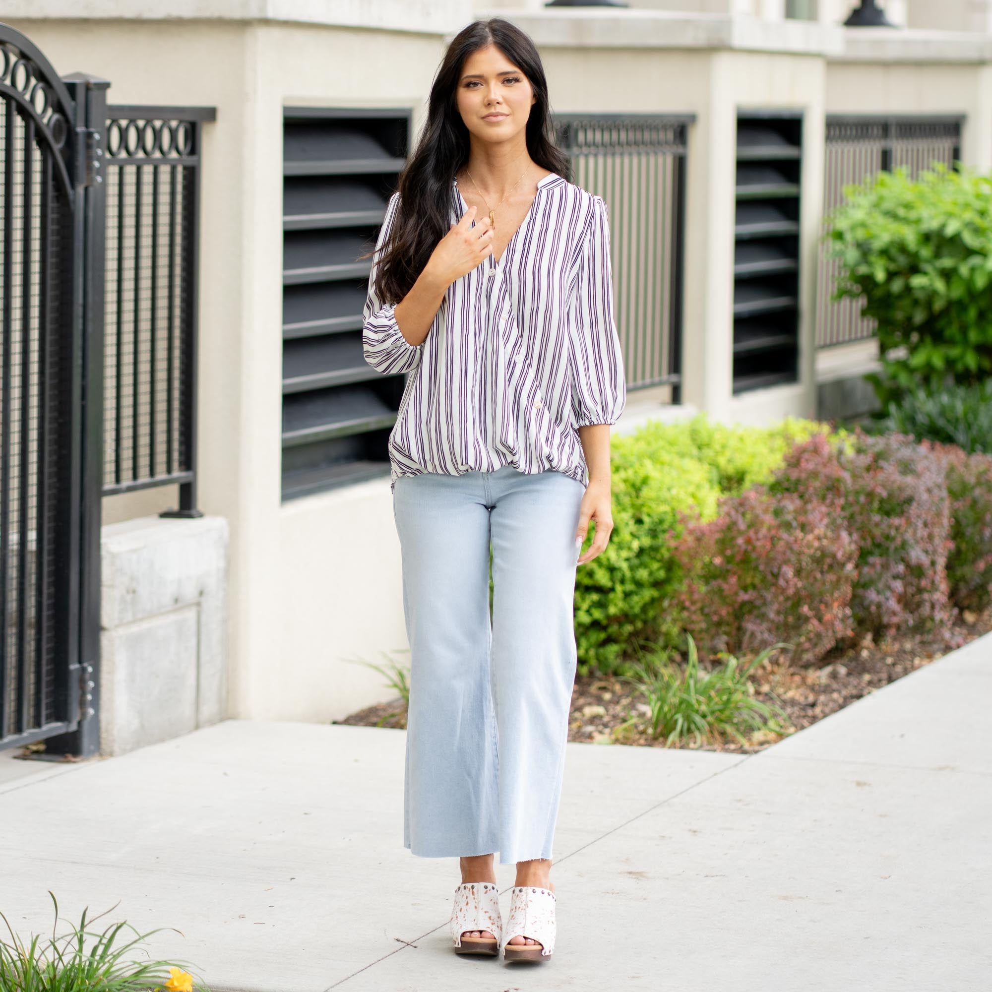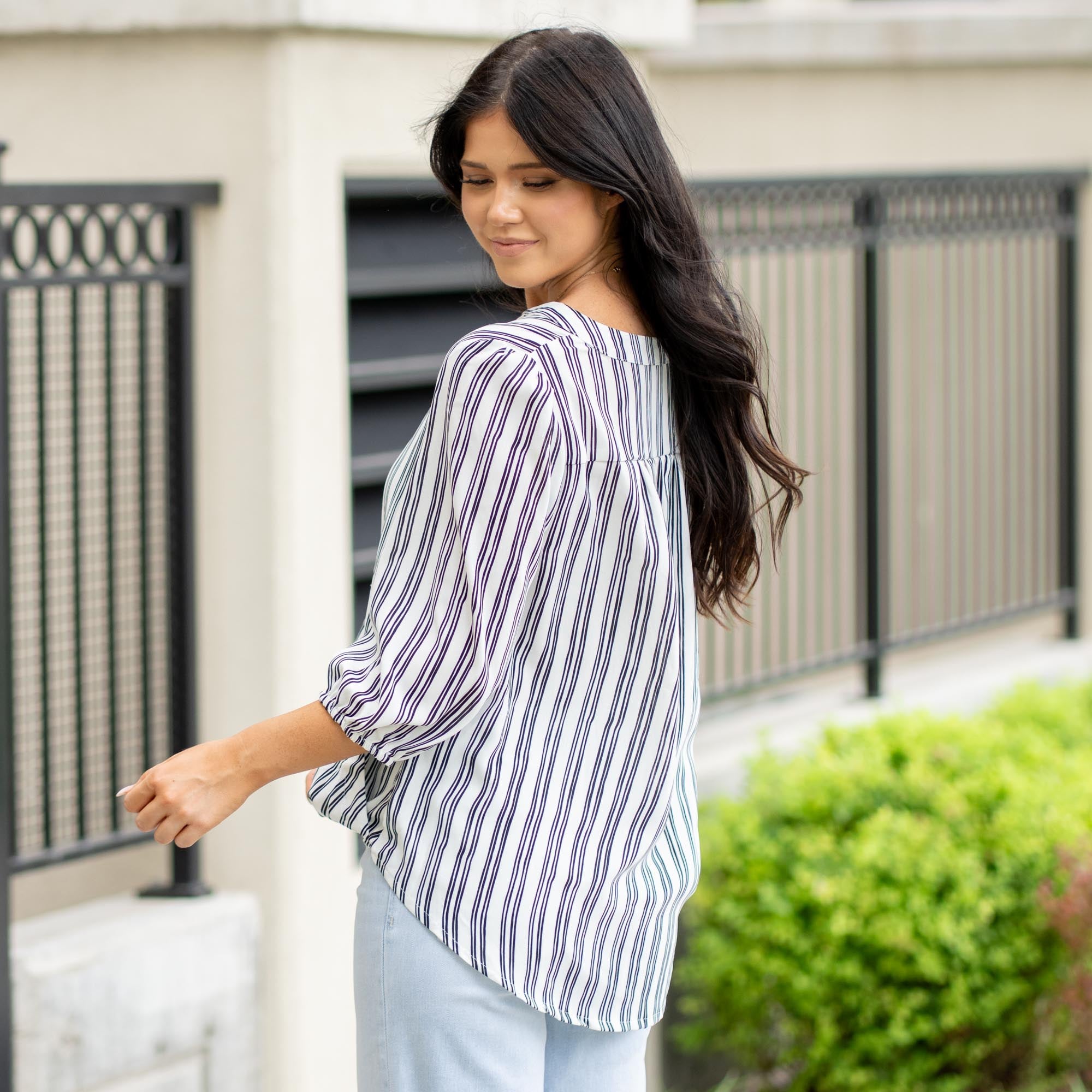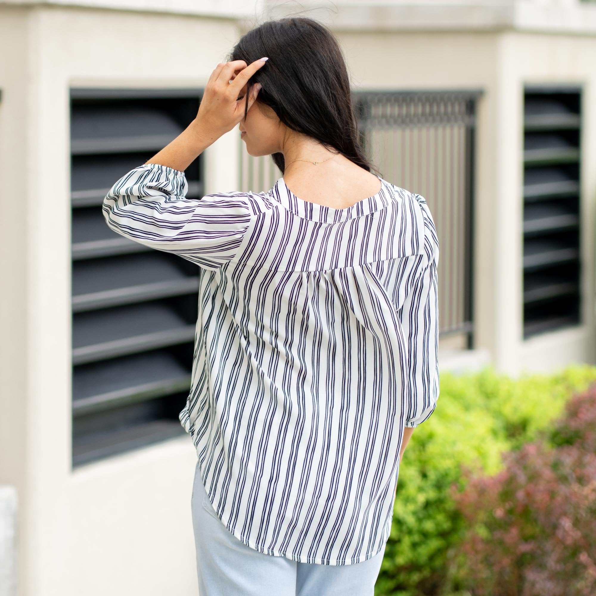 This effortlessly chic Henley-style blouse features a flattering curved high-low hem that moves with you from desk to dinner. The relaxed silhouette and polished details make it the perfect staple to dress up with trousers or down with denim—versatility never looked so good.